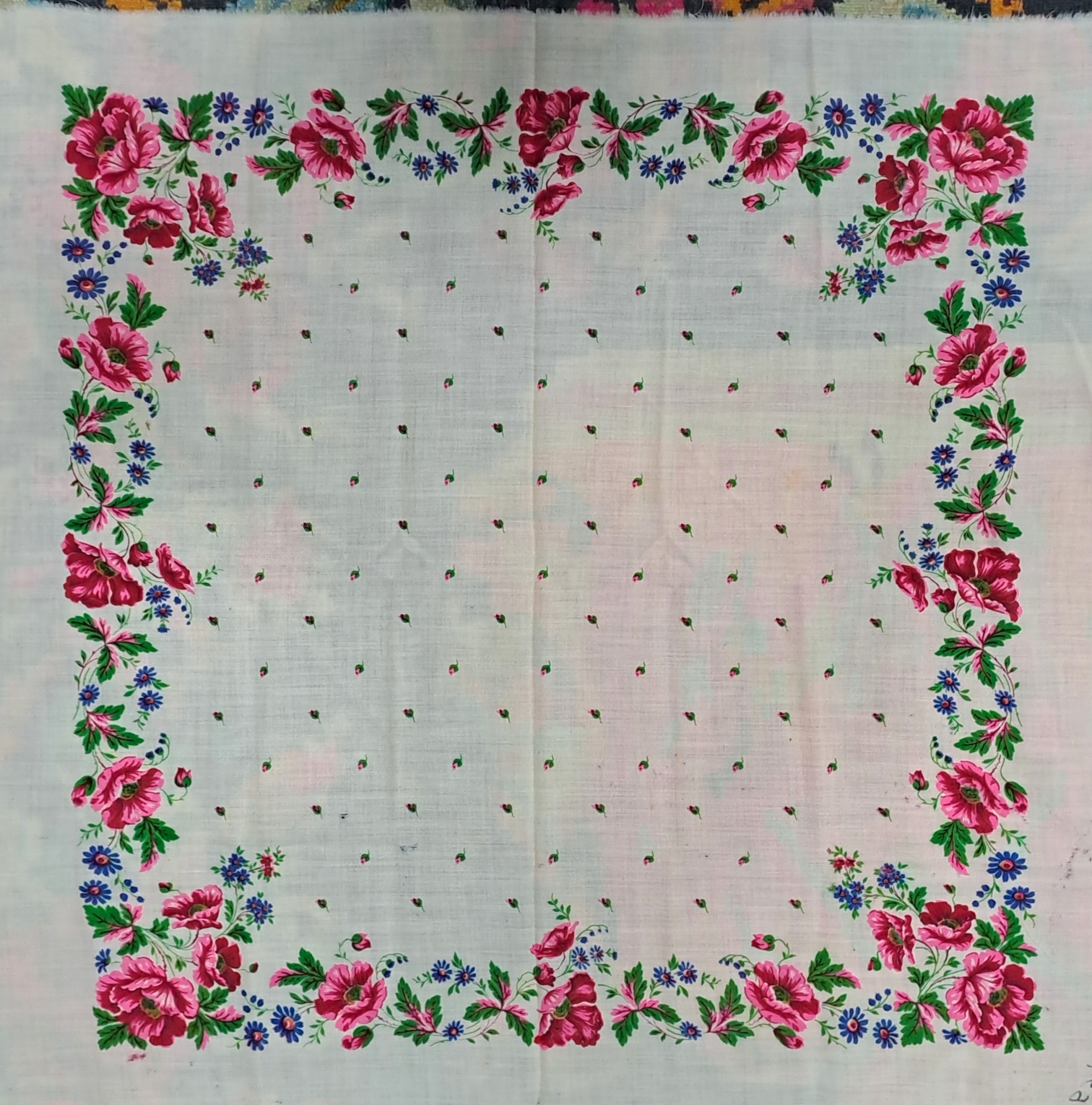 Basma tradițională de formă patrată, țesută din fir de lână. Câmp alb cu decor floral policrom imprimat , compus din ornamente florale dispuse pe toată suprafața. Piesă purtată de femei ca acoperitori de cap, sau ca accesoriu vestimentar.