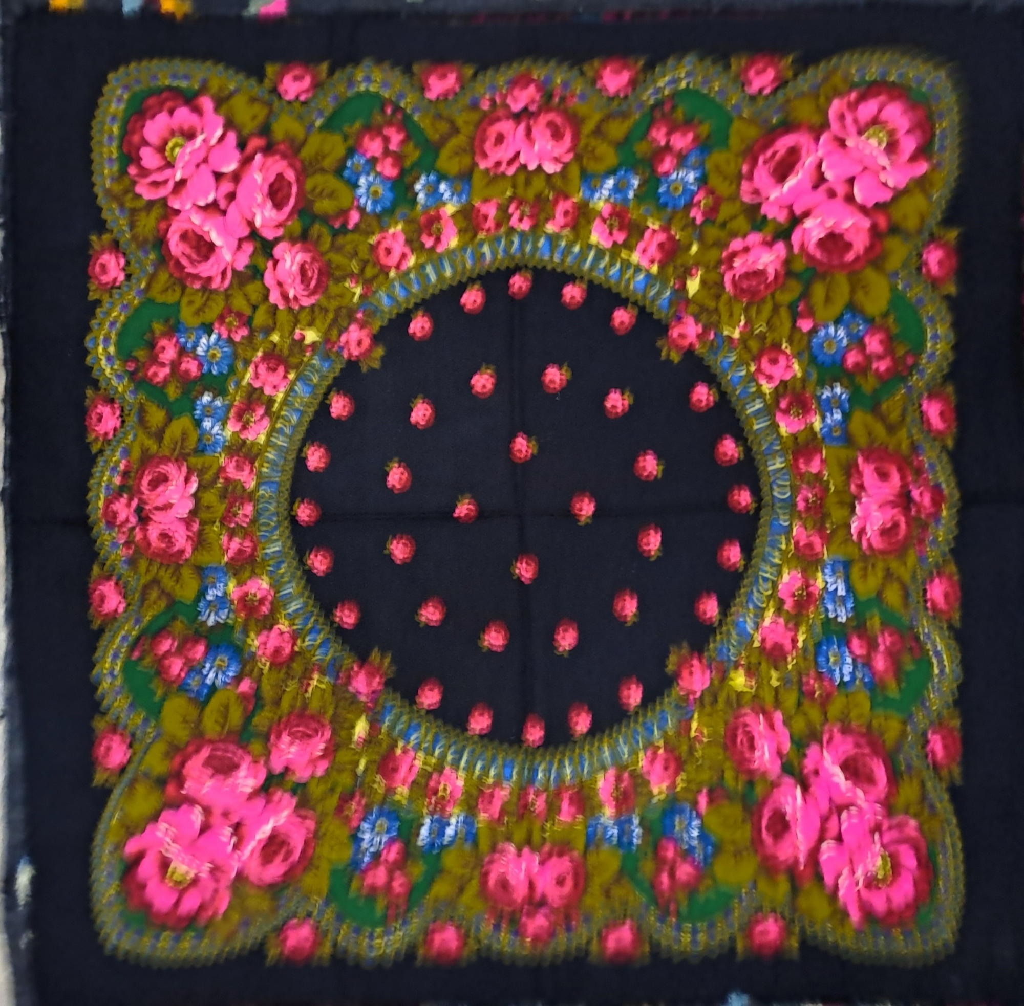Basma tradițională de formă patrată, țesută din fir de lână. Câmp negru cu decor floral policrom imprimat , compus din ornamente florale dispuse pe toată suprafața. Piesă purtată de femei ca acoperitori de cap, sau ca accesoriu vestimentar.