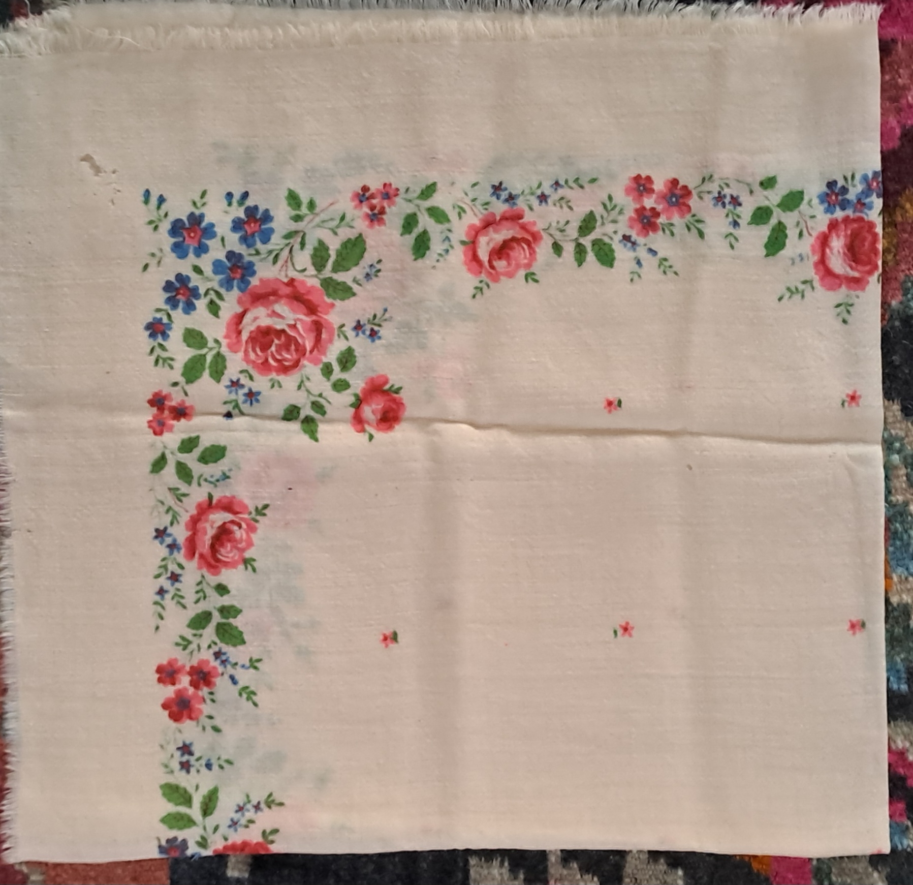 Basma tradițională de formă patrată, țesută din fir de lână. Câmp alb cu decor floral policrom imprimat, compus din ornamente florale. Piesă purtată de femei ca acoperitori de cap, sau ca accesoriu vestimentar.