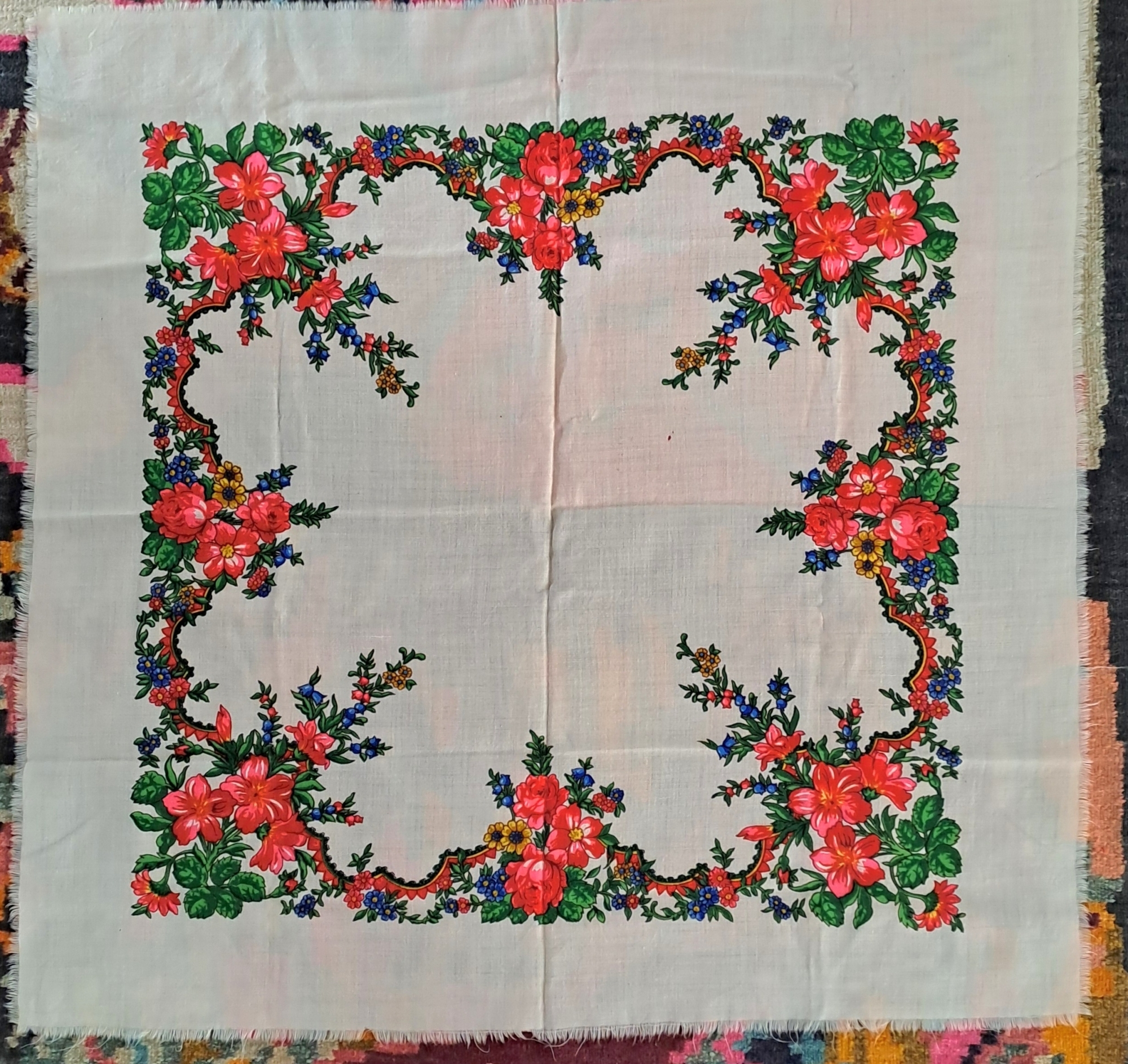 Basma tradițională de formă patrată, țesută din fir de lână. Câmp alb cu decor floral policrom imprimat, compus din ornamente florale. Piesă purtată de femei ca acoperitori de cap, sau ca accesoriu vestimentar.