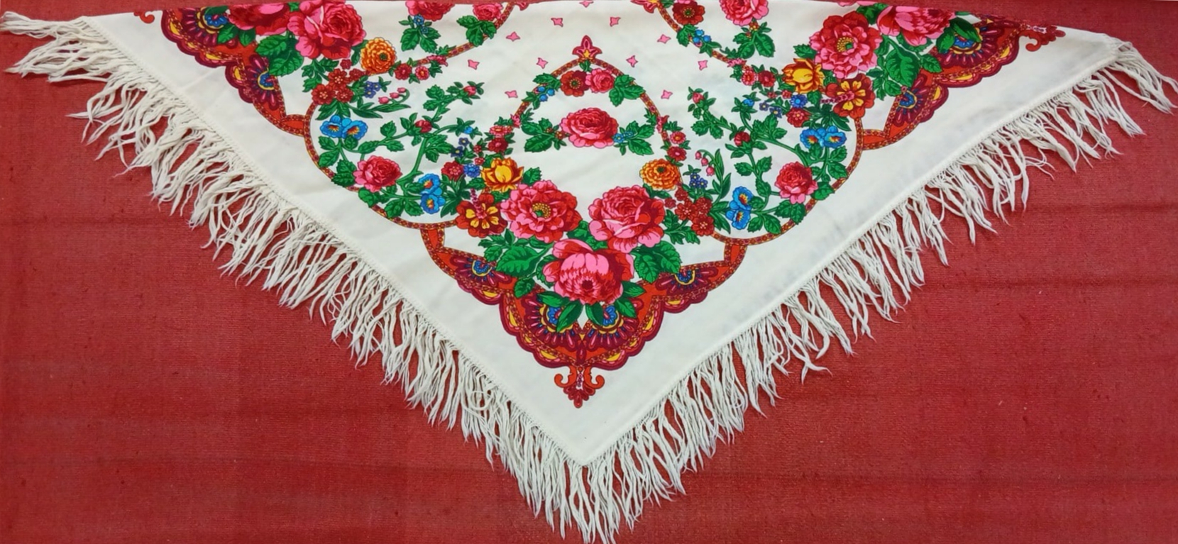 Basmă tradițională pătrată, din material textil fin, cu fond alb, decor floral policrom (trandafiri roșii, roz, flori albastre și galbene), margini ornamentale roșu-bordo și franjuri albe, utilizată ca element al portului popular feminin.