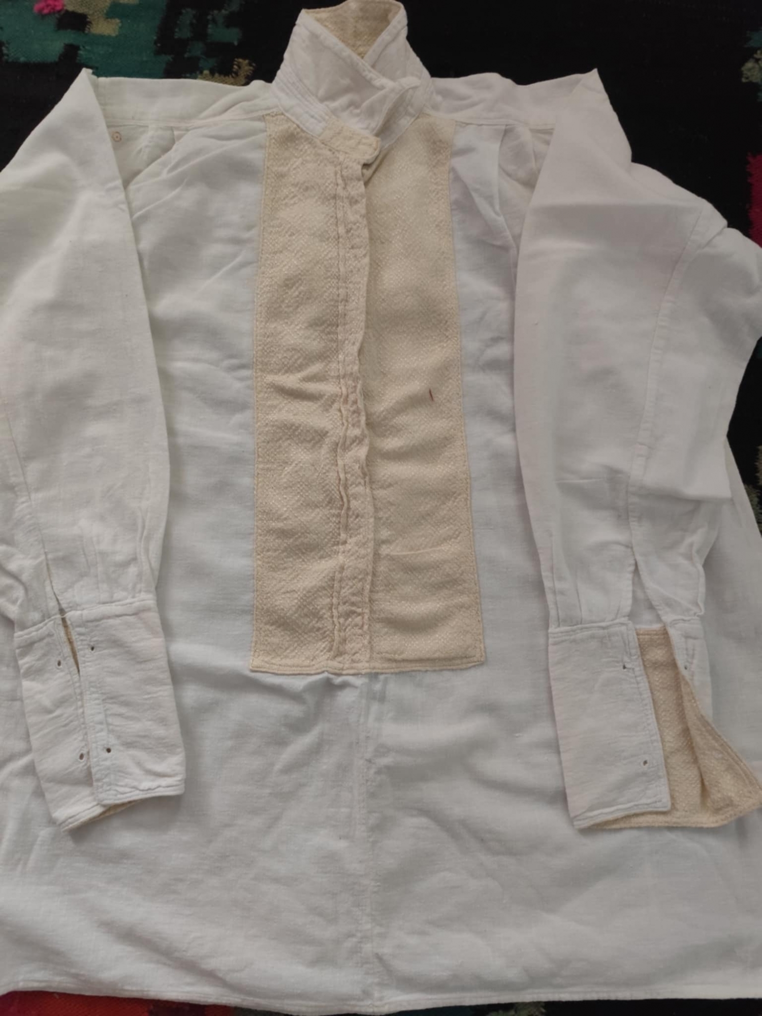 Cămașa pentru bărbați tradițională este cusută manual , de culoare predominantă albă cu o inserție dreptunghiulară de culoare bej deschis în zona pieptului și a gulerului.. Gulerul este înalt, mînecile sunt lungi și se termină cu manșete late simple și este brodată cu bej. În zona pieptului sunt pliuri fine, oferind eleganță iei tradiționale.