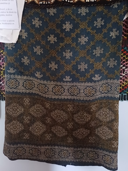 Fotă de formă dreptunghiulară țesută în război în 4 ițe, din bumbac albastru mercerizat (mătăsos); decor ales cu mâna, fir metalic auriu și argintiu; motive geometrice alese cu mâna, în formă de romb, dispuse în chenar lat în față și la poale; capetele fotei sunt ornamentate pe verticală; pe un capăt continuă romburile mari în care central sunt dispuse coarnele berbecului de la varga poalei; pe celălalt capăt sunt trei frize de romburi mici cu laturile prelungite și întretăiate.