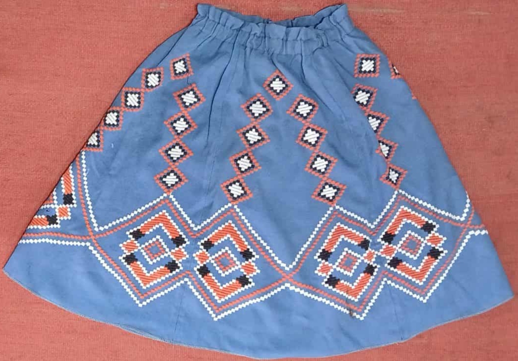 Fustă tradițională (fota), de culoare albastru deschis, decorată cu motive geometrice dispuse în registre orizontale și verticale. Ornamentica este realizată prin broderie manuală în culorile alb, roșu, negru și portocaliu, formând romburi și compoziții specifice portului popular românesc/moldovenesc. Talie elastică, croială cloș sau ușor evazată.