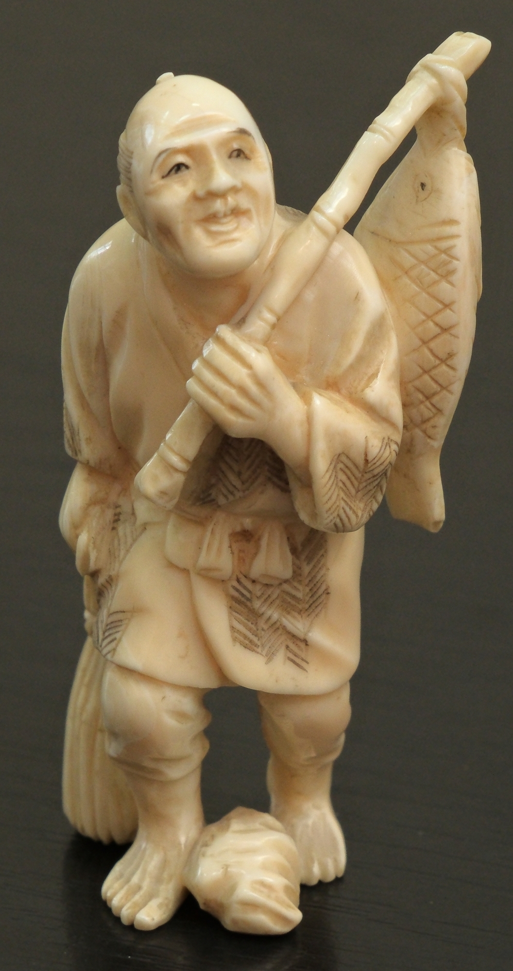 Sculptură miniaturală, lucrată în fildeș, încluzînd detalii lucrate cu minuțiozitate, trăsături distinctive și trăirea personajului. Pescarul îmbrăcat în haine tradiționale, este reprezentat într-o postură dinamică și relaxată, ușor aplecat în față, ținînd într-o mîna un toiag lung, de care este agățat un pește, iar în cealaltă mîna purtînd o desagă, la baza picioarelor se află o piatră cu aspect neregulat ce îi asigură echilibru.