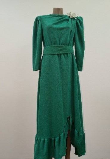 Rochie de concert, lungă, „până în podea”, de culoare verde-strălucitor. Rochia decupată în talie, constă din două părți: corsajul și fusta. Corsajul are un decolteu decupat, cele două jumătăți ale spatelui sunt conectate cu un fermoar ascuns. Mâneci tip felinar cu pernuțe de umăr lucrate manual, se subțiază spre încheietura mâinii. Partea stângă a corsajului este decorată cu un „jug” superior, de care este cusut raftul rochiei, pliat în patru clapete. Această parte a rochiei este decorată cu o dalie artificială din lurex argintiu. Fusta trapezoidală este formată din trei panouri; pe partea stângă a tivului produsului, pe partea din față, există o fantă verticală cu margini rotunjite; tivul este decorat cu un volan lat (17 cm), a cărui margine este finisată cu fir de lurex argintiu. Rochia este completată de un brâu confecționat din materialul principal; doi nasturi și buclele pentru aceștia sunt, de asemenea, acoperite cu material respectiv. Eticheta de firmă este cusută pe interior. Piesa a fost confecționată la comandă. Rochia a aparținut dnei Maldur Natalia, soră medicală la Spitalul Raional Cahul, membră a Corului lucrătorilor medicali în perioada anilor 1980-1990.