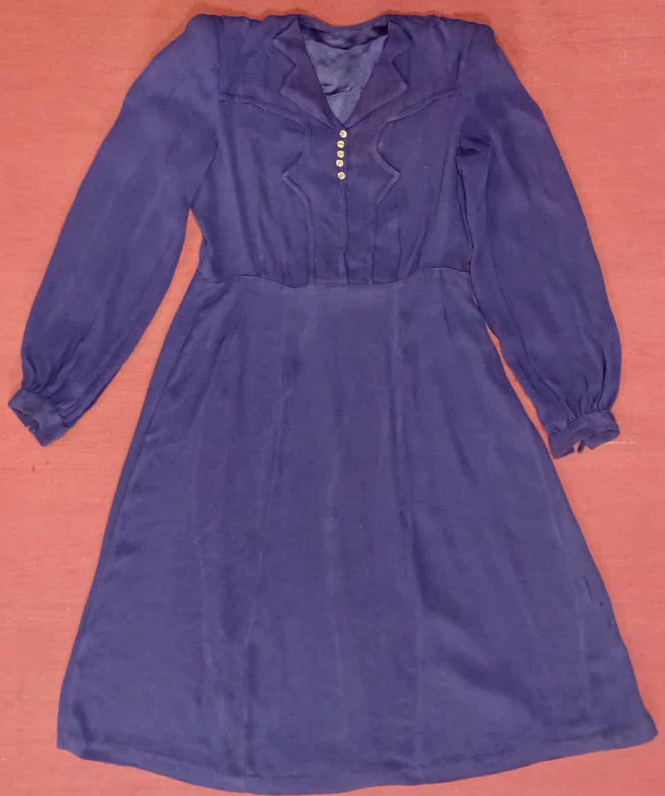 Rochie de damă, de culoare albastru închis, cu mâneci lungi, croială cambrată în talie și fustă evazată. Partea superioară prezintă nasturi ornamentali pe linia pieptului și un guler în formă de rever. Confecționată din material subțire, fin, specific rochiilor de zi din a doua jumătate a secolului XX.