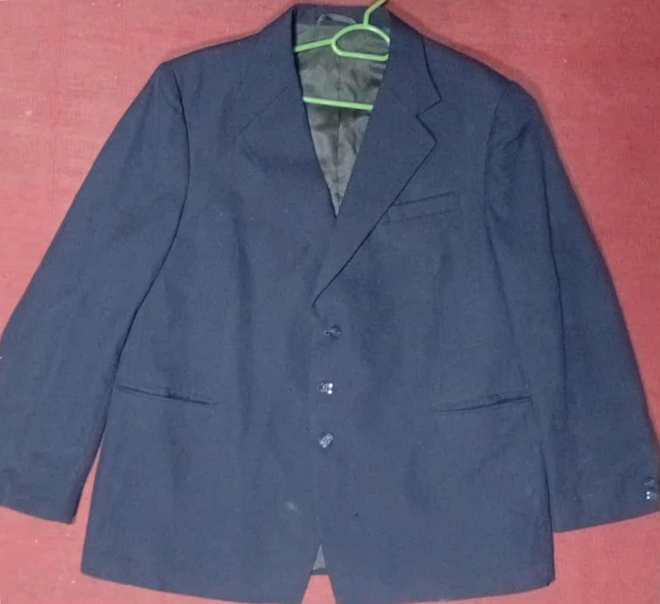 Sacou bărbătesc de culoare închisă, confecționat din stofă, cu trei nasturi pe față, buzunare laterale și căptușeală interioară.