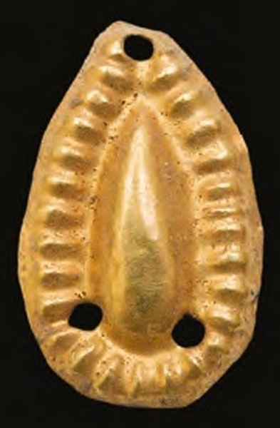 Aplică foliformă, cu mijlocul proeminent. Pe margini aplica este decorată cu pseudo granule. Piesa are două orificii pe capătul mai arcuit și unul pe capătul mai îngust pentru coasere.