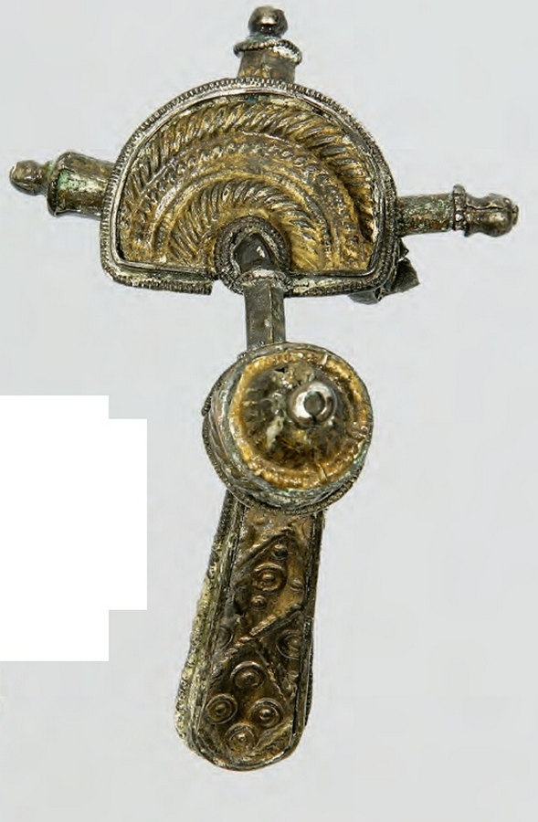 Fibula de tip „monströse” are corpul îndoit brusc, trecând în picioruş cu portagrafa înaltă. Picioruşul este placat cu o foiţă de argint aurită, cu ornament presat constând din romburi în care sunt încadrate pseudo granule. De la corpul fibulei porneşte un ax de care este fixată o rozetă. Resortul fibulei este acoperit pe centru cu un semi disc decorativ, pe margini trece în braţe laterale. Coarda de sus este susţinută de o tijă centrală.