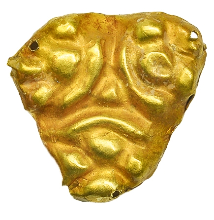 Aplică vestimentară realizată din foaie subțire de aur în tehnica ștanțării. Are formă aproximativ triunghiulară, cu ornament vegetal pe partea din față, în fiecare colț se observă imaginea unei compoziții florale. Toate detaliile sunt executate prin repusare cu un obiect cu capătul oval, formând un grup din 4 cerculețe, umflături dispuse concentric, unde cea din mijloc este mai mare. Aceste compoziții de flori sunt despărțite una de altă prin linii reliefate în semicerc. În centrul aplicei între liniile reliefate se observă de asemenea o umflătură. În fiecare colț este prevăzut câte un orificiu cu ajutorul căruia aplica se prindea, fixa/cosea de haină.