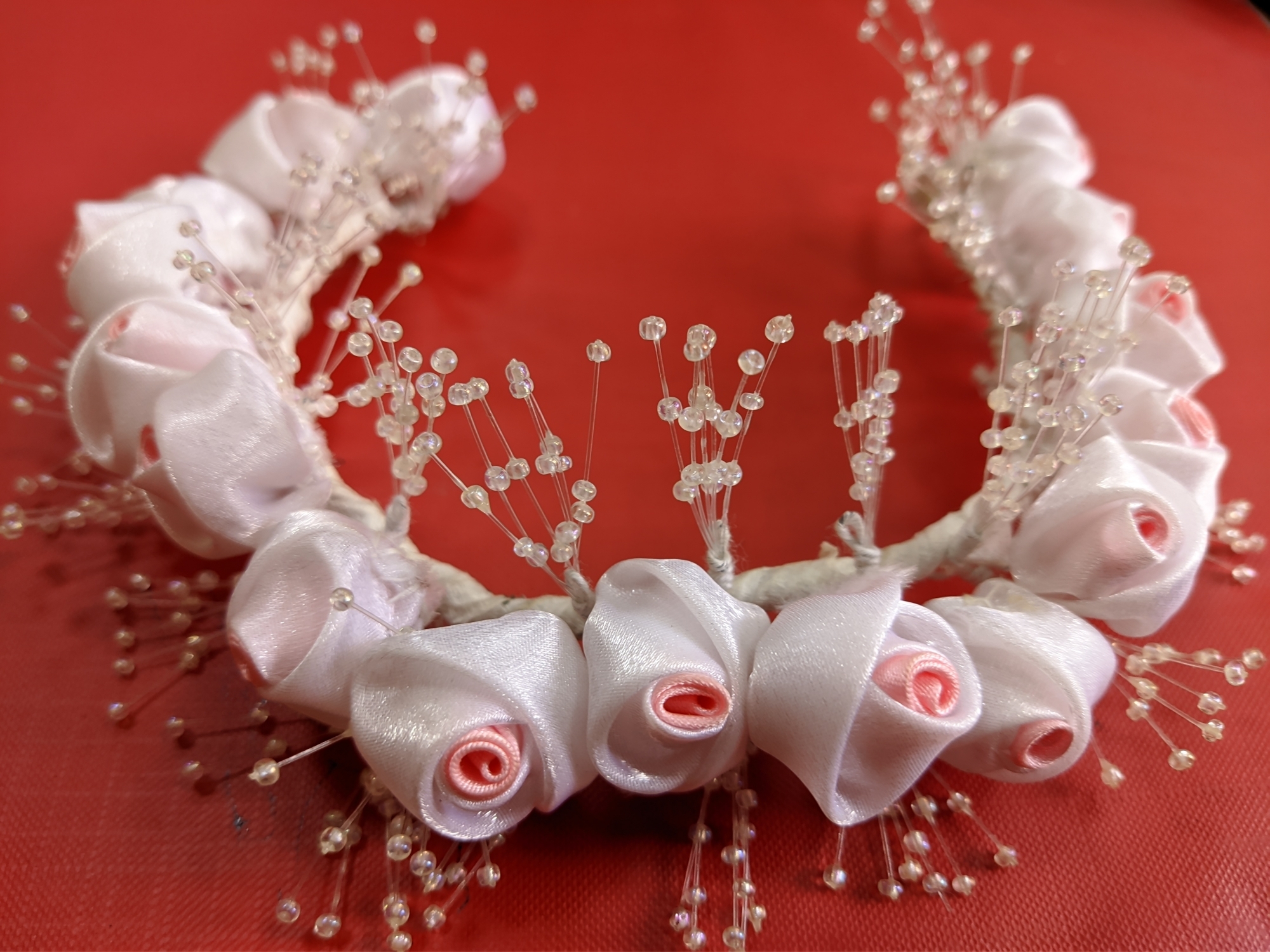Coroniță de mireasă confecționată manual de forma unui semicerc, compusă din 16 flori (butoane de trandafir) de două culori (alb și roz). Florile sunt răsucițe manual de forma unor butoane de trandafir, în mijloc culoarea roz iar pe suprafață alb. Ele sunt prinse cu fir de ață albă, cu sârmulițe și aranjate una lângă alta de baza coroniței. Baza coroniței este din sârmă groasă acoperită (răsucită) cu hârtie subțire de culoarea albă. Printre butoanele de trandafiri, în coroniță sunt prinse crenguțe subțiri din plastic îmbrăcate cu mărgelușe mici.