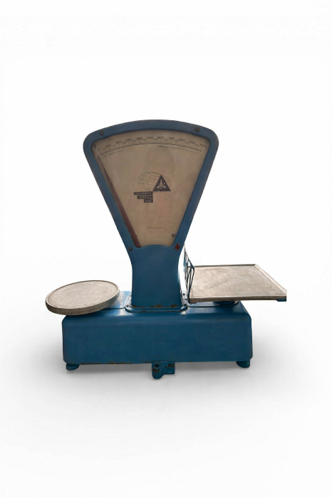 Cântar comercial mecanic cu cadran, balanță semiautomată cu mecanism intern pe bază de pârghie și contragreutate. Carcasa este din fontă turnată, vopsită albastru industrial. Baza dreptunghiulară, cu colțuri rotunjite, are patru piciorușe reglabile și nivelă cu bulă. Cadranul, protejat de geam transparent, are fundal alb din tablă emailată. Gradațiile sunt dispuse radial: scala principală numerotată de la 0 la 1000, cu subdiviziuni și diviziuni fine de 5 grame. Inscripția în limba rusă: „ЦЕНА ДЕЛЕНИЯ 5 ГРАММ. РАЗРЕШАЕТСЯ ВЗВЕШИВАТЬ ОТ 100 Г ДО 15 КГ” (diviziune 5 g; domeniu de cântărire 100 g – 15 kg). Acul indicator este subțire, de culoare roșie. În centrul cadranului se află emblema cu glob și inițialele LFW ale producătorului Lubelskie Fabryki Wag. Sub logo este inscripționat numele complet al fabricii, iar în partea inferioară mențiunea „Made in Poland”. Lateral sunt marcate datele tehnice: „Typ SJ”, seria 7868, anul 1985, marcaj PRL 315 și un simbol cu trei linii verticale în oval. Inscripțiile sunt realizate prin serigrafie, pentru durabilitate în uz comercial. Cadranul este dublu (pentru vânzător și cumpărător), ambele părți având scală gradată și ac indicator. Brațul din dreapta susține talerul pentru marfă (dreptunghiular, din aluminiu), iar cel din stânga talerul pentru greutăți (formă circulară, din aluminiu). Componentele au fost turnate în matrițe și asamblate manual, permițând calibrarea și reparațiile ulterioare.