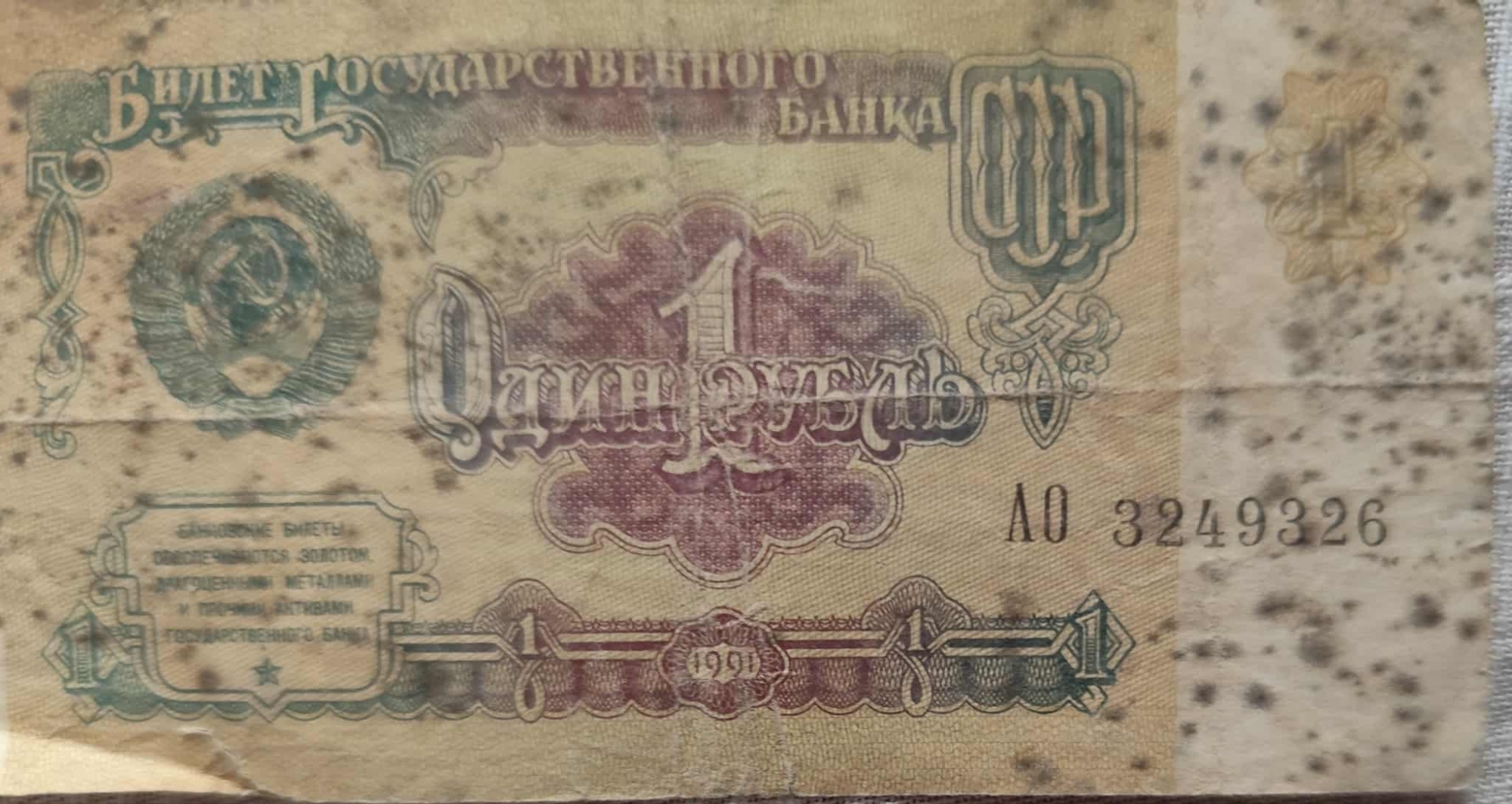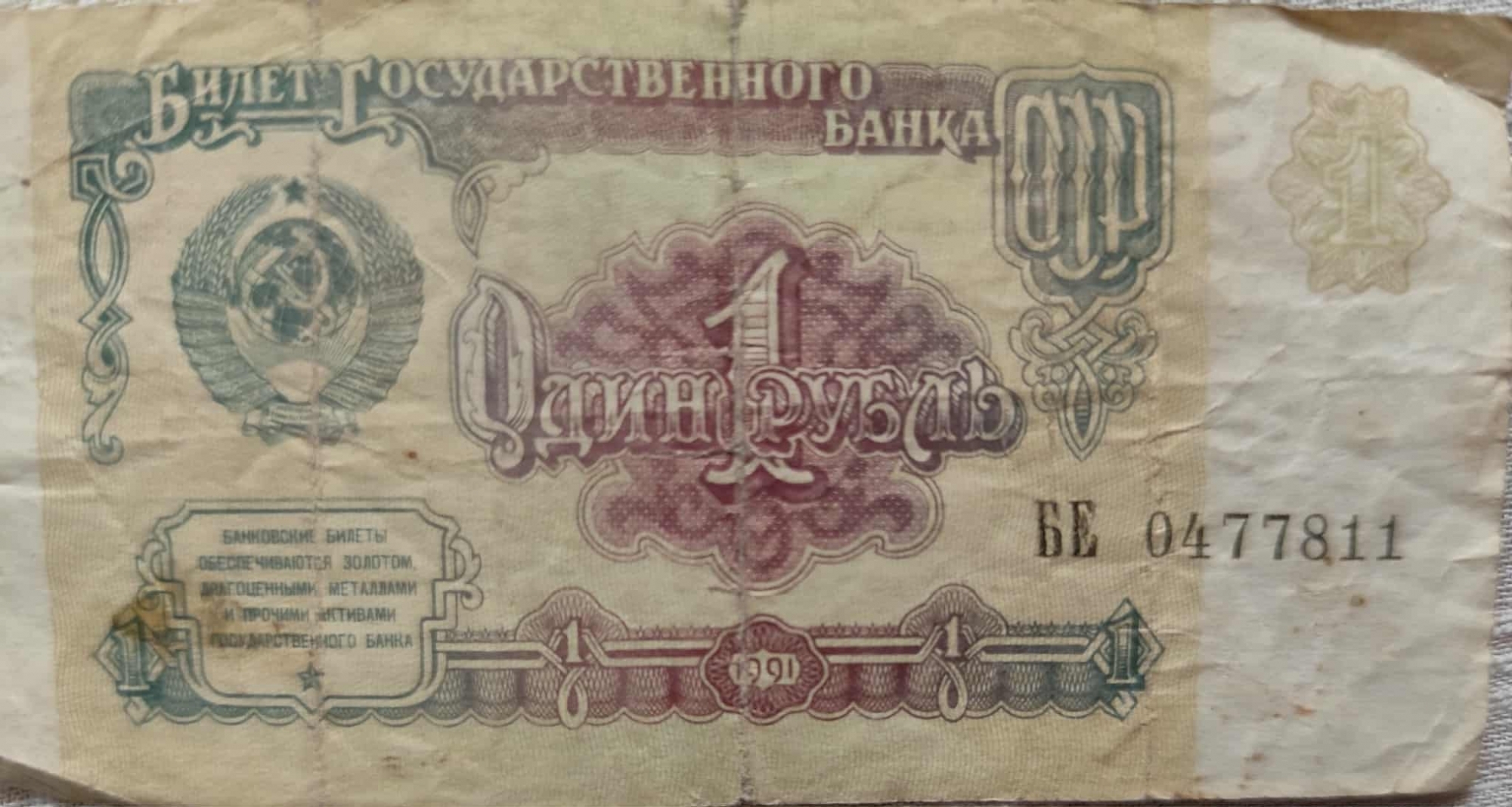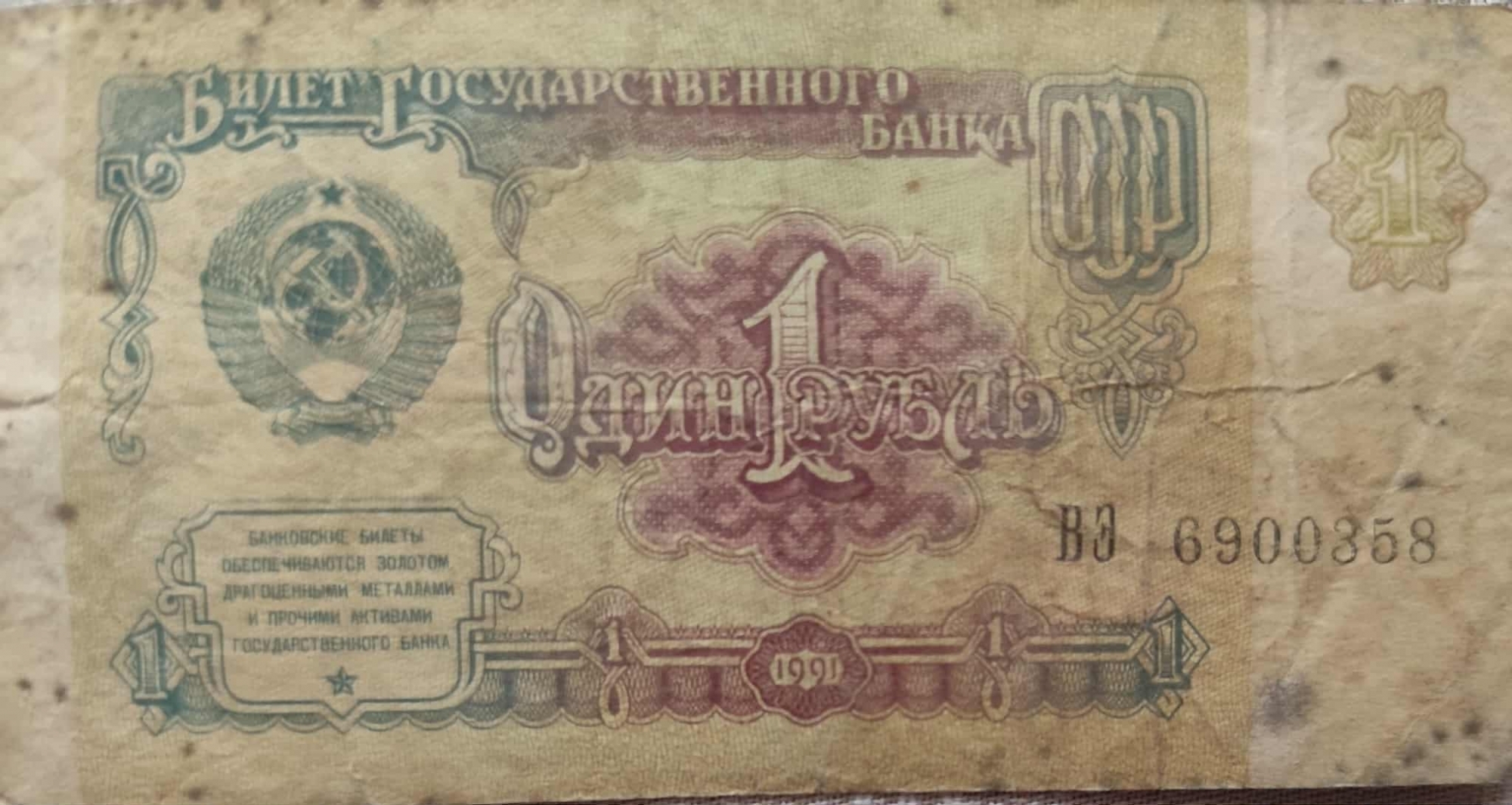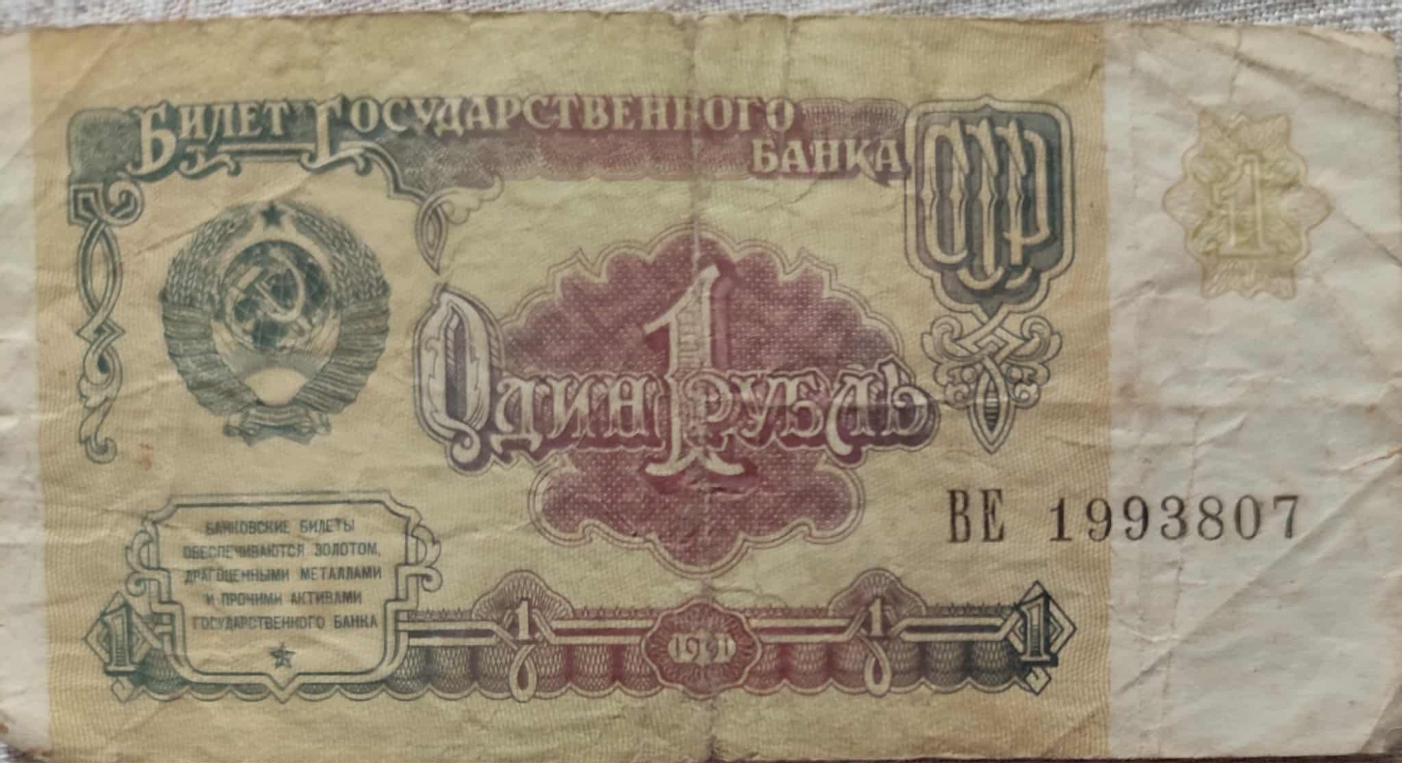 "БАНКОВСКИЕ БИЛЕТЫ ОБЕСПЕЧИВАЮТСЯ ЗОЛОТОМ, ДРАГОЦЕННЫМИ МЕТАЛЛАМИ И ПРОЧИМИ АКТИВАМИ ГОСУДАРСТВЕННОГО БАНКА" (Bancnotele sunt asigurate cu aur, metale prețioase și alte active ale Băncii de Stat). În colțul din dreapta-sus, este o cifră "1" stilizată și mare, încadrată într-un ornament. Cifra "1" mai mică apare și în colțul din stânga-jos. iar în partea dreaptă-jos, sunt vizibile seria și numărul bancnotei: BЭ 6900358, ВЕ 1993807, БЕ 0477811, АО 3249326.