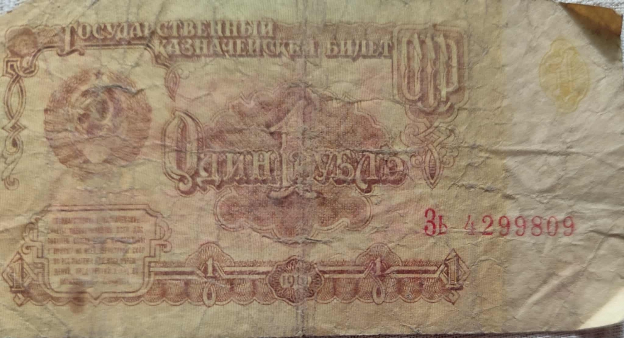 Bancnotă de formă dreptunghiulară cu nominalul de 1 rublă din URSS. Bancnota este predominant în nuanțe de maro-bej și galben, iar pe avers pe partea superioară, în centru se află textul ГОСУДАРСТВУННЫЙ КАЗНАЧЕСКИЙ БИЛЕТ СССР (Bilet al Trezoreriei de Stat a URSS). În partea stîngă, spre mijloc, este vizibilă stema Uniunii Sovietice, cu secera și ciocanul înconjurate de spice de grîu, sub o stea cu cinnci colțuri. Sub temă, într-un chenar se află un text scris cu litere mici în caz se specifică faptul ca această bancnotă poate fi utilizată în toate țările URSS. Valoarea nominală a bancnotei 1 , ОДИН РУБЛИ (O rublă), scros proeminent în centru , iar dedesubt este inddicat anul emitrii 1961. În partea dreaptă de jos este iindicat cu culoare roșie seria și numărul bancnotei СЗ 6987420, Еэ 6086562. În partea de jos a bancnotei ,valoarea 1 este repetată de două ori simetric. Pe revers pe partea superioară în centru este abrevierea CCCP (URSS ) în chirilică. Imediat sub, este scris ОДИН РУБЛЬ ( O RUBLĂ) cu litere mari și stilizate cu culoarea roșie, iar sub acest text este traducerea valorii în toate limbile țărilor din cadrul URSS. Mai jos este un text mic scris în limba rusă care spune că falsificarea biletelor de trezoreriei de stat este pedepsită confomr legii. În colțul din dreapta sus se află cifra 1 într-un cerc , la fel cifra 1 se găsește și în colțul din stînga jos. Pe partea stîngă a bancnotei, într-un chenar dreptunghiular decorativ mare , dominat de dungi roșii și albastre este reprezentată cifra 1. Chenarul este bogat ornamentat cu motive florale și geometrice în partea de jos.