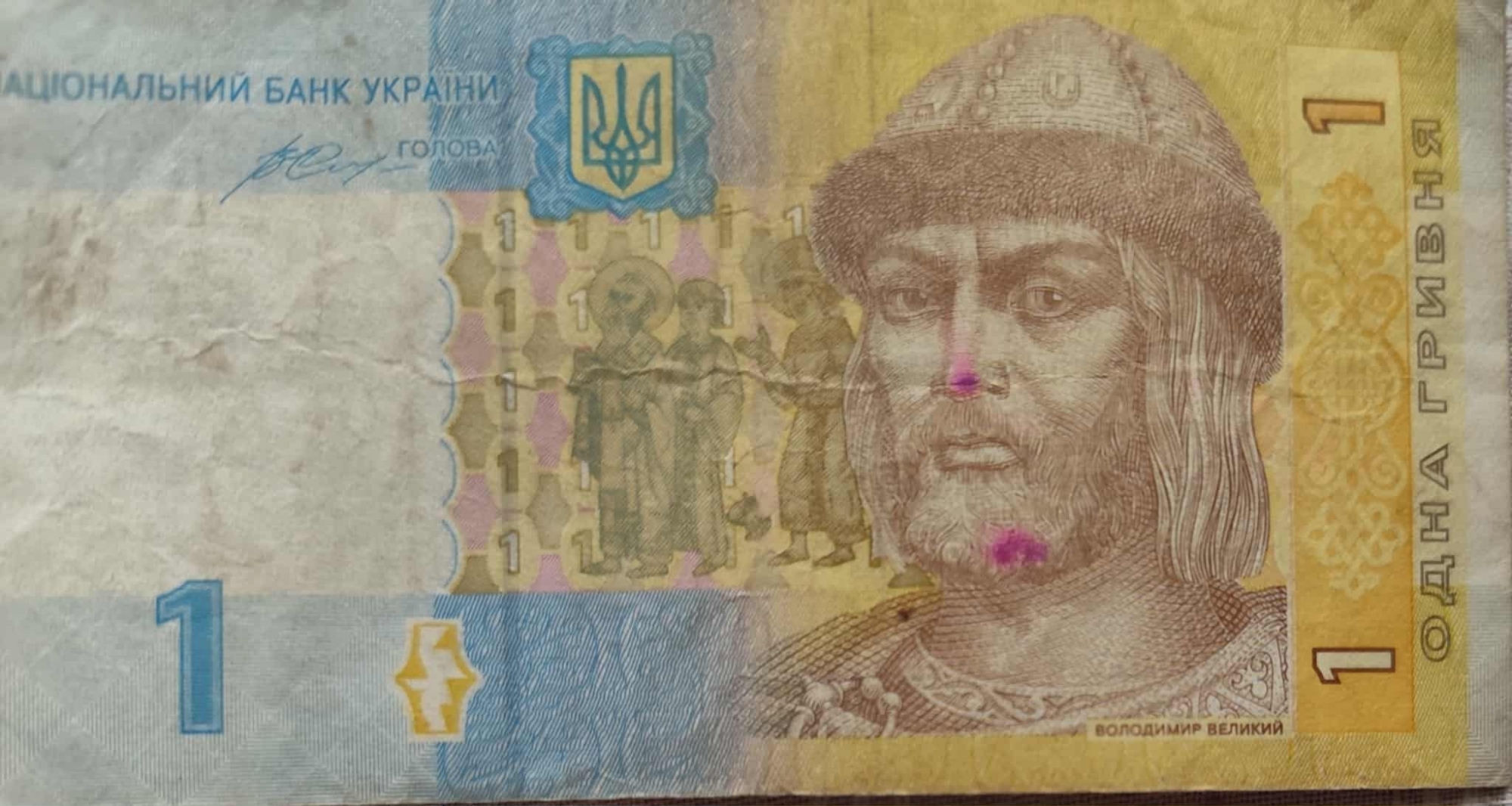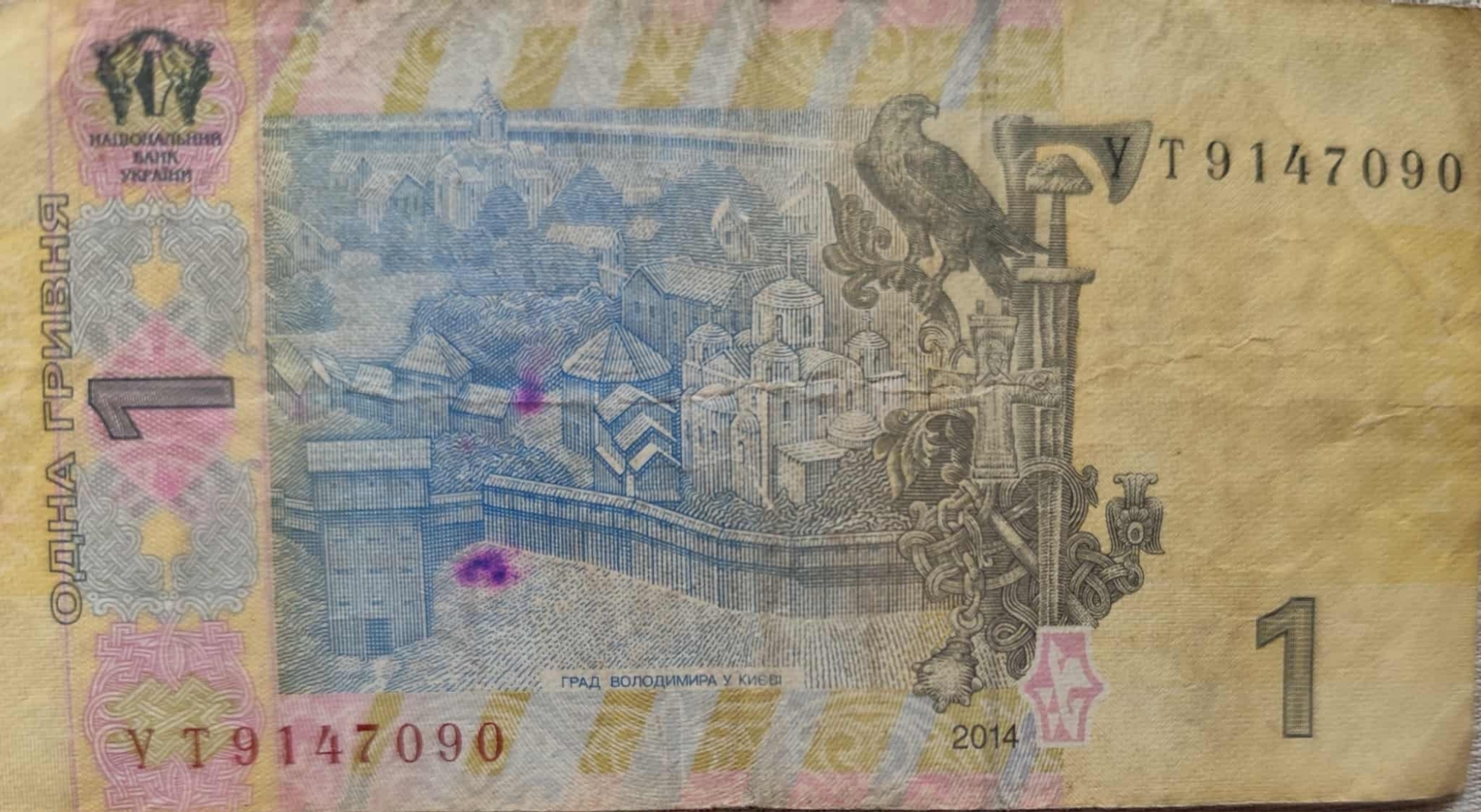 Bancnotă de formă dreptunghiulară cu nominalul de 1 Grivin, din Ucraina. Aversul bancnotei este dominat de un portret istoric , în partea dreaptă fiind ilustrat Volodîmîr cel Mare (în ucraineană: Володимир Великий / Volodymyr Velykyi), Cneaz al Kievului care a creștinat Rusia Kieveană în anul 988. Este înfățișat purtând o căciulă sau coif. Sub portret se află inscripția ВОЛОДИМИР ВЕЛИКИЙ. Valoarea Nominală este indicată prin cifra "1", în colțul din stânga jos, iar cu litere este scrisă pe verticală, în partea dreaptă: ОДНА ГРИВНЯ (O singură Grivnă). În partea de sus, este inscripționat НАЦІОНАЛЬНИЙ БАНК УКРАЇНИ (Banca Națională a Ucrainei). În centru-sus este imprimată stema Ucrainei (Tridentul - Tryzub), iar lângă stemă, în stânga, se află semnătura ГОЛОВА (Guvernator/Președinte). În spatele portretului și a spațiului liber din stânga se observă un fundal de desene și figuri, inclusiv o imagine a unor sfinți sau persoane istorice (așezate în rând, asociate cu activitatea lui Volodîmîr). Reversul bancnotei prezintă un motiv arhitectural și continuă cu elemente de valoare nominală și identificare, precum o ilustrație centrală ce reprezintă Cetatea lui Volodîmîr din Kiev (ГРАД ВОЛОДИМИРА У КИЄВІ / Hrad Volodîmîra u Kîievi), o vedere stilizată a orașului vechi, cu ziduri, turnuri și biserici. În partea dreaptă sus a ilustrației se află un șoim așezat pe un ornament elaborat, care pare a fi un element de design și securitate. În partea dreaptă-jos, sub simbolul șoimului, este inscripționat anul emiterii- 2014. Cifra mare "1" se află în colțul din dreapta jos, dar este scrisă și pe verticală, în stânga: ОДНА ГРИВНЯ. Cifra stilizată "1" se repetă și în partea stângă-sus. Seria și numărul bancnotei sunt tipărite în două locuri: pe orizontală, jos, în stânga: VT 9147090 și pe verticală, sus, în dreapta: YT 9147090.