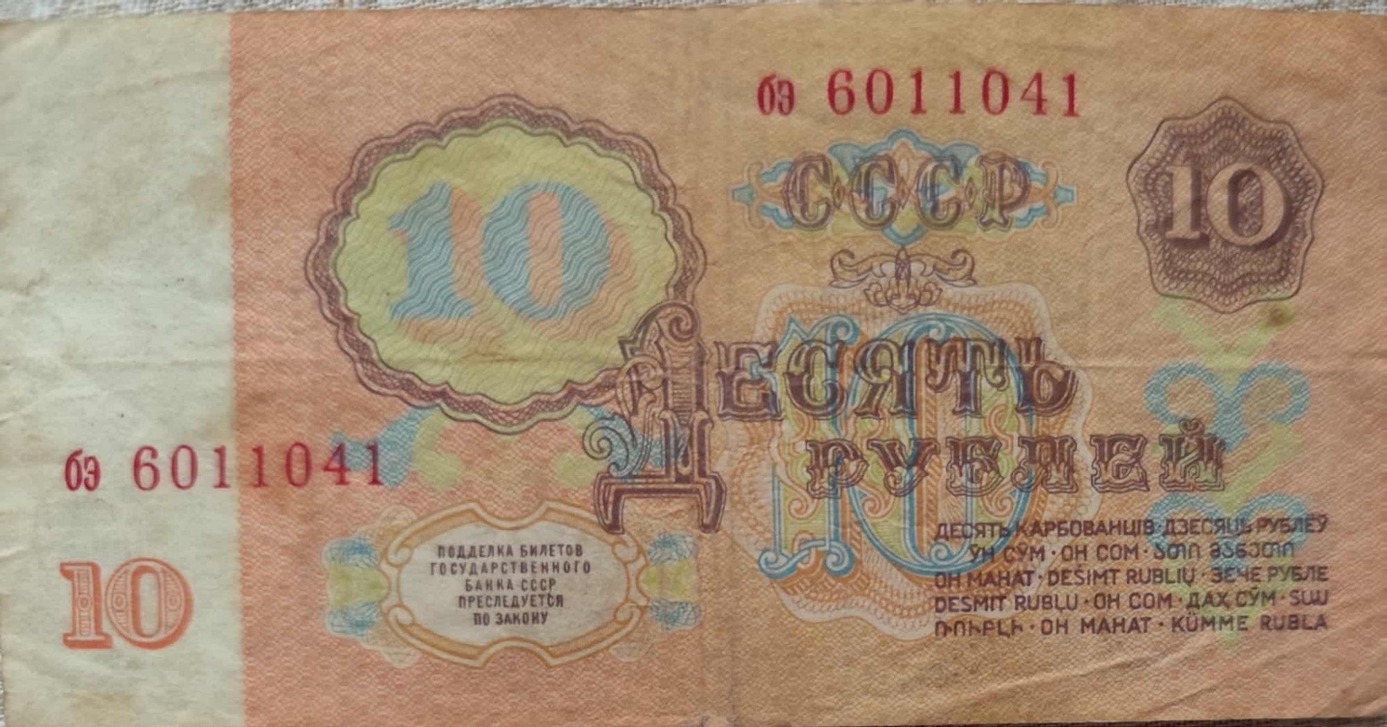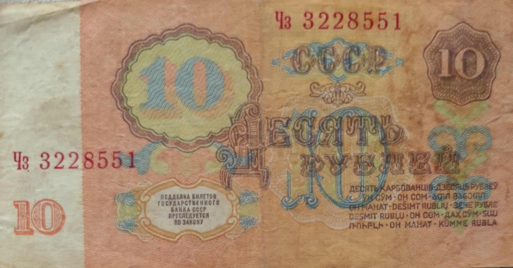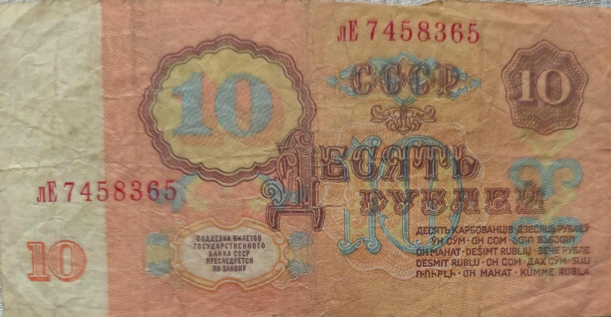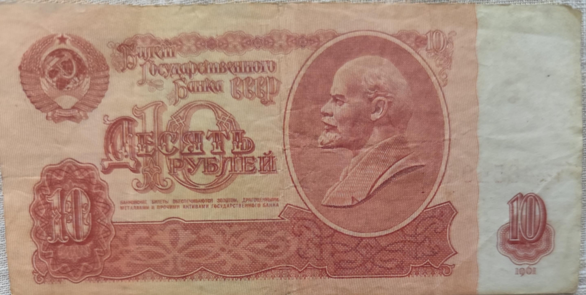 Bancnotă de formă dreptunghiulară cu nominalul de 10 ruble din URSS. Bancnota este predominant în nuanțe de roz și este decolorată puțin , fiind vizibilă vechimea. Pe revers bancnota are nuanțe de roșie- partocalie Într-un chenar oval pe partea stîngă sus, cu un desen albastru în interior este valoarea indicată nominală 10, care este indicată și într-un chenar rotund în colțul din dreapta sus și un 10 mai mic de culoare roșie în colțul din stînga jos. În centru valoarea este scrisă cu litere chirilice mari, stilizate , cu contur albastru și interior alb ДЕСЯТЬ РУБЛЕЙ ( Zece ruble). În partea de sus central - dreaptă și în partea de jos stînga este imprimată seria și numărul bancnotei ле 7458365, бэ 6011041, ЧЗ 3228551.. Deasupra valorii nominale centrale este scris CCCP (URSS) într-un chenar decorativ. În partea stîngă jos , într-un chenar decorativ este un text scris cu litere chirilice în care se specifică despre faptul că ,,Falsificarea bancnotelor de stat se pedepsește prin lege,, Pe partea dreaptă ,sub valoarea nominală în litere este repetată valoarea nominală în toate limbile țărilor membre URSS . Pe aversul bancnotei pe partea partea centrală stînga , dar și în colțul din dreapta jos este imprimată cifra mare 10, iar sub număr este scrisă valoarea nominală cu litere ДЕСЯТЬ РУБЛЕЙ ( Zece ruble). În partea superioară centrală este scris cu litere chirilice БИЛЕТ ГОСУДАРСТВЕННОГО БАНКА СССР (Bilet al Băncii de Stat a URSS). Pe partea dreaptă a bancnotei, într-un cerc este un portret a lui Vladimir Lenin, cu profilul orientat spre dreapta. În colțul din stînga sus este vizibilă stema Uniunii Sovietice, cu secera și ciocanul înconjurate de spice de grîu .Sub valoarea nominală este un text mai mic care se referă la faptul că ,, Biletele bancare sunt garantate cu aur, metale prețioase și alte active ale băncii de stat. În colțul din dreapta jos se valoarea nominală 10 este indicat anul emiterii 1961. Pe suprafața bancnotei există mai multe motive decorative stilizate