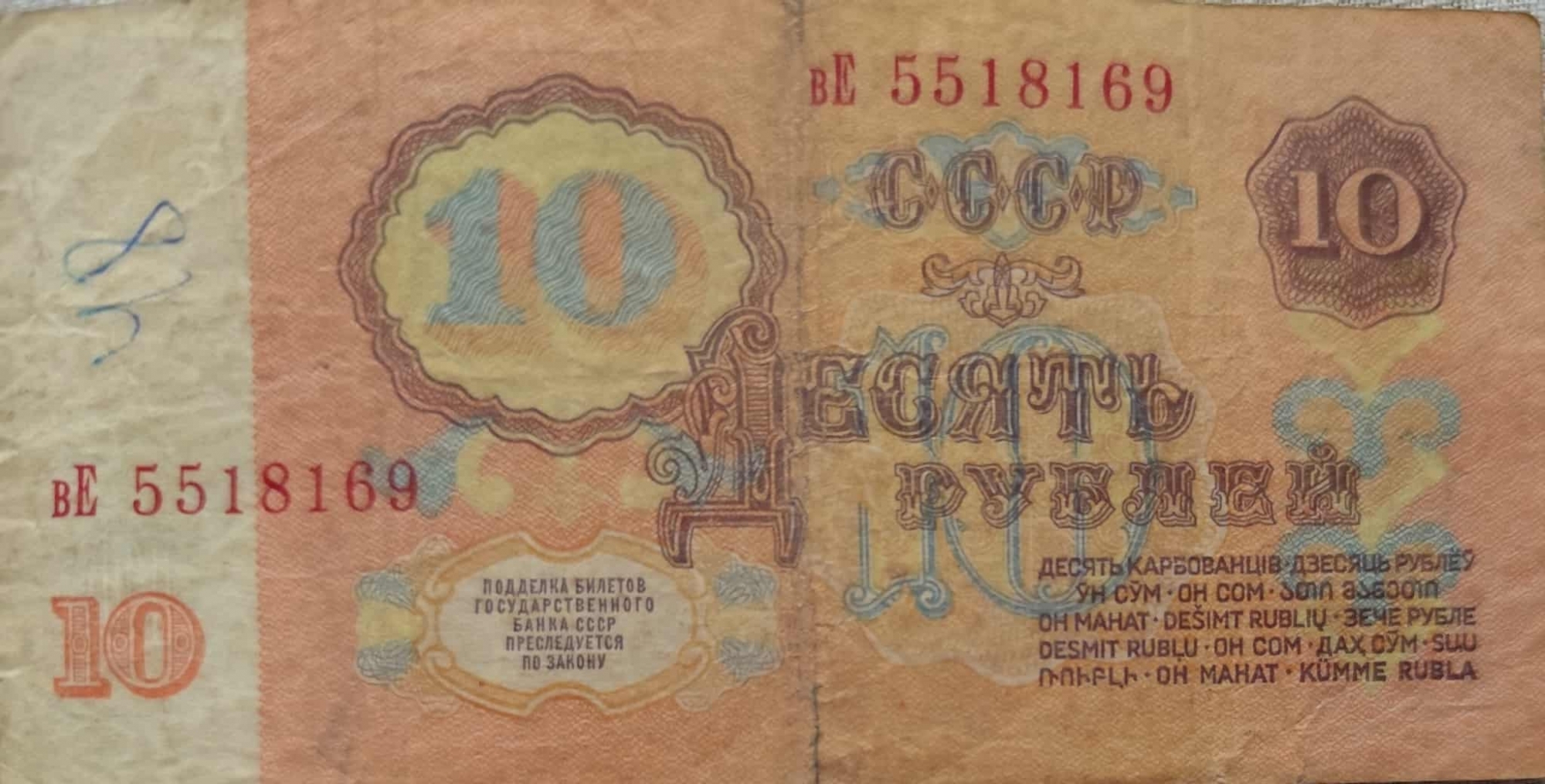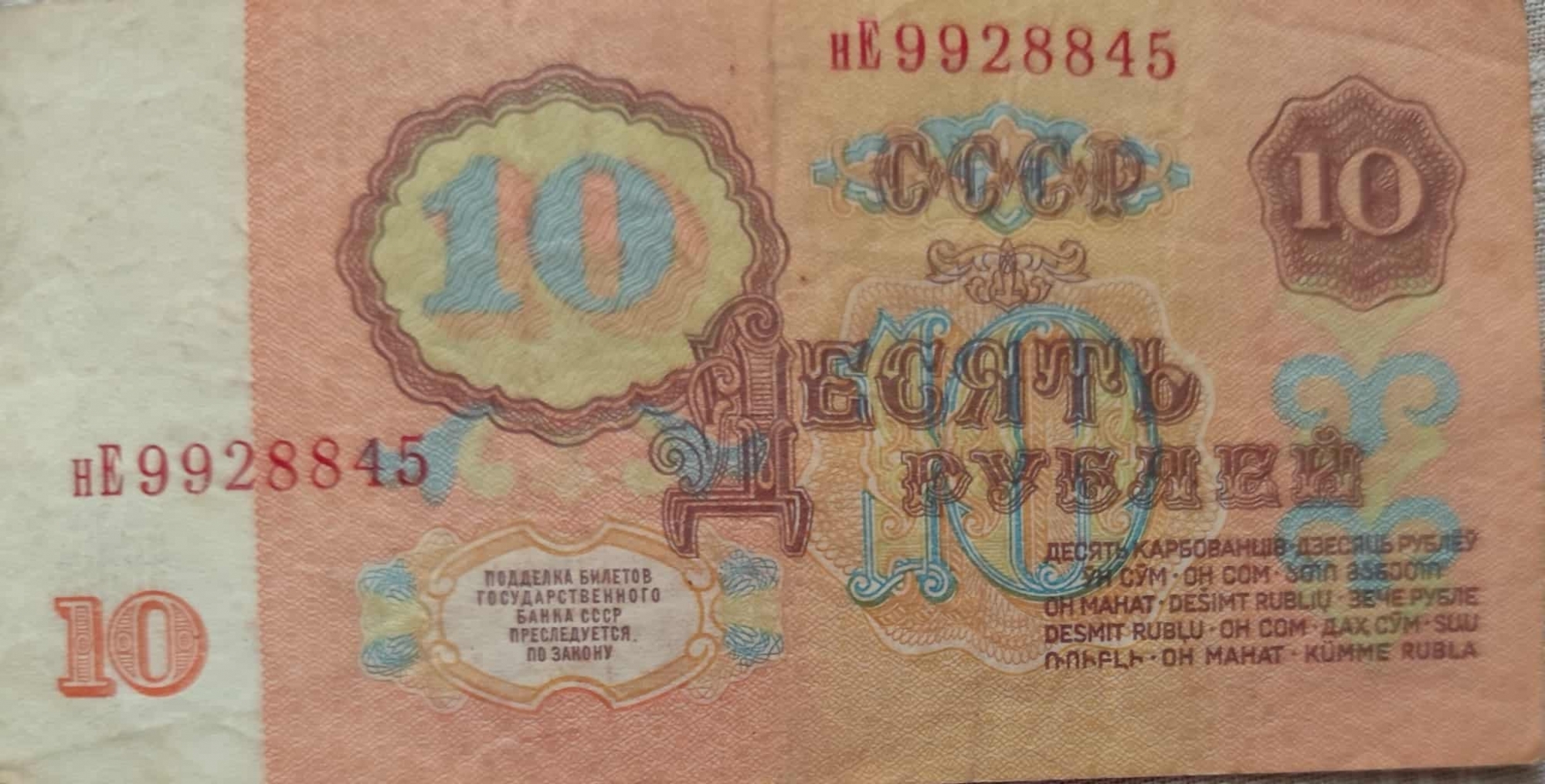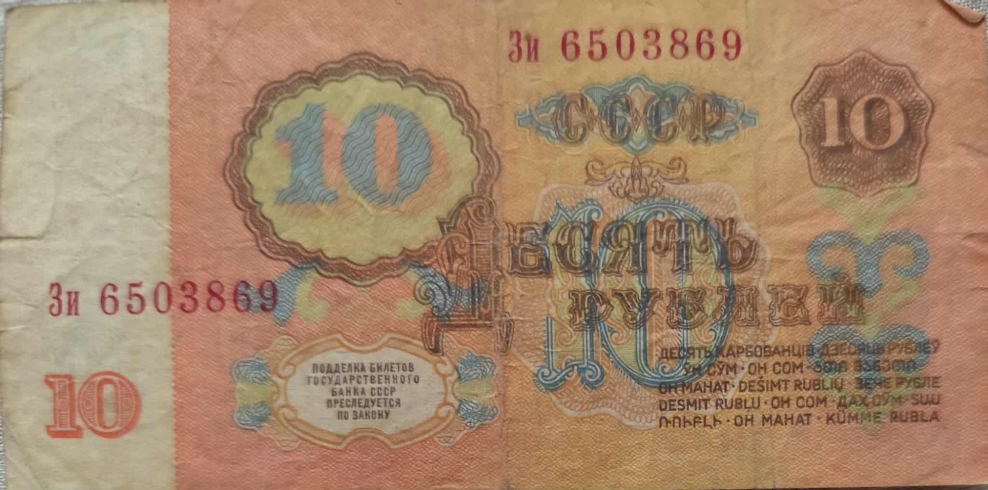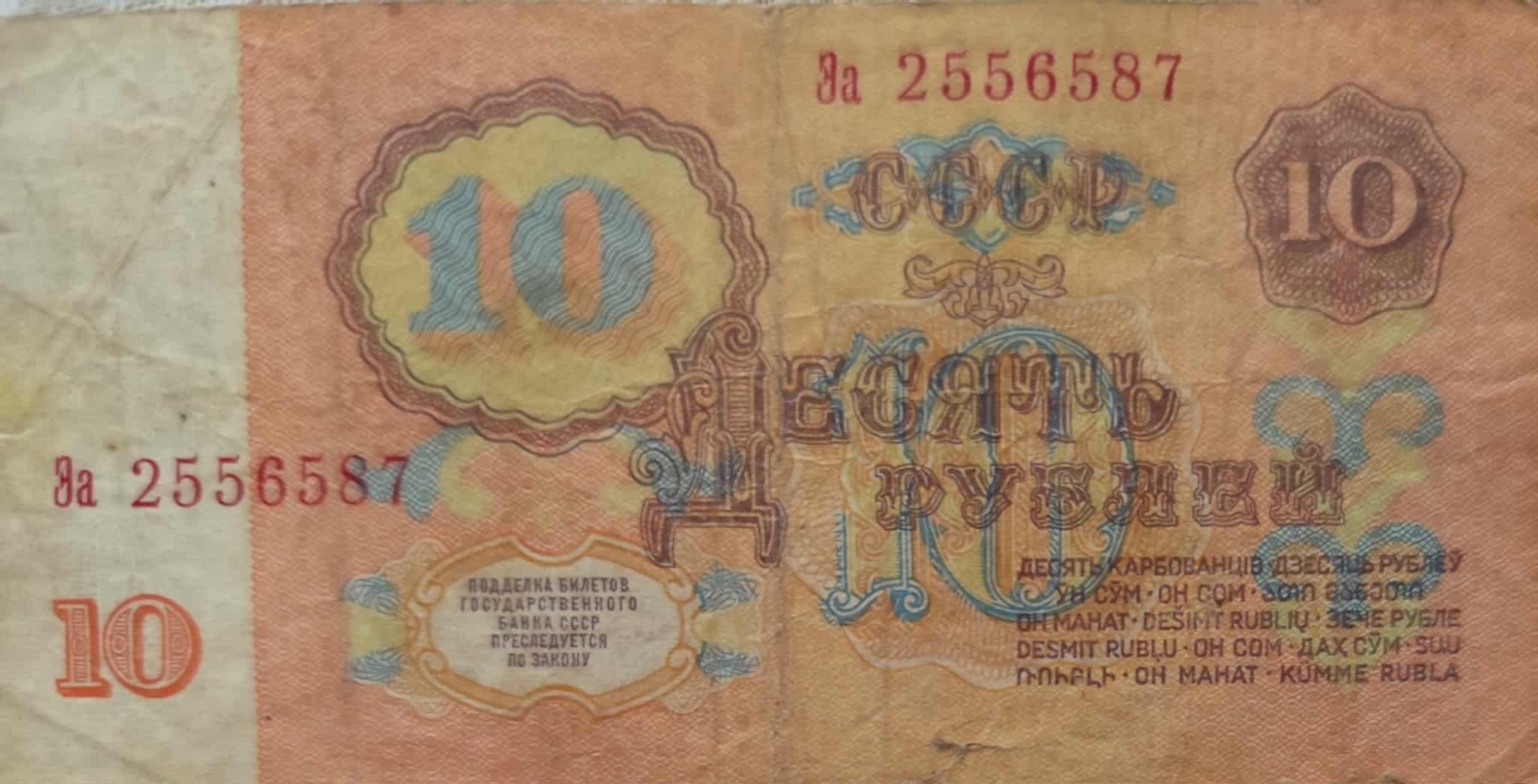 Bancnotă de formă dreptunghiulară cu nominalul de 10 ruble din URSS. Bancnota este predominant în nuanțe de roz și este decolorată puțin , fiind vizibilă vechimea. Pe revers bancnota are nuanțe de roșie- partocalie Într-un chenar oval pe partea stîngă sus, cu un desen albastru în interior este valoarea indicată nominală 10, care este indicată și într-un chenar rotund în colțul din dreapta sus și un 10 mai mic de culoare roșie în colțul din stînga jos. În centru valoarea este scrisă cu litere chirilice mari, stilizate , cu contur albastru și interior alb ДЕСЯТЬ РУБЛЕЙ ( Zece ruble). În partea de sus central - dreaptă și în partea de jos stînga este imprimată seria și numărul bancnotei НЕ 9928845, Эа 2556587, ВЕ 5518169, ЗИ 6503869. Deasupra valorii nominale centrale este scris CCCP (URSS) într-un chenar decorativ. În partea stîngă jos , într-un chenar decorativ este un text scris cu litere chirilice în care se specifică despre faptul că ,,Falsificarea bancnotelor de stat se pedepsește prin lege,, Pe partea dreaptă ,sub valoarea nominală în litere este repetată valoarea nominală în toate limbile țărilor membre URSS . Pe aversul bancnotei pe partea partea centrală stînga , dar și în colțul din dreapta jos este imprimată cifra mare 10, iar sub număr este scrisă valoarea nominală cu litere ДЕСЯТЬ РУБЛЕЙ ( Zece ruble). În partea superioară centrală este scris cu litere chirilice БИЛЕТ ГОСУДАРСТВЕННОГО БАНКА СССР (Bilet al Băncii de Stat a URSS). Pe partea dreaptă a bancnotei, într-un cerc este un portret a lui Vladimir Lenin, cu profilul orientat spre dreapta. În colțul din stînga sus este vizibilă stema Uniunii Sovietice, cu secera și ciocanul înconjurate de spice de grîu .Sub valoarea nominală este un text mai mic care se referă la faptul că ,, Biletele bancare sunt garantate cu aur, metale prețioase și alte active ale băncii de stat. În colțul din dreapta jos se valoarea nominală 10 este indicat anul emiterii 1961. Pe suprafața bancnotei există mai multe motive decorative stilizate