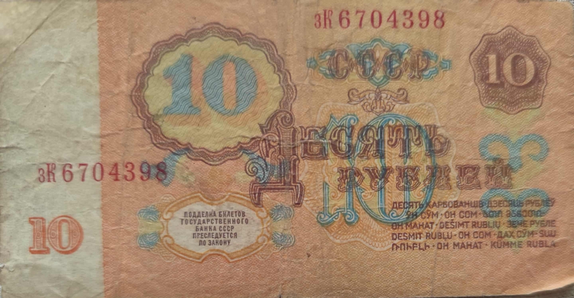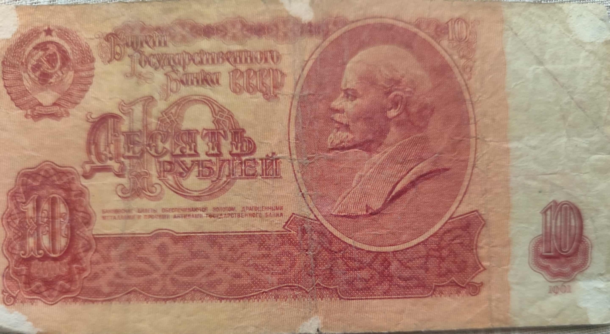 Bancnotă de formă dreptunghiulară cu nominalul de 10 ruble din URSS. Bancnota este predominant în nuanțe de roz și este decolorată puțin , fiind vizibilă vechimea. Pe revers bancnota are nuanțe de roșie- partocalie Într-un chenar oval pe partea stîngă sus, cu un desen albastru în interior este valoarea indicată nominală 10, care este indicată și într-un chenar rotund în colțul din dreapta sus și un 10 mai mic de culoare roșie în colțul din stînga jos. În centru valoarea este scrisă cu litere chirilice mari, stilizate , cu contur albastru și interior alb ДЕСЯТЬ РУБЛЕЙ ( Zece ruble). În partea de sus central - dreaptă și în partea de jos stînga este imprimată seria și numărul bancnotei зК 6704398. Deasupra valorii nominale centrale este scris CCCP (URSS) într-un chenar decorativ. În partea stîngă jos , într-un chenar decorativ este un text scris cu litere chirilice în care se specifică despre faptul că ,,Falsificarea bancnotelor de stat se pedepsește prin lege,, Pe partea dreaptă ,sub valoarea nominală în litere este repetată valoarea nominală în toate limbile țărilor membre URSS . Pe aversul bancnotei pe partea partea centrală stînga , dar și în colțul din dreapta jos este imprimată cifra mare 10, iar sub număr este scrisă valoarea nominală cu litere ДЕСЯТЬ РУБЛЕЙ ( Zece ruble). În partea superioară centrală este scris cu litere chirilice БИЛЕТ ГОСУДАРСТВЕННОГО БАНКА СССР (Bilet al Băncii de Stat a URSS). Pe partea dreaptă a bancnotei, într-un cerc este un portret a lui Vladimir Lenin, cu profilul orientat spre dreapta. În colțul din stînga sus este vizibilă stema Uniunii Sovietice, cu secera și ciocanul înconjurate de spice de grîu .Sub valoarea nominală este un text mai mic care se referă la faptul că ,, Biletele bancare sunt garantate cu aur, metale prețioase și alte active ale băncii de stat. În colțul din dreapta jos se valoarea nominală 10 este indicat anul emiterii 1961. Pe suprafața bancnotei există mai multe motive decorative stilizate