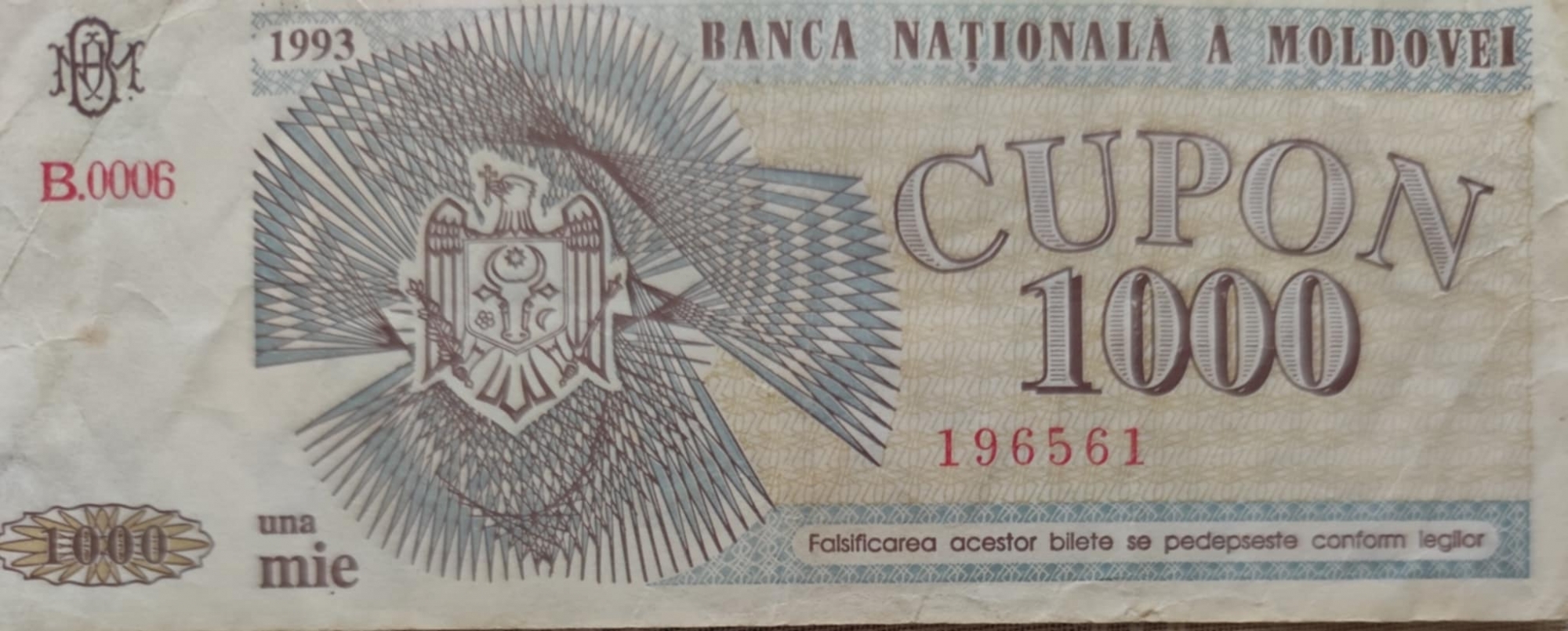 Bancnotă de formă dreptunghiulară cu valoarea nominală 1000 cupoane moldovenești. Pe aversul bancnotei se poate observa inscripționată valoarea nominală: "1000" CUPON cu caractere mari și clare. De asemenea, valoarea este scrisă și în litere: "o mie", deasemenea este indicată banca emitentă: "BANCA NAȚIONALĂ A MOLDOVEI". Pe bancnotă este un avertisment: "Falsificarea acestor bilete se pedepsește conform legilor". În partea stîngă sus este anul emiterii: "1993" Pe partea dreaptă este stema țării -vulturul cu un scut central, un cap de bour și un vultur cu cruce în cioc. În colțul din stânga sus este un monogram cu literele stilizate "BNM" (Banca Națională a Moldovei) Un număr de serie scris cu culoare roșie, "B.0006" este pe partea stângă, iar sub valoarea nominală este al doilea număr de serie albastru, "196561", sub valoarea nominală. Bancnota are un design complex, cu linii fine și modele circulare, care pornesc din spatele stemei. Culoarea dominantă este o combinație de albastru-gri pe un fundal deschis. Pe revers este indicată valoarea nominală, "1000", scrisă în cifre în cele patru colțuri ale bancnotei și într-un format orizontal jos, în partea dreaptă. Partea stângă a bancnotei este dominată de un design elaborat, de tip rozetă sau mandală, format din linii fine, curbe și geometrice care se întrepătrund. Acest model intricate are, de asemenea, cifrele "1000" încorporate în design. Secțiunea centrală și cea din dreapta prezintă o imagine a unei clădiri, care pare a fi un castel sau o fortăreață, cu turnuri crenelate și un pod peste un râu sau un lac. Deasupra castelului, se poate vedea un cer noros sau un peisaj stilizat. În colțul din dreapta sus se află o monogramă sau un simbol, format din literele "M" și "R", așezate una peste alta.