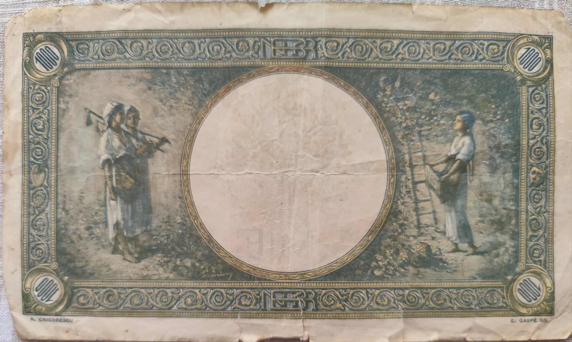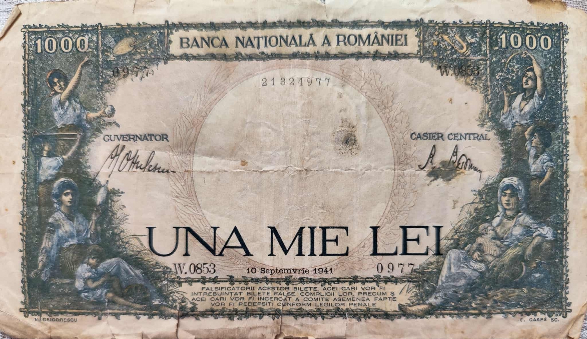 Bancnotă veche românească de formă dreptunghiulară cu o valoare nominală de 1000 lei. Pe avers pe partea inferioară în centru, este scris "1000 UNA MIE LEI" și dedesubt data emiterii 10 semptemvrie 1941 iar denumirea instituției emitente, "BANCA NAȚIONALĂ A ROMÂNIEI", este vizibilă deasupra în partea superioară. În mijloc se află un medalion circular, în interiorul căruia este reprezentată o scenă cu doi țărani, un bărbat și o femeie, care țin unelte agricole (o sapă și o seceră). În partea stângă este o femeie în picioare, care pare a se bucura, ținând o cunună de flori, iar mai jos, o altă femeie stă așezată pe un câmp, lângă o roată. În partea dreaptă este o femeie care ține un copil în brațe, așezată, simbolizând maternitatea și abundența și mai sus, o fată care ține o seceră. Sub medalion, se pot distinge semnăturile Guvernatorului (Probabil "E. Costinescu", deși numele este ilizibil) și a Casierului Central ("T. Arăgescu"). În partea de jos, există o avertizare în limba română privind pedepsirea falsificatorilor: "FALSIFICATORII ACESTOR BILETE, ACEI CARE VOR FI ÎNTREBUINȚAT BILETE FALSE, COMPLICI LOR, PRECUM ȘI ACEI CARE VOR FI ÎNCERCAT A COMITE ASEMENEA FAPTE VOR FI PEDEPSIȚI CONFORM LEGILOR PENALE." În partea de sus se observă o altă serie 21324977 și seriile bancnotei (W 0853 și 0977), precum și numărul de serie 13986185. Pe revers partea centrală, circulară, este goală, probabil pentru a permite vizualizarea filigranului și pe ambele părți ale cercului central sunt reprezentate scene din viața rurală: în stânga: două femei țărănci, purtând unelte agricole pe umăr (o sapă și o furcă), iar în dreapta: o femeie care culege struguri dintr-o vie, folosind o scară. Designul este încadrat de o bordură decorativă complexă, cu motive florale stilizate și simboluri ale valorii nominale (1000) în colțuri. În colțurile de jos sunt menționați autorii designului: "M. GRIGORESCU" pe stânga și "E. GASPÉ SC." pe dreapta.