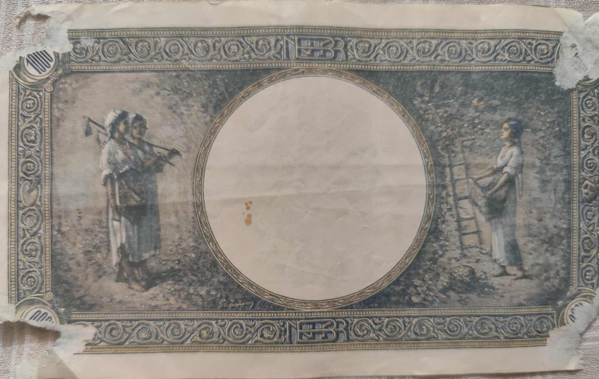 Bancnotă veche românească de formă dreptunghiulară cu o valoare nominală de 1000 lei. Pe avers pe partea inferioară în centru, este scris "1000 UNA MIE LEI" și dedesubt data emiterii 10 semptemvrie 1941 iar denumirea instituției emitente, "BANCA NAȚIONALĂ A ROMÂNIEI", este vizibilă deasupra în partea superioară. În mijloc se află un medalion circular, în interiorul căruia este reprezentată o scenă cu doi țărani, un bărbat și o femeie, care țin unelte agricole (o sapă și o seceră). În partea stângă este o femeie în picioare, care pare a se bucura, ținând o cunună de flori, iar mai jos, o altă femeie stă așezată pe un câmp, lângă o roată. În partea dreaptă este o femeie care ține un copil în brațe, așezată, simbolizând maternitatea și abundența și mai sus, o fată care ține o seceră. Sub medalion, se pot distinge semnăturile Guvernatorului (Probabil "E. Costinescu", deși numele este ilizibil) și a Casierului Central ("T. Arăgescu"). În partea de jos, există o avertizare în limba română privind pedepsirea falsificatorilor: "FALSIFICATORII ACESTOR BILETE, ACEI CARE VOR FI ÎNTREBUINȚAT BILETE FALSE, COMPLICI LOR, PRECUM ȘI ACEI CARE VOR FI ÎNCERCAT A COMITE ASEMENEA FAPTE VOR FI PEDEPSIȚI CONFORM LEGILOR PENALE." În partea de sus se observă o altă serie 59690381 și seriile bancnotei (P 2388 și 0381), precum și numărul de serie 13986185. Pe revers partea centrală, circulară, este goală, probabil pentru a permite vizualizarea filigranului și pe ambele părți ale cercului central sunt reprezentate scene din viața rurală: în stânga: două femei țărănci, purtând unelte agricole pe umăr (o sapă și o furcă), iar în dreapta: o femeie care culege struguri dintr-o vie, folosind o scară. Designul este încadrat de o bordură decorativă complexă, cu motive florale stilizate și simboluri ale valorii nominale (1000) în colțuri. În colțurile de jos sunt menționați autorii designului: "M. GRIGORESCU" pe stânga și "E. GASPÉ SC." pe dreapta. Această bancnotă este cunoscută sub numele de Bancnota "Regina Maria" sau Bancnota "Banca Națională a României, 1925". A fost pusă în circulație în anul 1925 și a rămas una dintre cele mai frumoase și detaliate bancnote din istoria României interbelice.