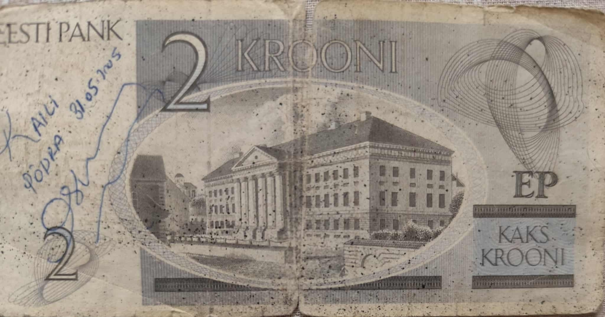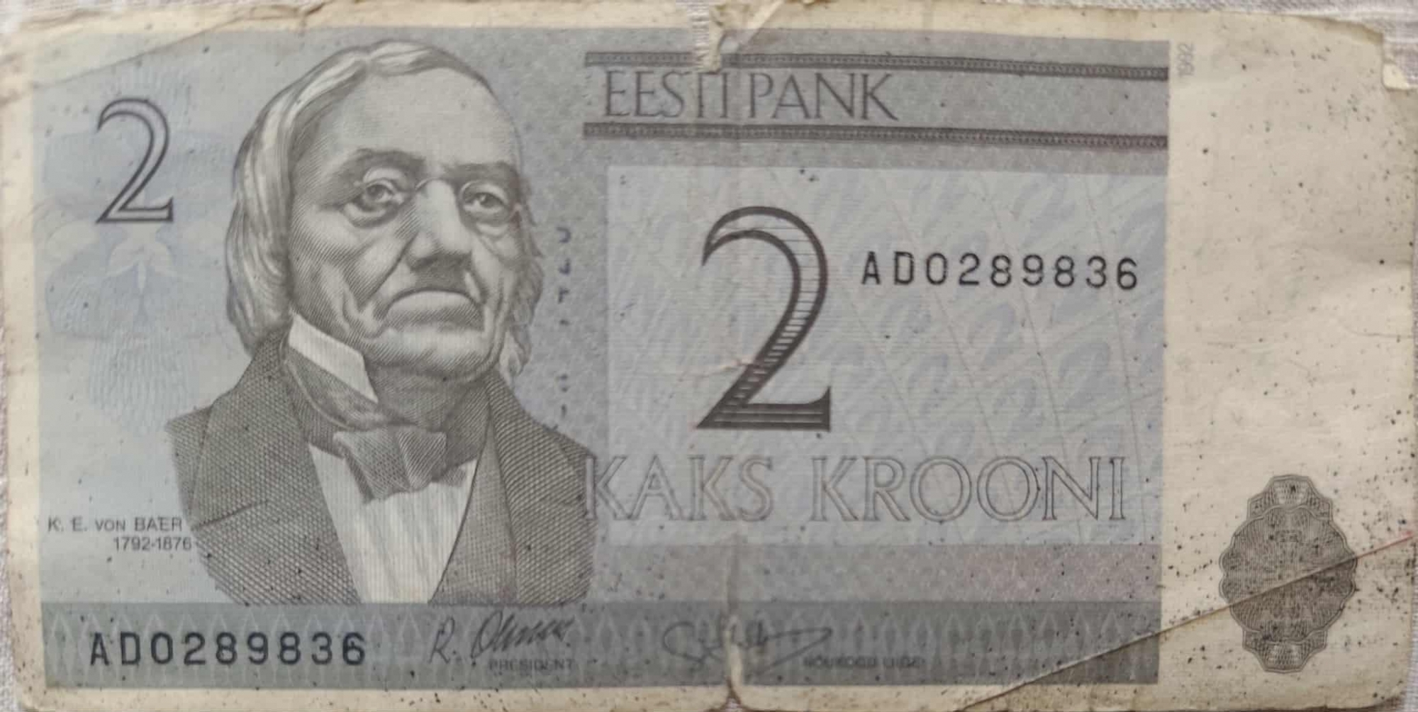 Bancnotă de formă dreptunghiulară cu valoarea nominală de 2 krooni ( coroane) din Estonia are nuanțe de gri și albastru deschis. Pe aversul bancnotei se află portretul lui Karl Ernst von Baer, un cunoscut biolog și explorator estonian, numele și anii săi de naștere și deces (1792-1876) fiind inscripționați sub portret, în partea stângă jos. Valoarea nominală 2 este scrisă cu cifra mare în colțul din stânga sus și în centrul bancnotei. Sub cifra 2 din centru, scrie "KAKS KROONI", care înseamnă două coroane în limba estonă. În partea de sus a bancnotei, în centru, este scris emitentul "EESTI PANK" (Banca Estoniei). Numărul de serie al bancnotei "AD0289836" este vizibil în două locuri: în partea de jos, sub portret, și în dreapta, sub cifra "2" mare. În colțul din drapta sus,pe verticală este scris anul emiterii 1992. Pe revers, se poate vedea o ilustrație a clădirii Universității din Tartu, care este o imagine obișnuită pe bancnotele estoniene. Valoarea nominală este indicată în partea superioară pe centru 2 Krooni (coroane). și în colțul de jis stînga este cifra 2.Bancă emitentă: Eesti Pank (Banca Estoniei) este indicată în colțul de sus în stînga, iar inițialele sunt în partea dreaptă EP, mai jos fiind scrisă cu litere valoarea "KAKS KROONI".