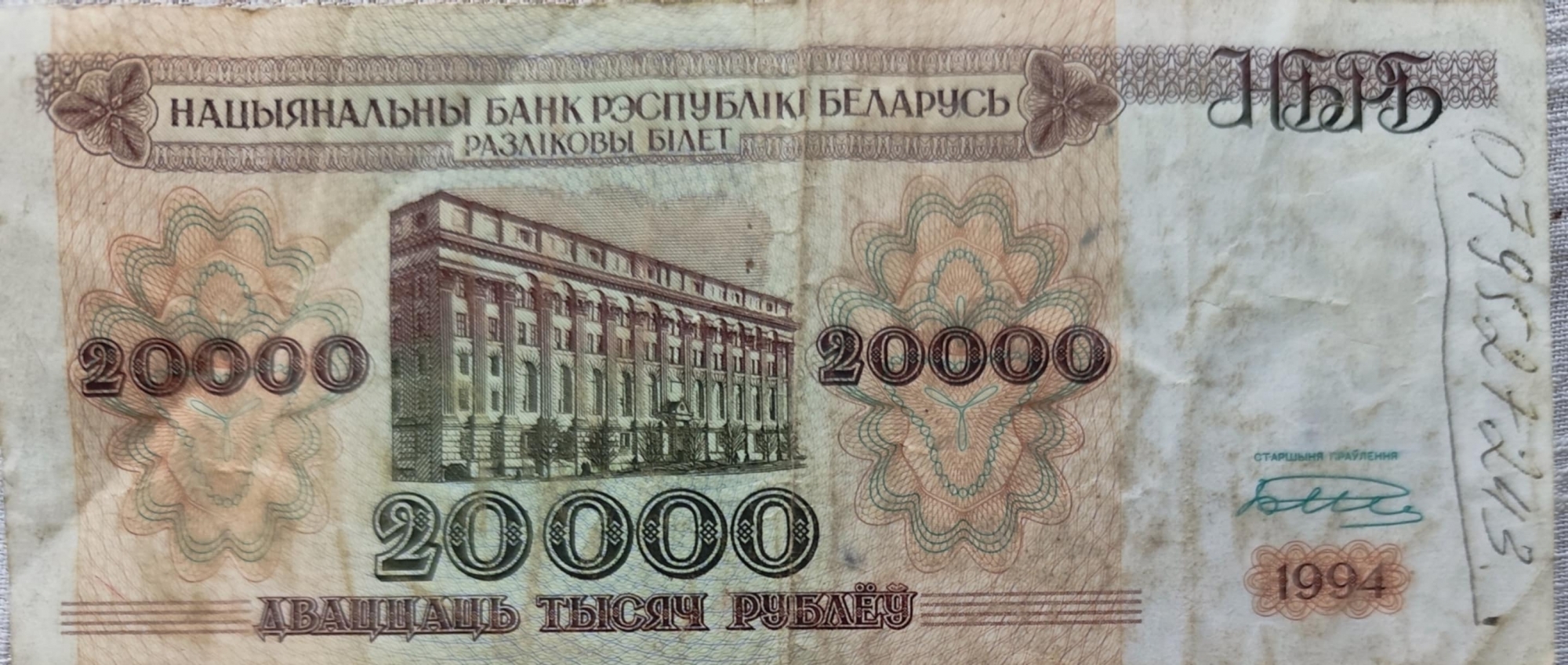 Bancnota de formă dreptunghiulară cu valoarea nominală de 20.000 de ruble din Belarus în nuanțe de cafeniu și verde. Pe aversul bancnotei este imaginea sediului Băncii Naționale a Republicii Belarus, o clădire impunătoare. Sus pe centru este scris: "НАЦЫЯНАЛЬНЫ БАНК РЭСПУБЛIКI БЕЛАРУСЬ" (Banca Națională a Republicii Belarus) și "РАЗЛIКОВЫ БIЛЕТ" (Bilet de decontare). Valoarea nominală de "20000" este vizibilă sub imagine, fiind scris cu cu litere, dar și în ambele părți ale acesteia., iar anul "1994" este tipărit în colțul din dreapta jos. În partea de jos, deasupra anului emiterii 1994 este semnătura și numele guvernatorului băncii din acea perioadă. Pe reversul bancnotei este stema istorică a Belarusului: În centrul bancnotei este un cavaler călare, cunoscut sub numele de "Pahonia" (sau "Vytis" în lituaniană), care a fost stema națională a Republicii Belarus între 1991 și 1995. Textul de sus indică valoarea bancnotei în cuvinte: "ДВАЦЦАЦЬ ТЫСЯЧ РУБЛЁЎ" (Douăzeci de mii de ruble). Numărul de serie, AO 2396181, este vizibil de două ori, de-o parte și de alta a stemei. Un text mai mic în colțul din stânga sus menționează că "Falsificarea biletelor Băncii Naționale a Republicii Belarus este pedepsită prin lege".