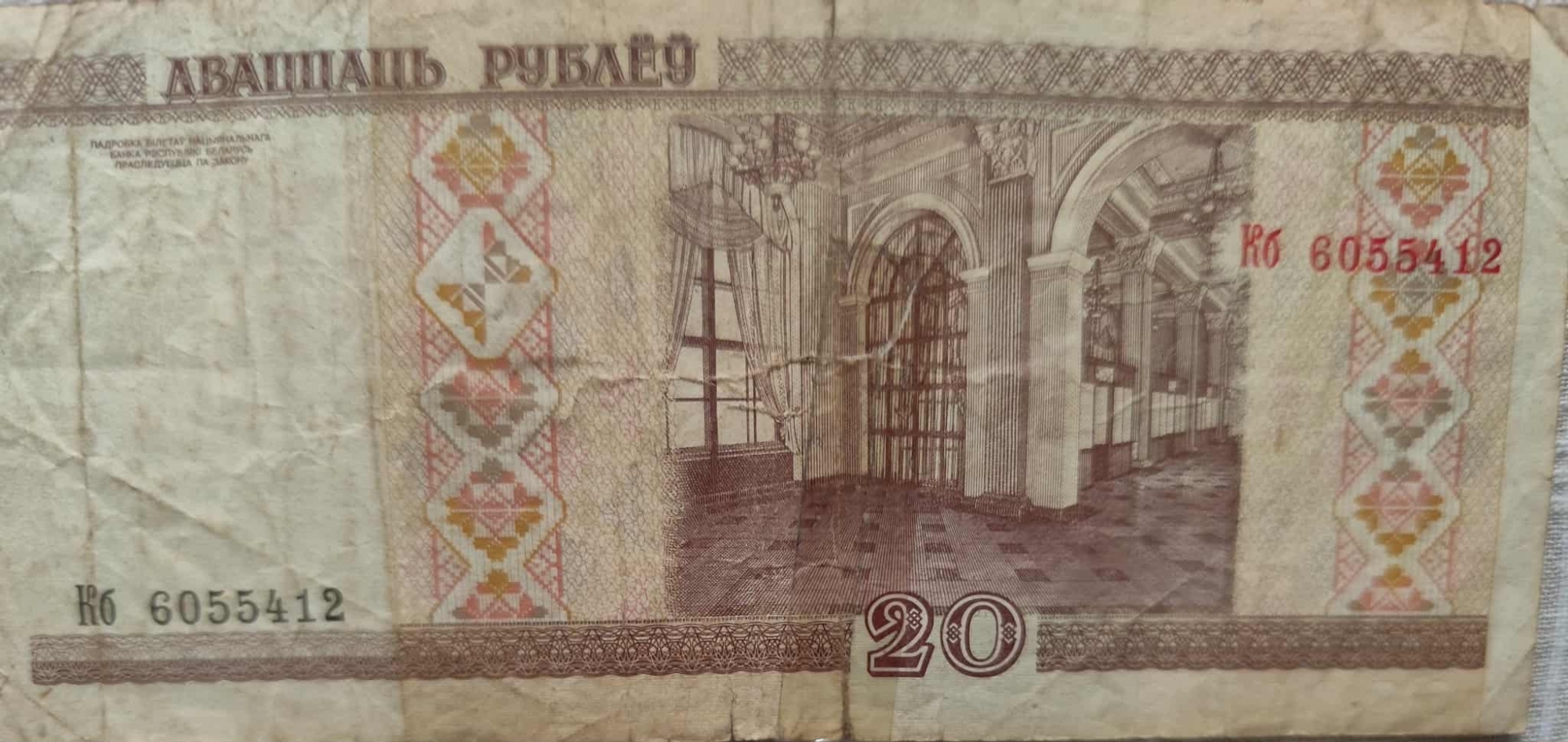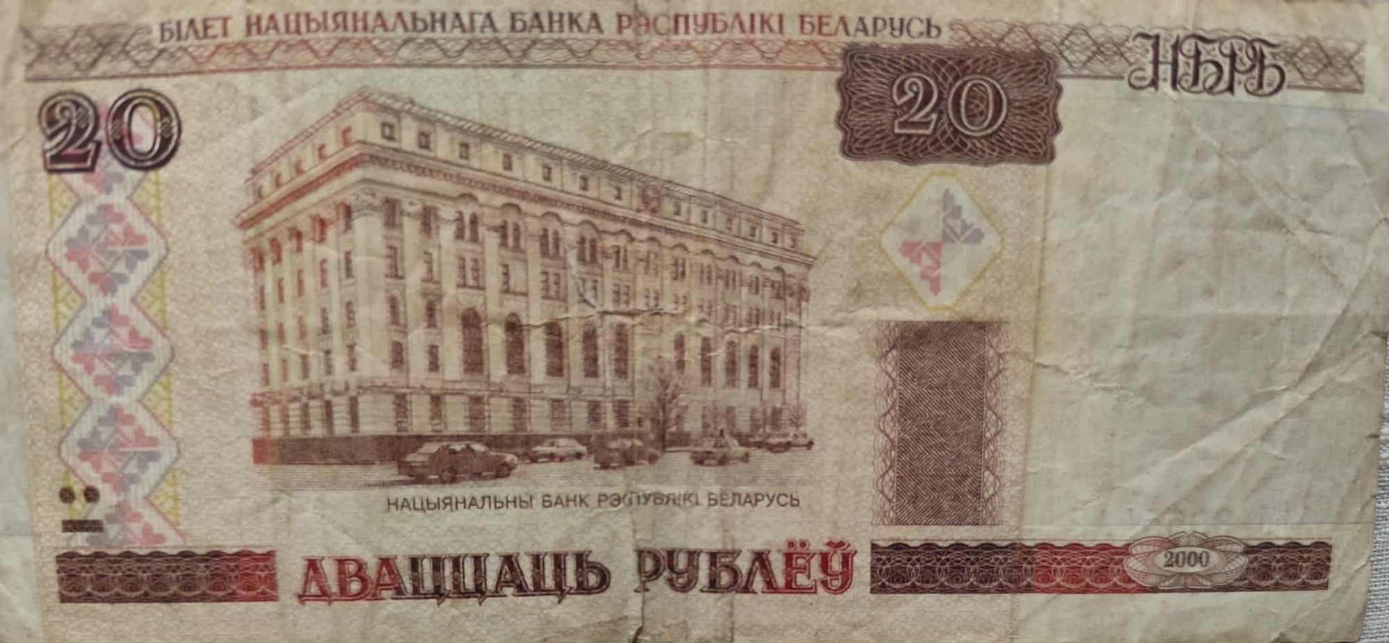 Bancnotă de formă dreptunghiulară cu valoarea nominală de 20 de ruble belaruse (BYR) emisă de Banca Națională a Republicii Belarus (Нацыянальны банк Рэспублікі Беларусь). Pe aver4sul bancnotei este indicată valoarea nominală cu cifre 20 în colțul din stânga sus și în caseta din dreapta sus, cât și cu litere (ДВАЦЦАЦЬ РУБЛЁЎ) în partea de jos. Imaginea centrală este o clădire grandioasă, sediul Băncii Naționale a Republicii Belarus din Minsk. Pe stradă, în fața clădirii, se văd parcate câteva mașini. În partea stângă, pe verticală, există o bandă decorativă cu motive florale sau geometrice stilizate. Sub imaginea clădirii, este inscripționat numele băncii emitente în limba belarusă (НАЦЫЯНАЛЬНЫ БАНК РЭСПУБЛІКІ БЕЛАРУСЬ). În colțul din dreapta jos, se poate vedea anul emiterii, 2000. Pe reversul bancnotei , se poate observa interiorul Muzeului Național de Artă al Republicii Belarus din Minsk, construcție finalizată în 1957 și se regăsește pe mai multe bancnote din anii '90. Valoarea nominală, 20 este scrisă în partea de jos, în centru, iar seria bancnotei, КБ 6055412, se repetată în colțul din stânga jos și în colțul din dreapta sus. Un model decorativ tradițional, cu romburi stilizate și motive florale, este prezent pe marginile laterale. Această bancnotă este parte a seriei emise în 1992, după destrămarea Uniunii Sovietice. Această bancnotă a fost parte a seriei de denominații emise în anul 2000 și a circulat înainte de redenominarea monedei belaruse din 2016.