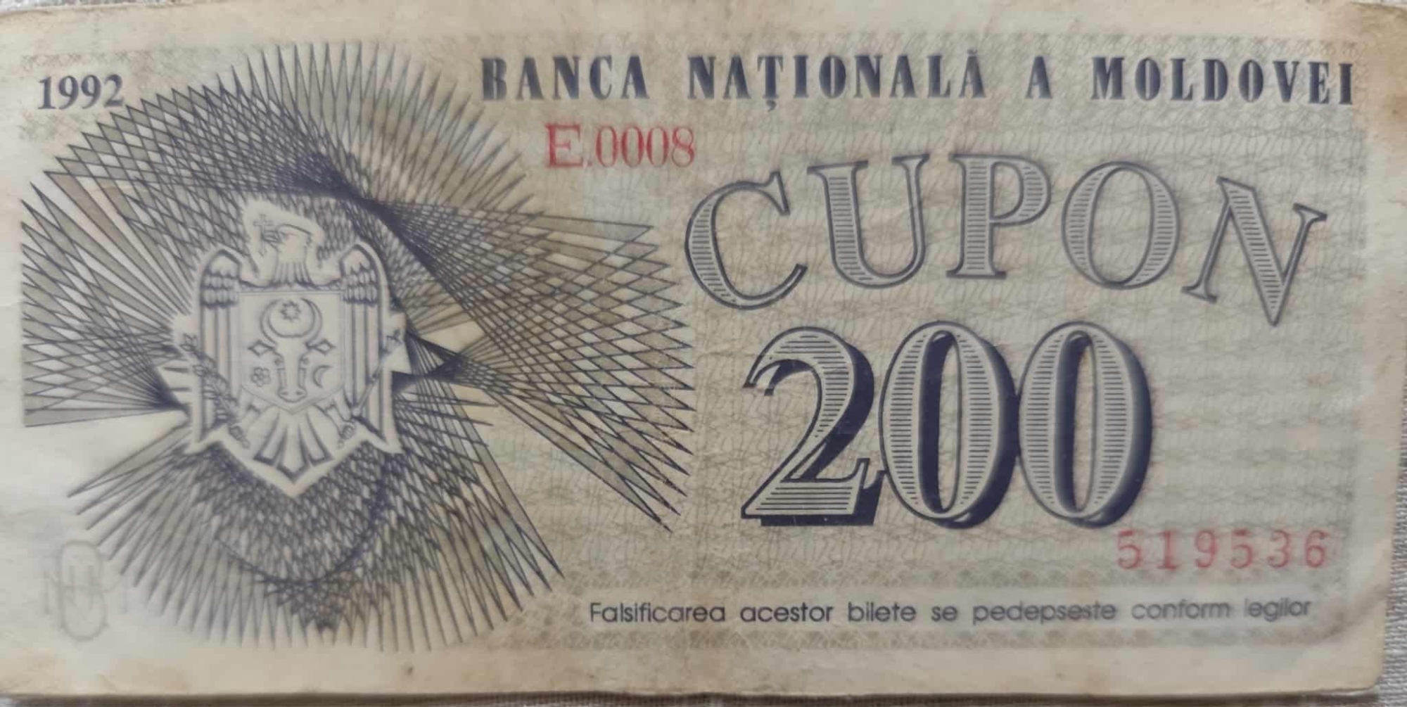 Bancnotă de formă dreptunghiulară cu nominalul de 200 cupoane din Republica Moldova. Pe aversul bancnotei este inscripționat vizibil în partea dreaptă valoarea nominală: "CUPON 200", în colțul din stânga sus este anul emiterii 1992. În partea superioară centrală se află autoritatea emitentă: "BANCA NAȚIONALĂ A MOLDOVEI", iar în partea superioară dreaptă sunt numerele de identificare a bancnotei "E 0003", și "163186",. în partea inferioară dreaptă. În partea stângă a bancnotei este reprezentată Stema Republicii Moldova, un vultur care ține în cioc o cruce, în gheare un sceptru și o ramură de măslin, iar pe piept un scut cu capul de bour. În spatele și în jurul stemei se află un model complex de linii radiale și geometrice, predominant în nuanțe de albastru/violet. În partea de jos, sub valoarea nominală, este scris textul "Falsificarea acestor bilete se pedepsește conform legilor.", indicând consecințele legale ale contrafacerii. Bancnota are nuanțe predominante de albastru-violet și gri pe un fundal deschis. Pe revers bancnota prezintă pe o parte un design complex, geometric, predominant rozaliu și violet, cu forme stilizate care par să radieze dintr-un centru. În colțurile din stânga sus, stânga jos și dreapta jos, se află cifra "200" înscrisă într-un chenar ornamental. Partea dreaptă a bancnotei înfățișează o clădire veche, probabil un castel sau o ruină istorică, cu ziduri înalte și turnuri. Pe fundal se pot distinge siluete de copaci și o perspectivă de peisaj. Sub clădire, este reprezentat un pod peste un curs de apă. În colțul din dreapta sus, se repetă cifra "200" într-un chenar asemănător cu celelalte.