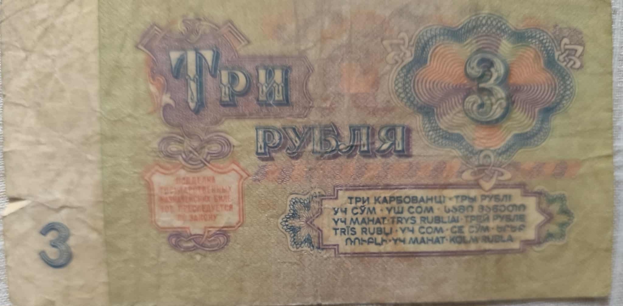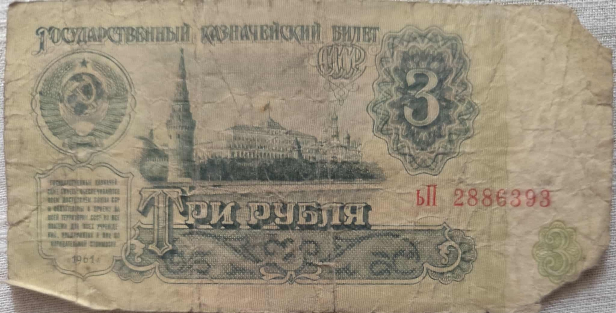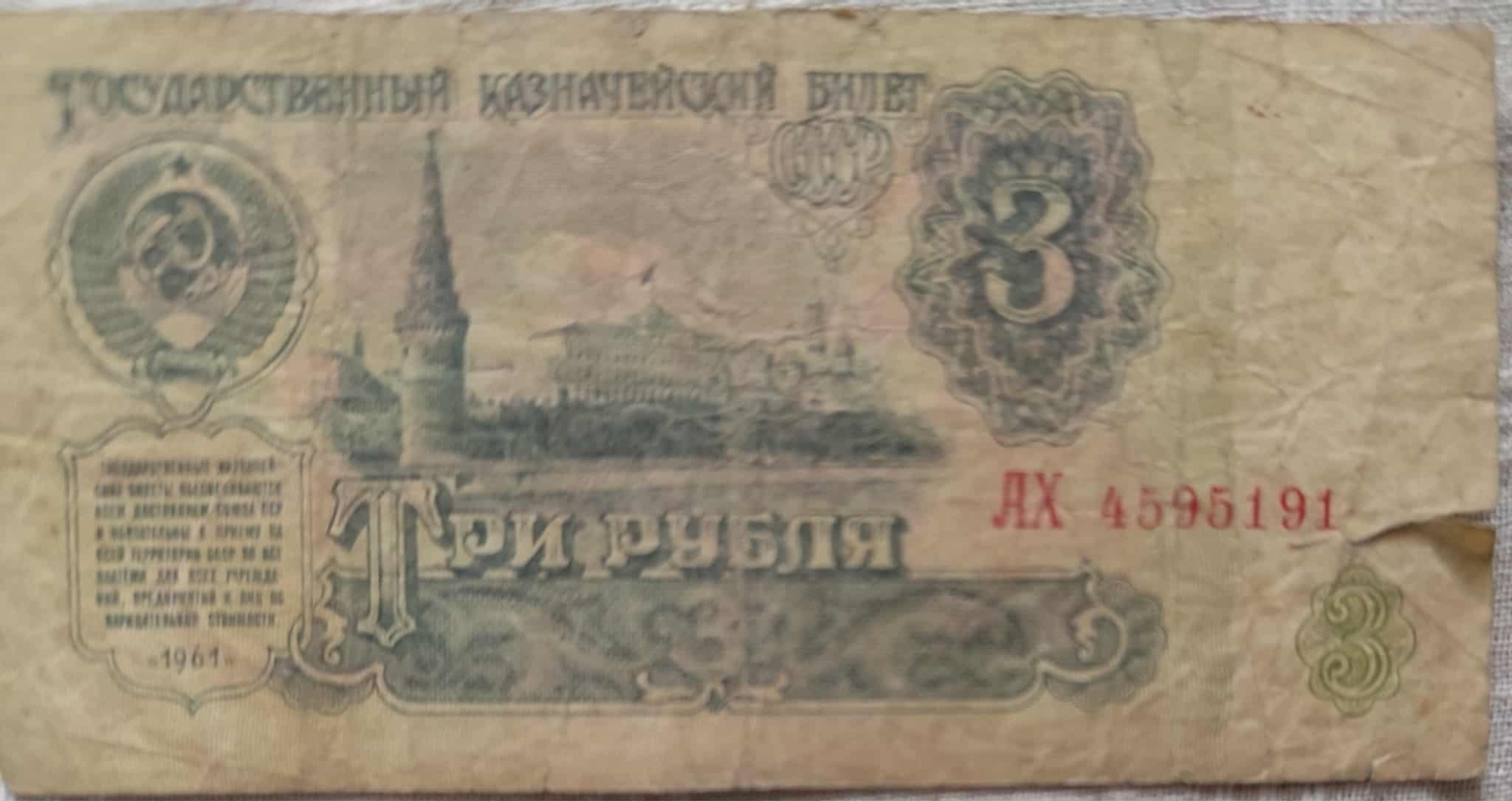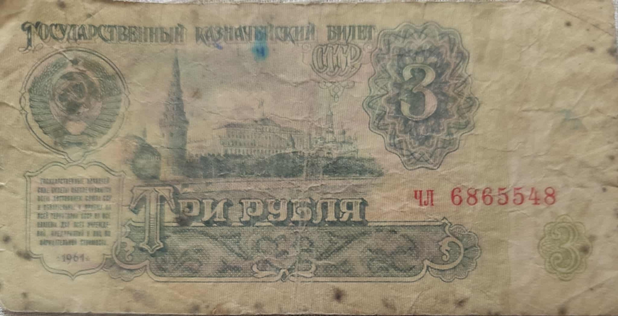 Bancnotă de formă dreptunghiulară cu nominalul de 3ruble din URSS. Bancnota este predominant în nuanțe de maro deschis și este uzată, fiind vizibilă vechimea., Pe revers pe partea centrală superioară este scris cu litere în limba rusă valoarea nominală TPИ (Trei), iar dedesubt РУБЛЯ (Ruble). În colțul din stînga jos este cifra 3 scrisă cu un font stilizat, iar în partea centrală- stînga, într-un chenar decorativ este un text scris cu litere chirile în care se specifică despre faptul că ,,Falsificarea bancnotelor de stat se pedepsește prin lege,, În partea dreaptă este un chenar ornamental circular în interiorul căruia este de asemenea cifra 3 stilizată, înconjurată de de linii ondulate. Sub acest chenar se află un bloc de text în care este scrisă valoarea nominală a bancnotei în toate limbile țărilor din cadrul URSS. Pe avers culoarea predominantă a bancnotei este gri-verzui și maro. În partea superioară este scris cu litere chirilice stilizate ГОСУДАРСТВУННЫЙ КАЗНАЧЕСКИЙ БИЛЕТ СССР (Bilet al Trezoreriei de Stat a URSS). În partea stîngă sus este vizibilă stema Uniunii Sovietice, cu secera și ciocanul înconjurate de spice de grîu legate cu o panglică cu inscripții ,, Proletari din toate țările uniți-vă!,, în limbile republicilor unionale, cu o stea cu cinci colțuri în vîrf și un glob pămîntesc în centru. Sub stemă este scris CCCP (URSS). Pe fundalul central al bancnotei este ilustrată o scenă arhitecturală - Palatul Kremlinului. În dreapta sus este cifra 3 mare într-un chenar ornamental, iar sub imaginea centrală este scris cu litere chirilice mari TPИ РУБЛЯ (Trei ruble). În stînga jos , într-un chenar este scris un text , care tradus specifică că bancnota este obligatorie pentru toate plățile , iar sub acest text este anul emiterii 1961. În partea dreaptă este tipărit numărul de serie al bancnotei cu cerneală roșie ЬП 2886393, ЧК 984363, ЧЛ 6865548, AX 4595191 Pe întreaga suprafață a bancnotei sunt prezente diverse elemente decorative și un motiv floral stilizat în colțul din dreapta jos.