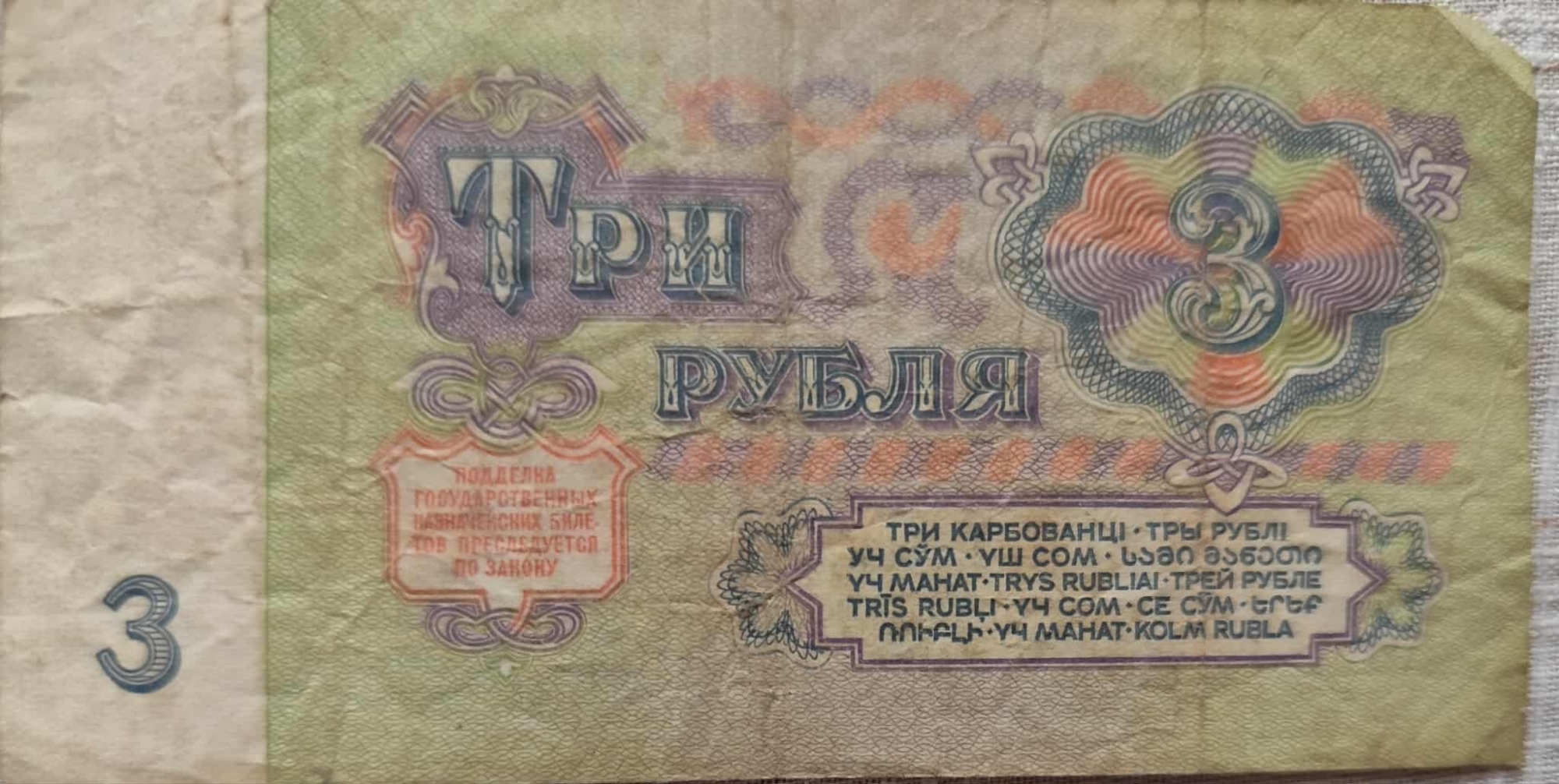 Bancnotă de formă dreptunghiulară cu nominalul de 3ruble din URSS. Bancnota este predominant în nuanțe de maro deschis și este uzată, fiind vizibilă vechimea., Pe revers pe partea centrală superioară este scris cu litere în limba rusă valoarea nominală TPИ (Trei), iar dedesubt РУБЛЯ (Ruble). În colțul din stînga jos este cifra 3 scrisă cu un font stilizat, iar în partea centrală- stînga, într-un chenar decorativ este un text scris cu litere chirile în care se specifică despre faptul că ,,Falsificarea bancnotelor de stat se pedepsește prin lege,, În partea dreaptă este un chenar ornamental circular în interiorul căruia este de asemenea cifra 3 stilizată, înconjurată de de linii ondulate. Sub acest chenar se află un bloc de text în care este scrisă valoarea nominală a bancnotei în toate limbile țărilor din cadrul URSS. Pe avers culoarea predominantă a bancnotei este gri-verzui și maro. În partea superioară este scris cu litere chirilice stilizate ГОСУДАРСТВУННЫЙ КАЗНАЧЕСКИЙ БИЛЕТ СССР (Bilet al Trezoreriei de Stat a URSS). În partea stîngă sus este vizibilă stema Uniunii Sovietice, cu secera și ciocanul înconjurate de spice de grîu legate cu o panglică cu inscripții ,, Proletari din toate țările uniți-vă!,, în limbile republicilor unionale, cu o stea cu cinci colțuri în vîrf și un glob pămîntesc în centru. Sub stemă este scris CCCP (URSS). Pe fundalul central al bancnotei este ilustrată o scenă arhitecturală - Palatul Kremlinului. În dreapta sus este cifra 3 mare într-un chenar ornamental, iar sub imaginea centrală este scris cu litere chirilice mari TPИ РУБЛЯ (Trei ruble). În stînga jos , într-un chenar este scris un text , care tradus specifică că bancnota este obligatorie pentru toate plățile , iar sub acest text este anul emiterii 1961. În partea dreaptă este tipărit numărul de serie al bancnotelor cu cerneală roșie ЧП 9620470. Pe întreaga suprafață a bancnotei sunt prezente diverse elemente decorative și un motiv floral stilizat în colțul din dreapta jos.