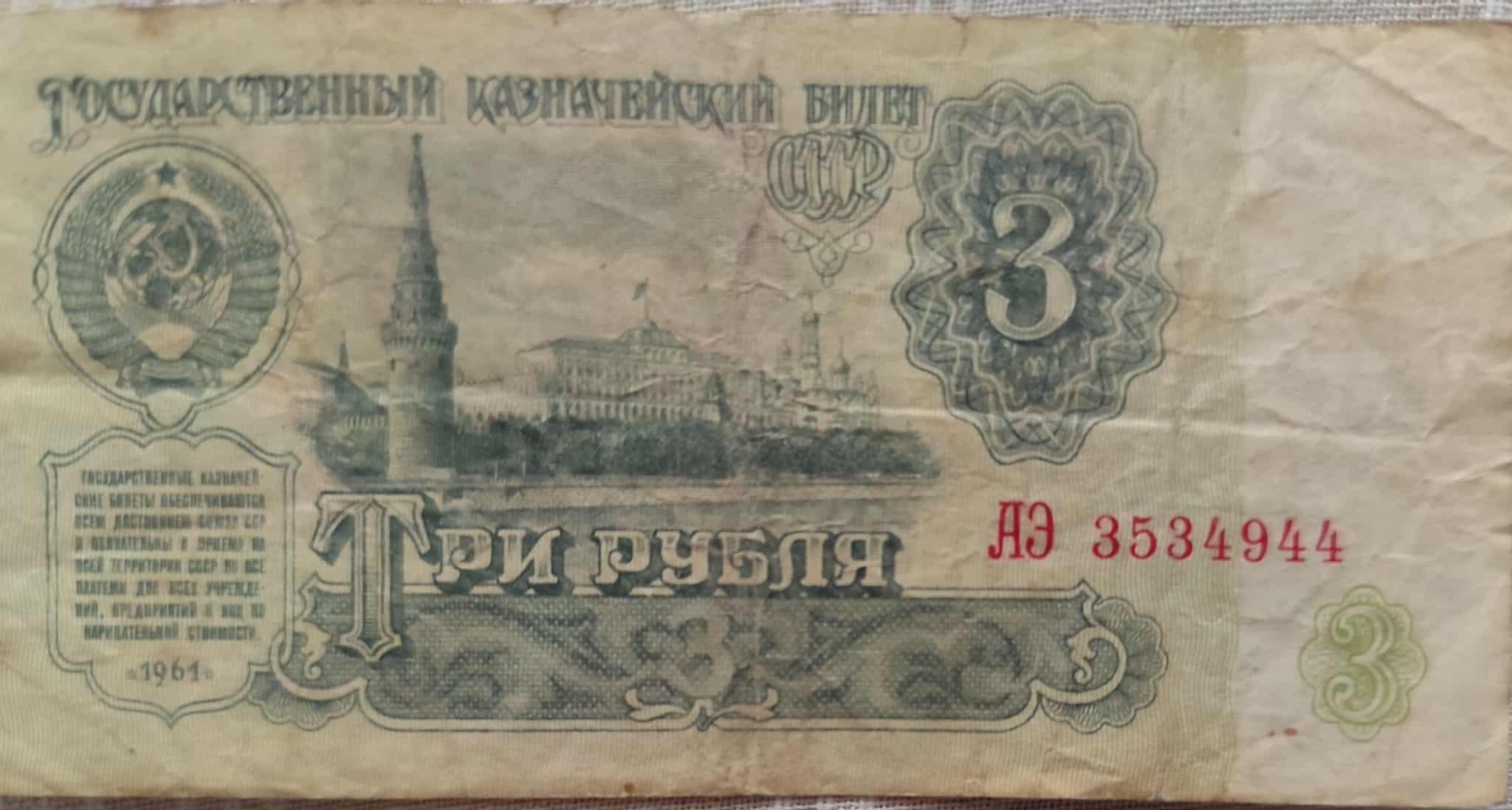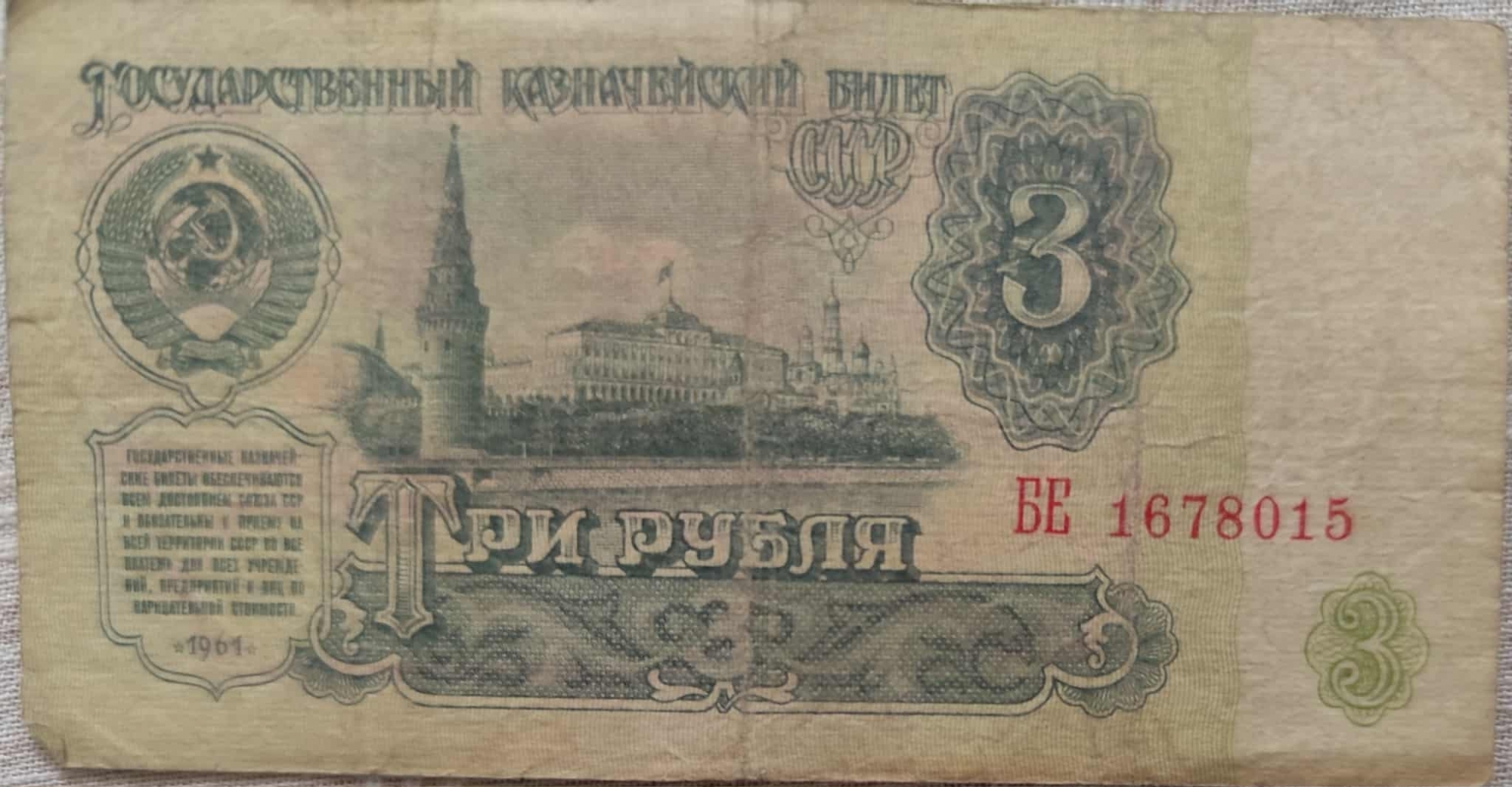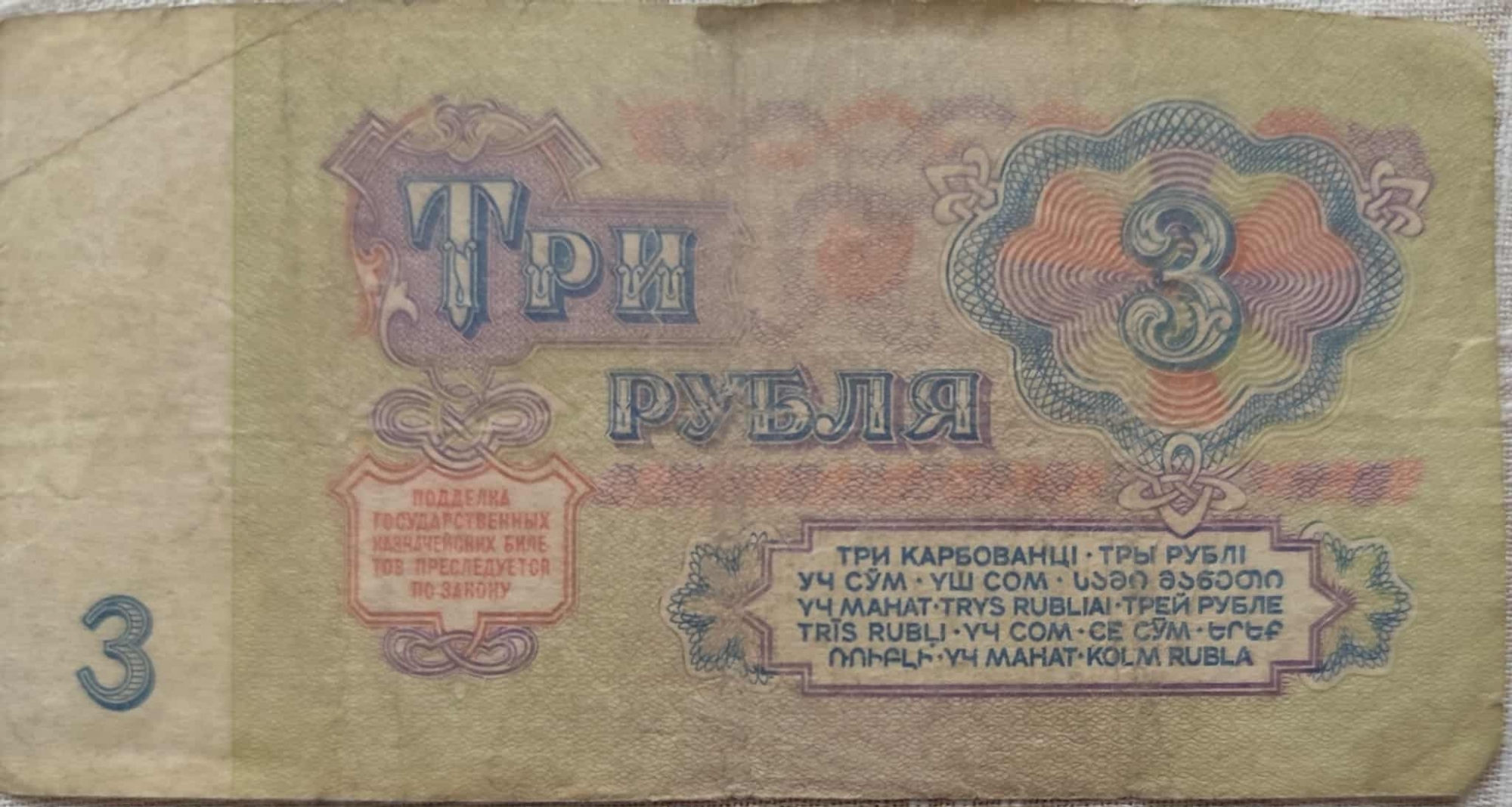 Bancnotă de formă dreptunghiulară cu nominalul de 3ruble din URSS. Bancnota este predominant în nuanțe de maro deschis și este uzată, fiind vizibilă vechimea., Pe revers pe partea centrală superioară este scris cu litere în limba rusă valoarea nominală TPИ (Trei), iar dedesubt РУБЛЯ (Ruble). În colțul din stînga jos este cifra 3 scrisă cu un font stilizat, iar în partea centrală- stînga, într-un chenar decorativ este un text scris cu litere chirile în care se specifică despre faptul că ,,Falsificarea bancnotelor de stat se pedepsește prin lege,, În partea dreaptă este un chenar ornamental circular în interiorul căruia este de asemenea cifra 3 stilizată, înconjurată de de linii ondulate. Sub acest chenar se află un bloc de text în care este scrisă valoarea nominală a bancnotei în toate limbile țărilor din cadrul URSS. Pe avers culoarea predominantă a bancnotei este gri-verzui și maro. În partea superioară este scris cu litere chirilice stilizate ГОСУДАРСТВУННЫЙ КАЗНАЧЕСКИЙ БИЛЕТ СССР (Bilet al Trezoreriei de Stat a URSS). În partea stîngă sus este vizibilă stema Uniunii Sovietice, cu secera și ciocanul înconjurate de spice de grîu legate cu o panglică cu inscripții ,, Proletari din toate țările uniți-vă!,, în limbile republicilor unionale, cu o stea cu cinci colțuri în vîrf și un glob pămîntesc în centru. Sub stemă este scris CCCP (URSS). Pe fundalul central al bancnotei este ilustrată o scenă arhitecturală - Palatul Kremlinului. În dreapta sus este cifra 3 mare într-un chenar ornamental, iar sub imaginea centrală este scris cu litere chirilice mari TPИ РУБЛЯ (Trei ruble). În stînga jos , într-un chenar este scris un text , care tradus specifică că bancnota este obligatorie pentru toate plățile , iar sub acest text este anul emiterii 1961. În partea dreaptă este tipărit numărul de serie al bancnotelor cu cerneală roșie БЕ 1678015Б ФЭ 3534944Ю Pe întreaga suprafață a bancnotei sunt prezente diverse elemente decorative și un motiv floral stilizat în colțul din dreapta jos.