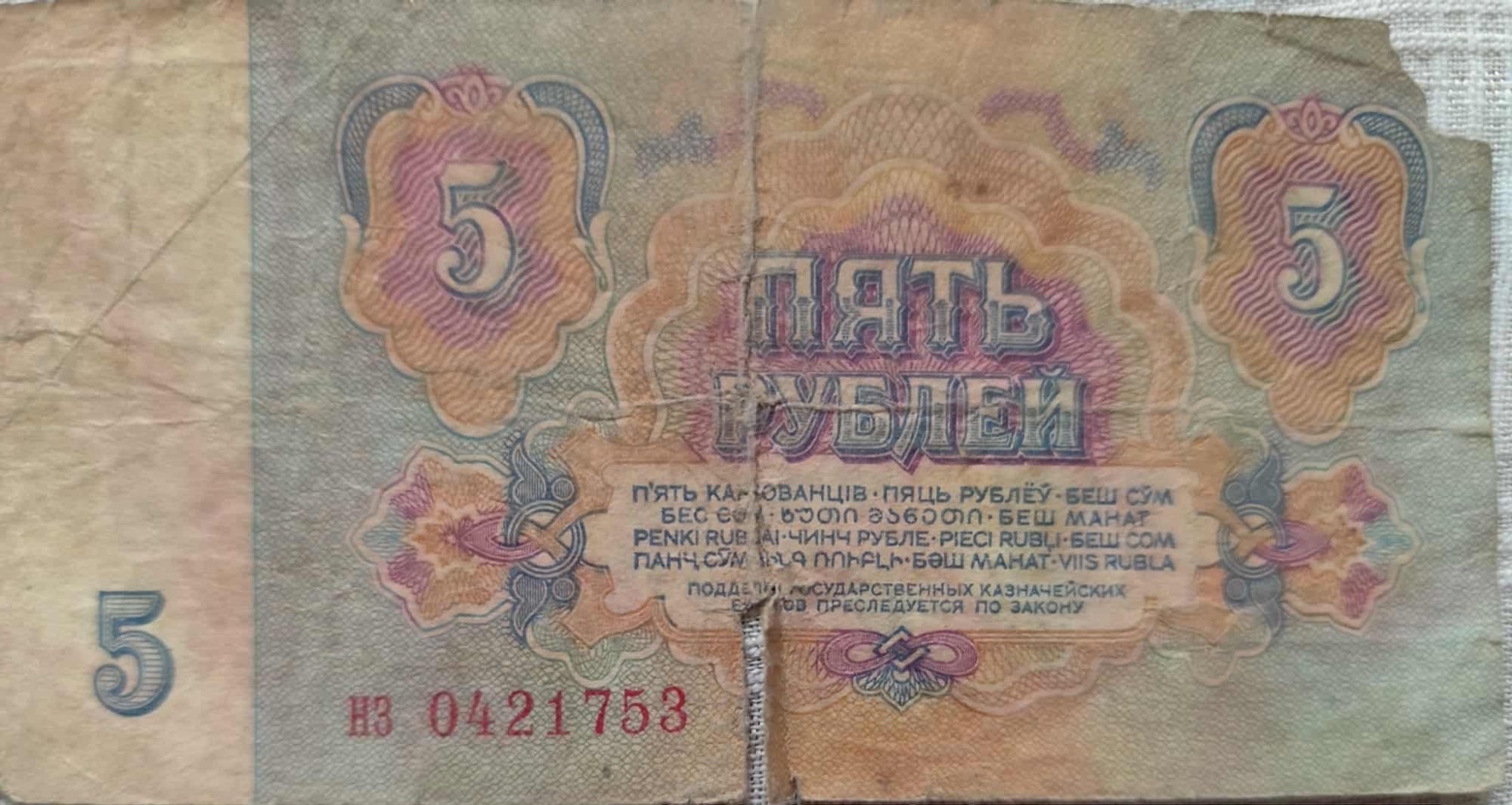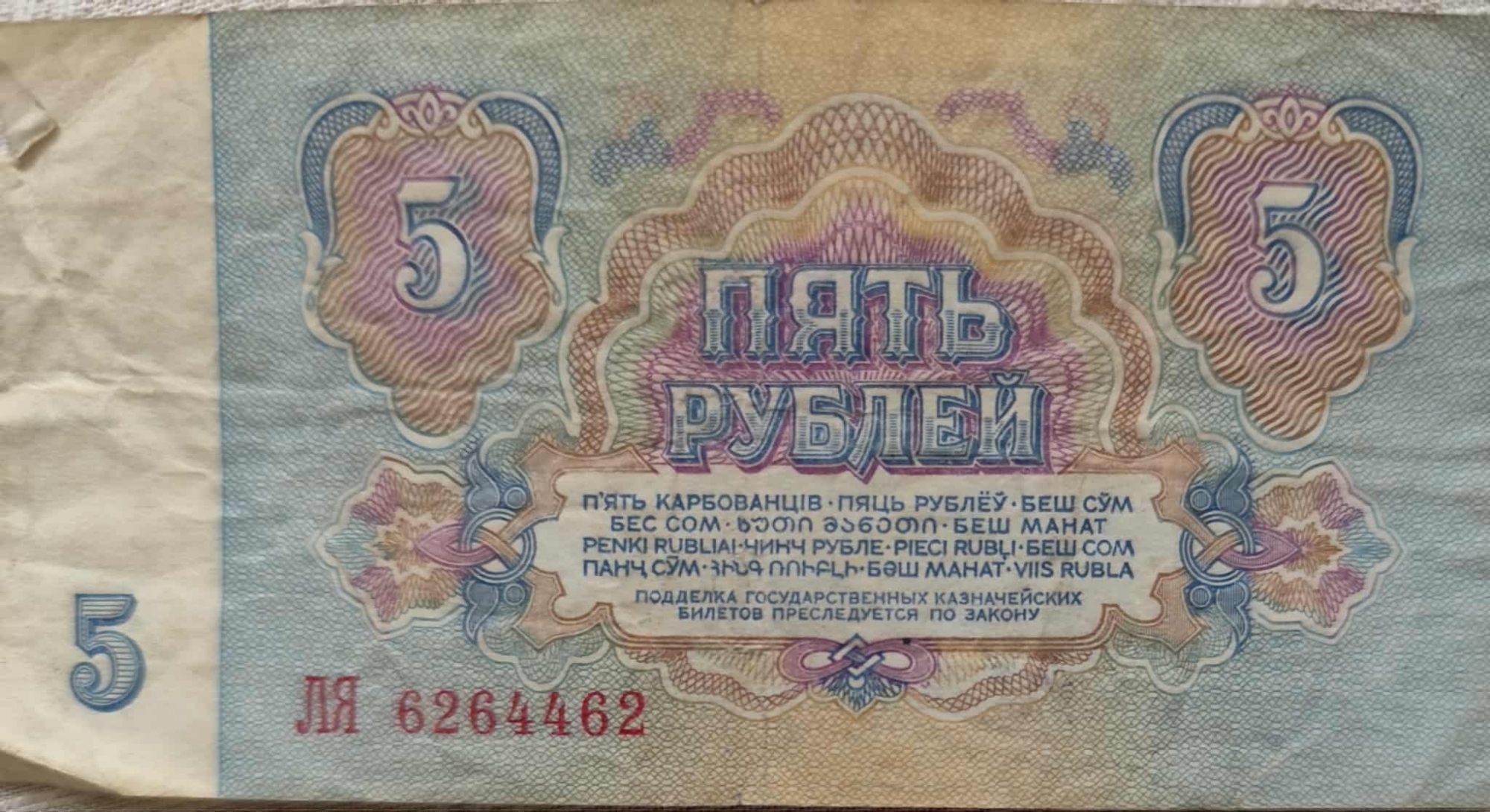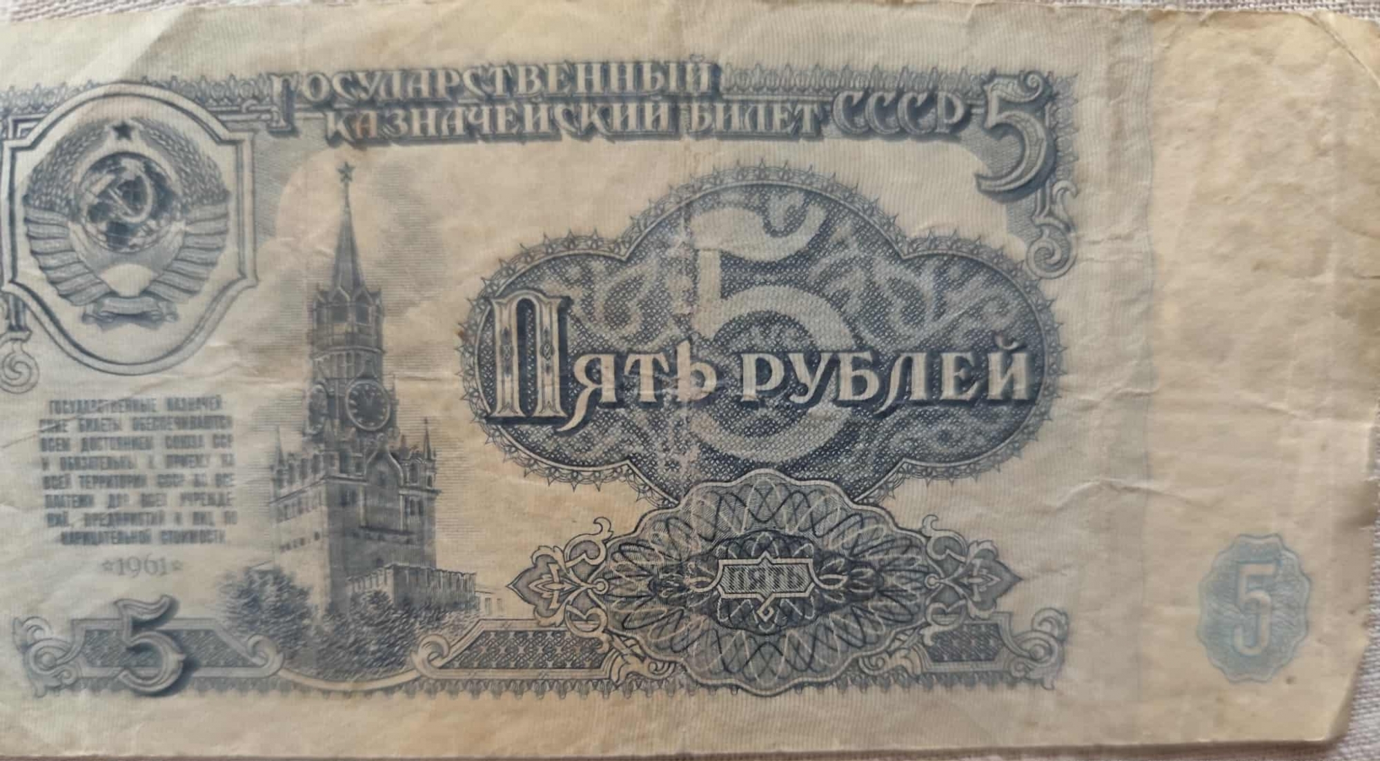 Bancnotă de formă dreptunghiulară cu nominalul de 5 ruble din URSS. Bancnota este predominant în nuanțe de albastru și verde deschis, cu un design central complex și elemente decorative pe margini. Pe aversul bancnotei, în partea superioară pe centru este scris ГОСУДАРСТВУННЫЙ КАЗНАЧЕСКИЙ БИЛЕТ СССР (Bilet al Trezoreriei de Stat a URSS), urmat de valoarea nominală 5. Valoarea nominală ПЯТЬ РУБЛЕЙ (Cinci ruble) este scrisă cu caractere chirilice mari, proeminente, în centrul bancnotei, pe un fundal stilizat care este un element decorativ complex sub forma unui nor. Sub acest text se află un ornament elaborat, care încorporează valoarea bancnotei cu litere ПЯТЬ (Cinci) în mijloc. În partea stîngă a bancnotei, unelement grafic proeminent este Turnul Spasskaia al Kremlinului din Moscova cu ceasul său distinctiv. Turnul este încadrat de copaci stilizați. Deasupra Turnului, în colțul din stînga sus, se află Stema de Stat a Uniunii Sovietice, care include secera și ciocanul , globul pămîntesc și spice de grîu, toate încadrate de o stea. Sub stemă și lîngă Turnul Spasskaia, este un text scris mic în care se specifică faptul că acest bilet este valabil în toate țările din cadrul URSS.și anul 1961. În colțurile de jos în stînga și în dreapta este cifra 5. Textul principal din centru este ПЯТЬ РУБЛЕЙ (Cinci ruble) scris cu caractere mari, , pe un fundal decorativ, cu detalii violet și roz. Sub textul central, valoarea bancnotei este repetată în cele 15 limbi aleUniunii Sovietice, reflectînd diversitatea lingvistică a republicilor unionale. Dedesubt este o avertizare în limba rusă ГОСУДАРСТВУННЫХ КАЗНАЧЕСКИХ БИЛЕТОВ ПРЕСЛЕДУЕТСЯ ПО ЗАКОНУ ( Falsificarea bancnotelor de stat este pedepsită prin lege). În partea stîngă jos cu culoarea roșie este scrisă seria bancnotei ГЛ 3935943, ПЯ 3245973, НЗ 0421753, ЧС 1646393, ЛЯ 6264462. Monedă de formă rotundă care pe revers are stema Uniunii Sovietice, formată dintr-o seceră și un ciocan, simboluri ale unității muncitorilor și țăranilor, așezate pe globul pământesc. În spatele globului se ridică un soare, iar totul este înconjurat de două spice de grâu legate la bază cu o panglică pe care scrie CCCP (abrevierea pentru Uniunea Republicilor Socialiste Sovietice, în rusă). Deasupra stemei se află o stea cu cinci colțuri. ​Pe aversul monedei sunt inscripționate valoarea nominală 10 , iar sub el scrie КОПЕЕК (Kopeek), care înseamnă copeici. Sub valoare este anul de emisiune: 1961. Toate aceste elemente sunt înconjurate de două spice de grâu.