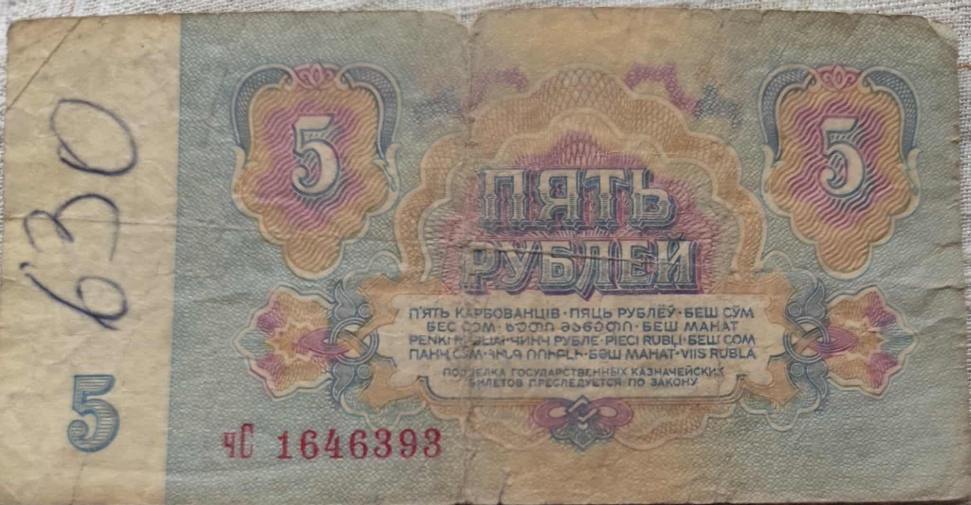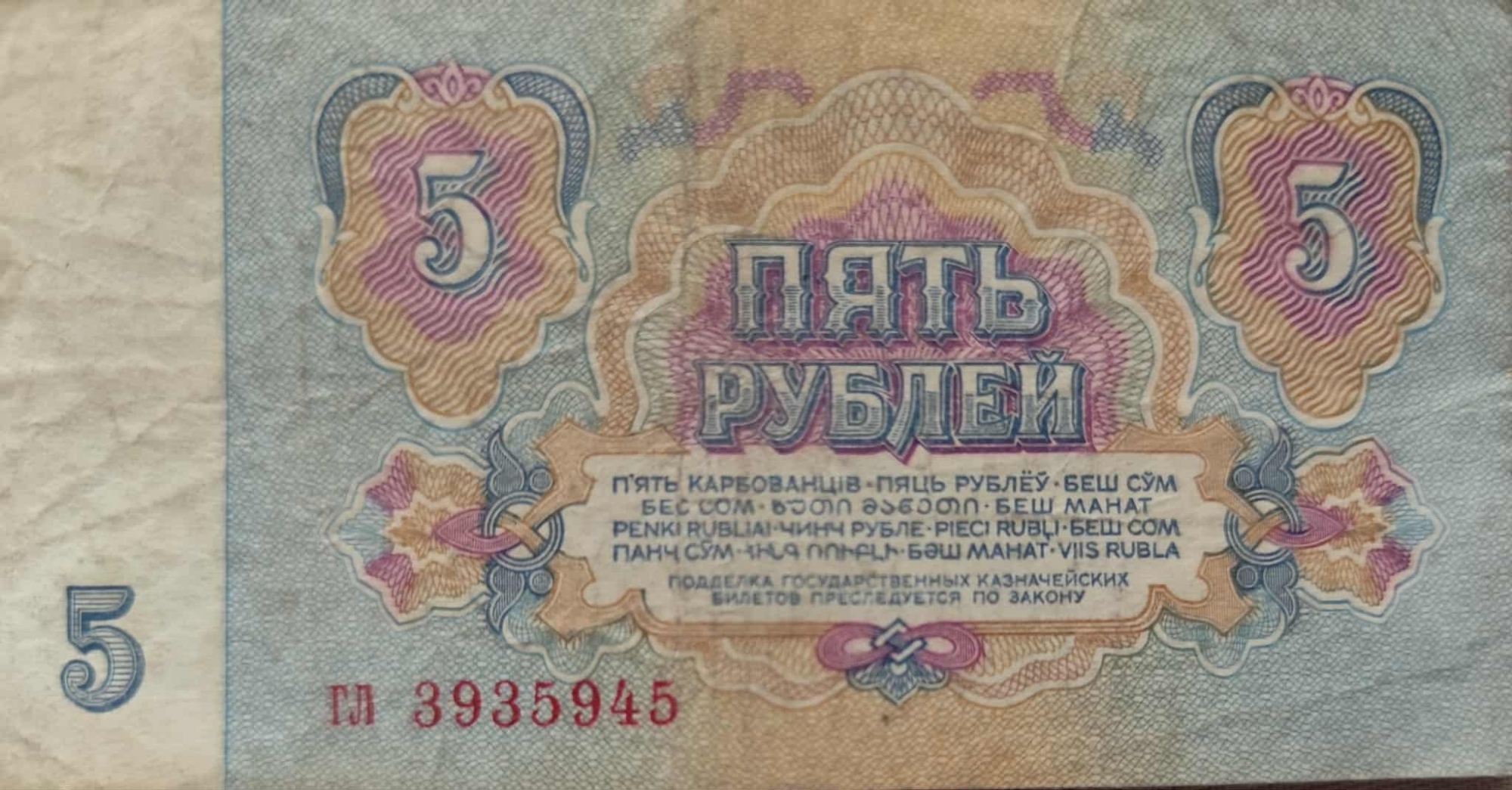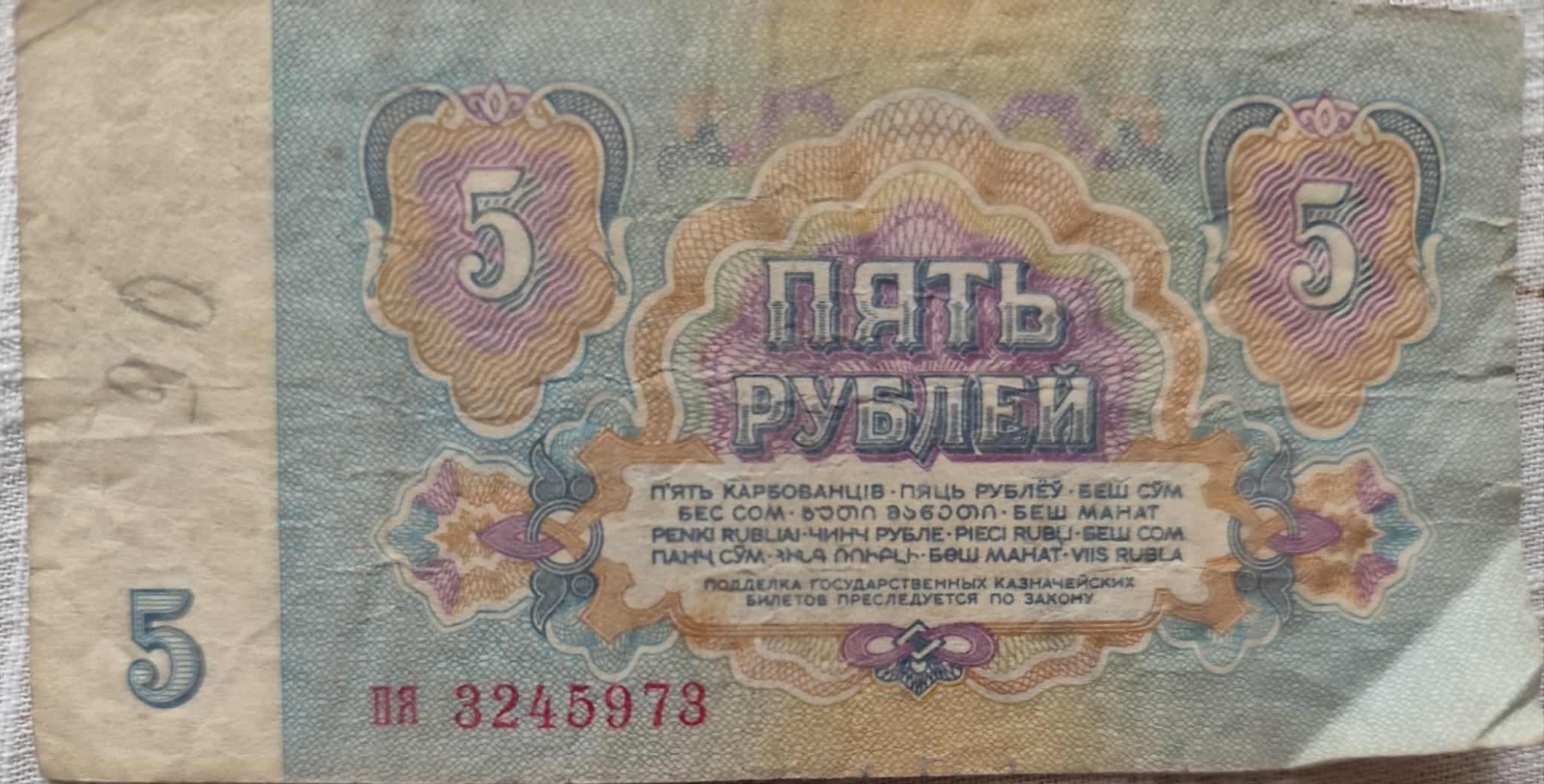 Bancnotă de formă dreptunghiulară cu nominalul de 5 ruble din URSS. Bancnota este predominant în nuanțe de albastru și verde deschis, cu un design central complex și elemente decorative pe margini. Pe aversul bancnotei, în partea superioară pe centru este scris ГОСУДАРСТВУННЫЙ КАЗНАЧЕСКИЙ БИЛЕТ СССР (Bilet al Trezoreriei de Stat a URSS), urmat de valoarea nominală 5. Valoarea nominală ПЯТЬ РУБЛЕЙ (Cinci ruble) este scrisă cu caractere chirilice mari, proeminente, în centrul bancnotei, pe un fundal stilizat care este un element decorativ complex sub forma unui nor. Sub acest text se află un ornament elaborat, care încorporează valoarea bancnotei cu litere ПЯТЬ (Cinci) în mijloc. În partea stîngă a bancnotei, unelement grafic proeminent este Turnul Spasskaia al Kremlinului din Moscova cu ceasul său distinctiv. Turnul este încadrat de copaci stilizați. Deasupra Turnului, în colțul din stînga sus, se află Stema de Stat a Uniunii Sovietice, care include secera și ciocanul , globul pămîntesc și spice de grîu, toate încadrate de o stea. Sub stemă și lîngă Turnul Spasskaia, este un text scris mic în care se specifică faptul că acest bilet este valabil în toate țările din cadrul URSS.și anul 1961. În colțurile de jos în stînga și în dreapta este cifra 5. Textul principal din centru este ПЯТЬ РУБЛЕЙ (Cinci ruble) scris cu caractere mari, , pe un fundal decorativ, cu detalii violet și roz. Sub textul central, valoarea bancnotei este repetată în cele 15 limbi aleUniunii Sovietice, reflectînd diversitatea lingvistică a republicilor unionale. Dedesubt este o avertizare în limba rusă ГОСУДАРСТВУННЫХ КАЗНАЧЕСКИХ БИЛЕТОВ ПРЕСЛЕДУЕТСЯ ПО ЗАКОНУ ( Falsificarea bancnotelor de stat este pedepsită prin lege). În partea stîngă jos cu culoarea roșie este scrisă seria bancnotei ГЛ 3935943, ПЯ 3245973, НЗ 0421753, ЧС 1646393, ЛЯ 6264462. Monedă de formă rotundă care pe revers are stema Uniunii Sovietice, formată dintr-o seceră și un ciocan, simboluri ale unității muncitorilor și țăranilor, așezate pe globul pământesc. În spatele globului se ridică un soare, iar totul este înconjurat de două spice de grâu legate la bază cu o panglică pe care scrie CCCP (abrevierea pentru Uniunea Republicilor Socialiste Sovietice, în rusă). Deasupra stemei se află o stea cu cinci colțuri. ​Pe aversul monedei sunt inscripționate valoarea nominală 10 , iar sub el scrie КОПЕЕК (Kopeek), care înseamnă copeici. Sub valoare este anul de emisiune: 1961. Toate aceste elemente sunt înconjurate de două spice de grâu.