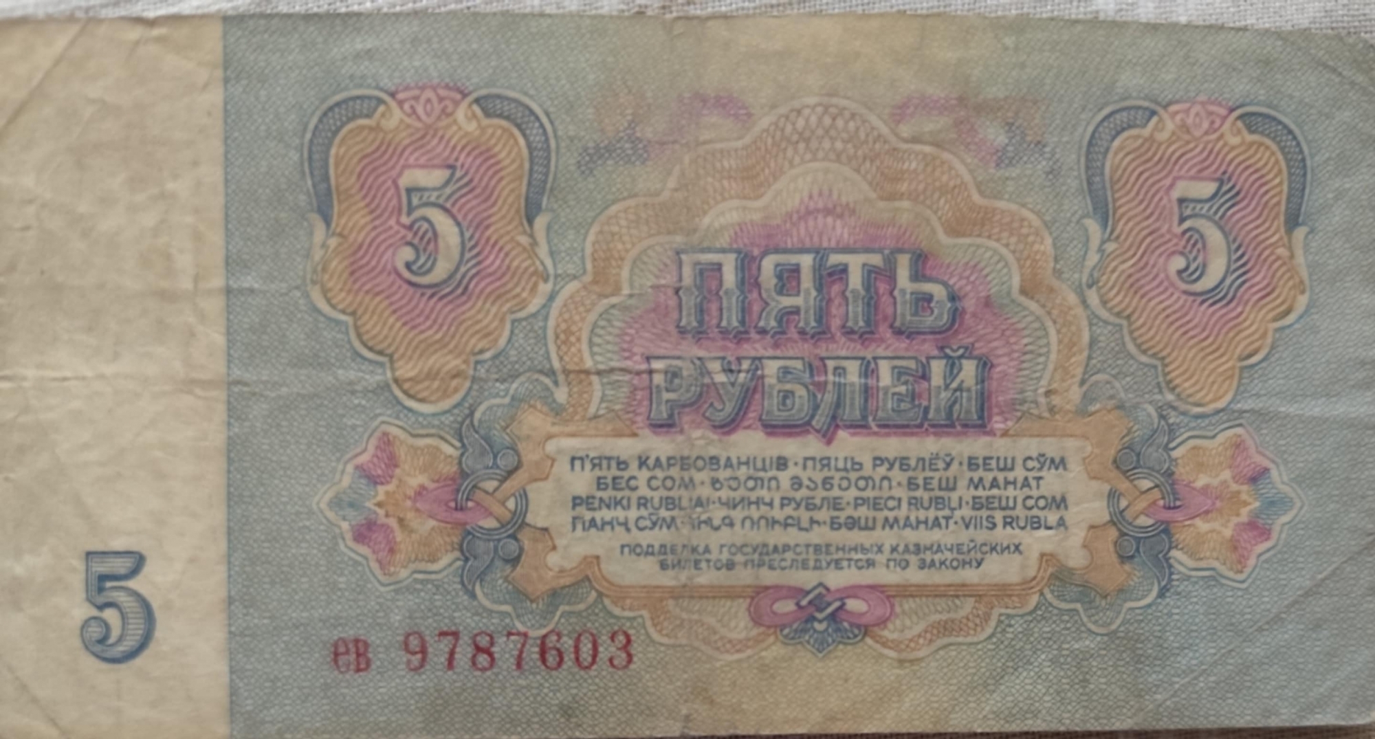 Bancnotă de formă dreptunghiulară cu nominalul de 5 ruble din URSS. Bancnota este predominant în nuanțe de albastru și verde deschis, cu un design central complex și elemente decorative pe margini. Pe aversul bancnotei, în partea superioară pe centru este scris ГОСУДАРСТВУННЫЙ КАЗНАЧЕСКИЙ БИЛЕТ СССР (Bilet al Trezoreriei de Stat a URSS), urmat de valoarea nominală 5. Valoarea nominală ПЯТЬ РУБЛЕЙ (Cinci ruble) este scrisă cu caractere chirilice mari, proeminente, în centrul bancnotei, pe un fundal stilizat care este un element decorativ complex sub forma unui nor. Sub acest text se află un ornament elaborat, care încorporează valoarea bancnotei cu litere ПЯТЬ (Cinci) în mijloc. În partea stîngă a bancnotei, unelement grafic proeminent este Turnul Spasskaia al Kremlinului din Moscova cu ceasul său distinctiv. Turnul este încadrat de copaci stilizați. Deasupra Turnului, în colțul din stînga sus, se află Stema de Stat a Uniunii Sovietice, care include secera și ciocanul , globul pămîntesc și spice de grîu, toate încadrate de o stea. Sub stemă și lîngă Turnul Spasskaia, este un text scris mic în care se specifică faptul că acest bilet este valabil în toate țările din cadrul URSS.și anul 1961. În colțurile de jos în stînga și în dreapta este cifra 5. Textul principal din centru este ПЯТЬ РУБЛЕЙ (Cinci ruble) scris cu caractere mari, , pe un fundal decorativ, cu detalii violet și roz. Sub textul central, valoarea bancnotei este repetată în cele 15 limbi aleUniunii Sovietice, reflectînd diversitatea lingvistică a republicilor unionale. Dedesubt este o avertizare în limba rusă ГОСУДАРСТВУННЫХ КАЗНАЧЕСКИХ БИЛЕТОВ ПРЕСЛЕДУЕТСЯ ПО ЗАКОНУ ( Falsificarea bancnotelor de stat este pedepsită prin lege). În partea stîngă jos cu culoarea roșie este scrisă seria bancnotelor МГ8334393, ЛЬ 1191743.