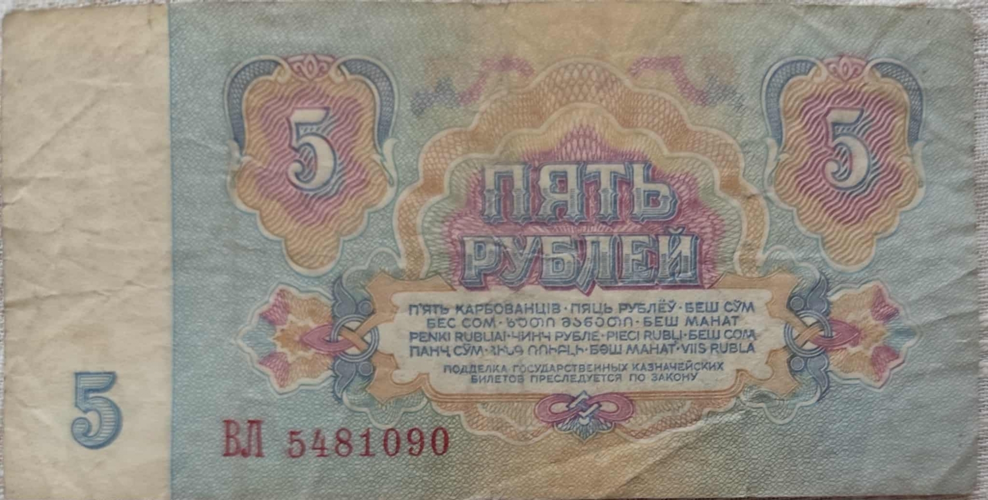 Bancnotă de formă dreptunghiulară cu nominalul de 5 ruble din URSS. Bancnota este predominant în nuanțe de albastru și verde deschis, cu un design central complex și elemente decorative pe margini. Pe aversul bancnotei, în partea superioară pe centru este scris ГОСУДАРСТВУННЫЙ КАЗНАЧЕСКИЙ БИЛЕТ СССР (Bilet al Trezoreriei de Stat a URSS), urmat de valoarea nominală 5. Valoarea nominală ПЯТЬ РУБЛЕЙ (Cinci ruble) este scrisă cu caractere chirilice mari, proeminente, în centrul bancnotei, pe un fundal stilizat care este un element decorativ complex sub forma unui nor. Sub acest text se află un ornament elaborat, care încorporează valoarea bancnotei cu litere ПЯТЬ (Cinci) în mijloc. În partea stîngă a bancnotei, unelement grafic proeminent este Turnul Spasskaia al Kremlinului din Moscova cu ceasul său distinctiv. Turnul este încadrat de copaci stilizați. Deasupra Turnului, în colțul din stînga sus, se află Stema de Stat a Uniunii Sovietice, care include secera și ciocanul , globul pămîntesc și spice de grîu, toate încadrate de o stea. Sub stemă și lîngă Turnul Spasskaia, este un text scris mic în care se specifică faptul că acest bilet este valabil în toate țările din cadrul URSS.și anul 1961. În colțurile de jos în stînga și în dreapta este cifra 5. Textul principal din centru este ПЯТЬ РУБЛЕЙ (Cinci ruble) scris cu caractere mari, , pe un fundal decorativ, cu detalii violet și roz. Sub textul central, valoarea bancnotei este repetată în cele 15 limbi aleUniunii Sovietice, reflectînd diversitatea lingvistică a republicilor unionale. Dedesubt este o avertizare în limba rusă ГОСУДАРСТВУННЫХ КАЗНАЧЕСКИХ БИЛЕТОВ ПРЕСЛЕДУЕТСЯ ПО ЗАКОНУ ( Falsificarea bancnotelor de stat este pedepsită prin lege). În partea stîngă jos cu culoarea roșie este scrisă seria bancnotei ВЛ 5481090.