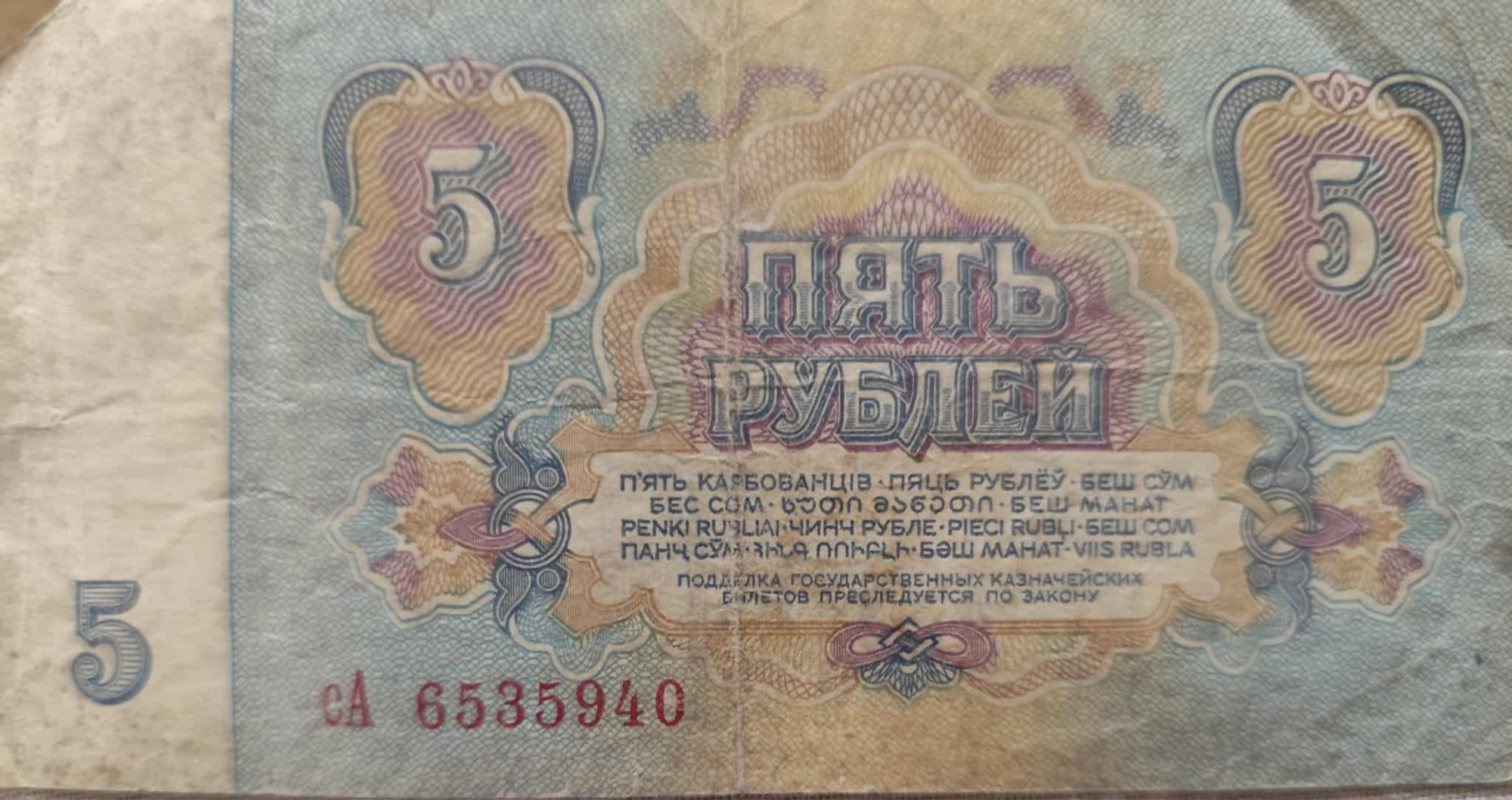 Bancnotă de formă dreptunghiulară cu nominalul de 5 ruble din URSS. Bancnota este predominant în nuanțe de albastru și verde deschis, cu un design central complex și elemente decorative pe margini. Pe aversul bancnotei, în partea superioară pe centru este scris ГОСУДАРСТВУННЫЙ КАЗНАЧЕСКИЙ БИЛЕТ СССР (Bilet al Trezoreriei de Stat a URSS), urmat de valoarea nominală 5. Valoarea nominală ПЯТЬ РУБЛЕЙ (Cinci ruble) este scrisă cu caractere chirilice mari, proeminente, în centrul bancnotei, pe un fundal stilizat care este un element decorativ complex sub forma unui nor. Sub acest text se află un ornament elaborat, care încorporează valoarea bancnotei cu litere ПЯТЬ (Cinci) în mijloc. În partea stîngă a bancnotei, unelement grafic proeminent este Turnul Spasskaia al Kremlinului din Moscova cu ceasul său distinctiv. Turnul este încadrat de copaci stilizați. Deasupra Turnului, în colțul din stînga sus, se află Stema de Stat a Uniunii Sovietice, care include secera și ciocanul , globul pămîntesc și spice de grîu, toate încadrate de o stea. Sub stemă și lîngă Turnul Spasskaia, este un text scris mic în care se specifică faptul că acest bilet este valabil în toate țările din cadrul URSS.și anul 1961. În colțurile de jos în stînga și în dreapta este cifra 5. Textul principal din centru este ПЯТЬ РУБЛЕЙ (Cinci ruble) scris cu caractere mari, , pe un fundal decorativ, cu detalii violet și roz. Sub textul central, valoarea bancnotei este repetată în cele 15 limbi aleUniunii Sovietice, reflectînd diversitatea lingvistică a republicilor unionale. Dedesubt este o avertizare în limba rusă ГОСУДАРСТВУННЫХ КАЗНАЧЕСКИХ БИЛЕТОВ ПРЕСЛЕДУЕТСЯ ПО ЗАКОНУ ( Falsificarea bancnotelor de stat este pedepsită prin lege). În partea stîngă jos cu culoarea roșie este scrisă seria bancnotei cA 6535940