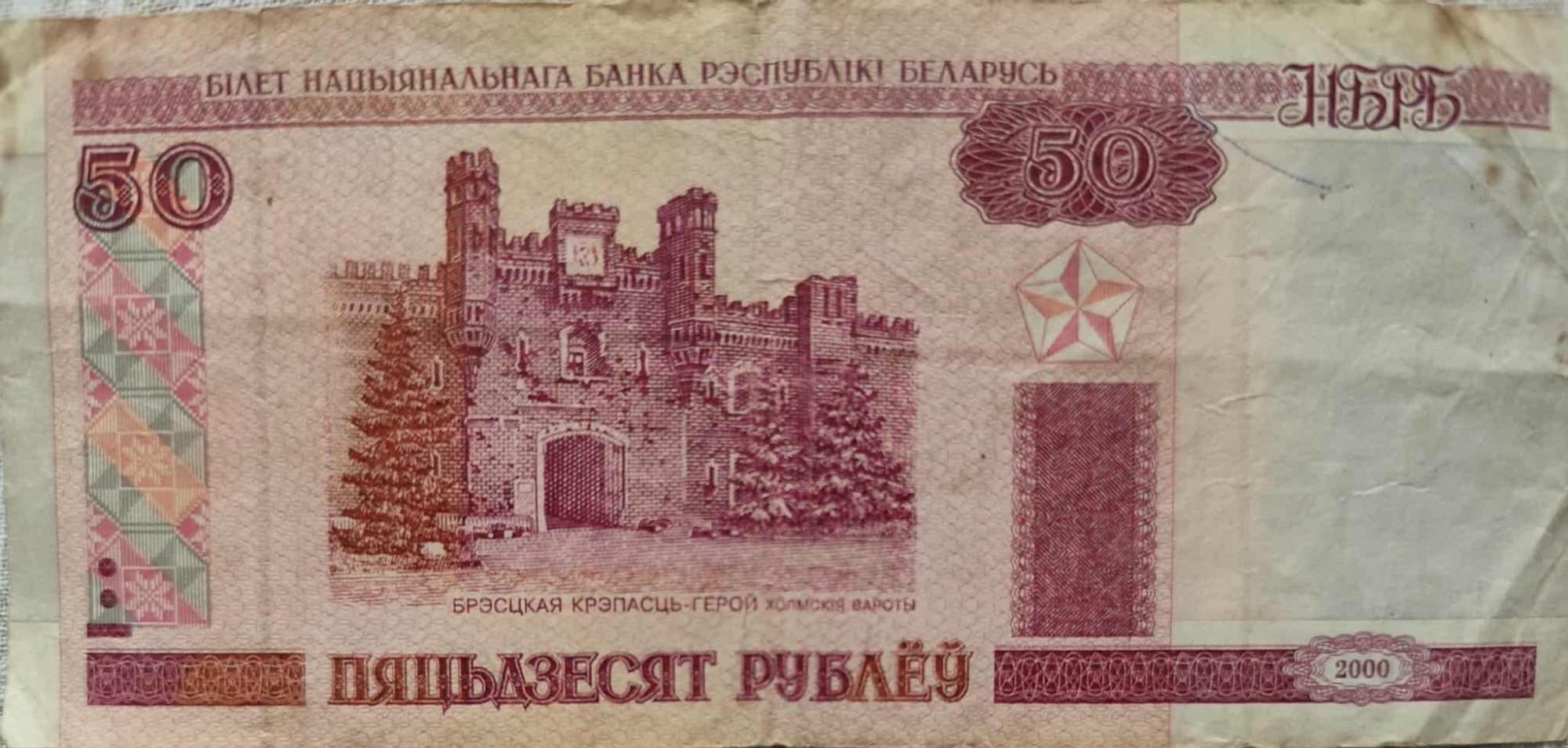 Bancnotă de formă dreptunghiulară cu valoarea nominală de 50 de ruble bieloruse emisă de Banca Națională a Republicii Belarus. P reversul bancnotei în partea de sus, textul "БІЛЕТ НАЦЫЯНАЛЬНАГА БАНКА РЭСПУБЛІКІ БЕЛАРУСЬ" (Bilet al Băncii Naționale a Republicii Belarus), iar valoarea nominală, "50", este afișată în colțul din stânga sus și în partea dreaptă, într-un design decorativ. Imaginea centrală prezintă poarta Holm a Cetății-Erou Brest ("БРЭСЦКАЯ КРЭПАСЦЬ-ГЕРОЙ ХОЛМСКІЯ ВАРОТЫ"), iar în partea de jos, valoarea nominală este scrisă cu litere: "ПЯЦЬДЗЕСЯТ РУБЛЁЎ" (Cincizeci de ruble). Anul emiterii, 2000, este vizibil în colțul din dreapta jos. Pe reversul bancnotei în partea de sus este indicată valoarea nominală cu litere "ПЯЦЬДЗЕСЯТ РУБЛЁЎ" (Cincizeci de ruble). Imaginea centrală înfățișează monumentul "Curajul" de la Cetatea-Erou Brest ("БРЭСЦКАЯ КРЭПАСЦЬ-ГЕРОЙ УВАХОД У МЕМАРЫЯЛ" - Intrarea în memorialul Cetății-Erou Brest). Acesta este o sculptură masivă, cu o stea înfățișând un soldat sovietic. Valoarea nominală, "50", este afișată în partea de jos a imaginii. Seria și numărul bancnotei ГЛ 1062658 apare în colțul din stânga jos și în colțul din dreapta sus.