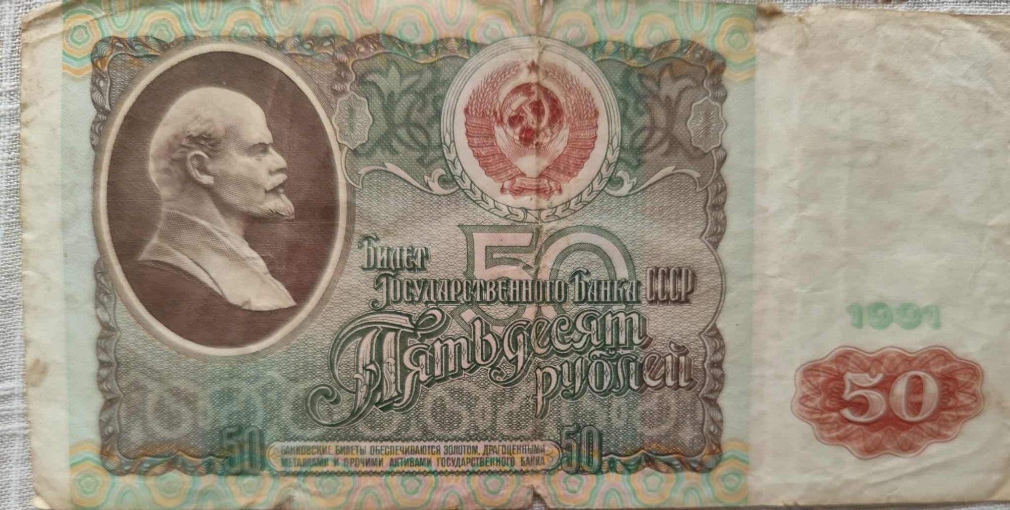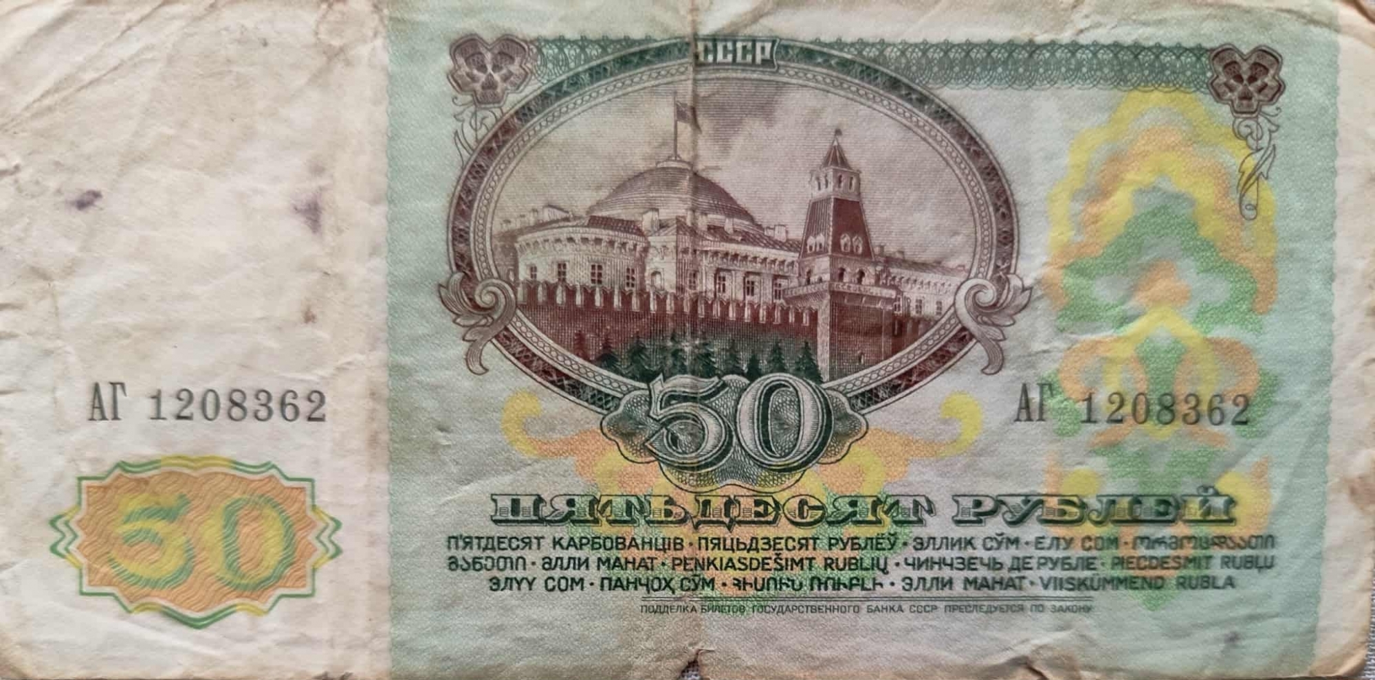 Bancnotă de formă dreptunghiulară cu valoarea nominală de 50 ruble. Pe aversul bancnotei este indicată valoare nominală: 50 ruble, scrisă atât cu cifre ("50"), cât și cu litere ("Пятьдесят рублей" - Cincizeci de ruble). Pe partea stângă a bancnotei se află portretul lui Vladimir Ilici Lenin, realizat într-un medalion circular. În partea de sus, central, este reprezentată stema URSS, cu secera și ciocanul pe globul pământesc, înconjurate de spice de grâu legate cu o panglică, deasupra cărora se află o stea. Sub stemă este scris : "Билет Государственного Банка СССР" (Bilet al Băncii de Stat a URSS), iar în partea de jos, se poate citi un text care menționează că bancnotele sunt asigurate cu aur și alte active ale Băncii de Stat: "БАНКОВСКИЕ БИЛЕТЫ ОБЕСПЕЧИВАЮТСЯ ЗОЛОТОМ, ДРАГОЦЕННЫМИ МЕТАЛЛАМИ И ПРОЧИМИ АКТИВАМИ ГОСУДАРСТВЕННОГО БАНКА" (Bancnotele sunt asigurate cu aur, metale prețioase și alte active ale Băncii de Stat). Pe partea dreaptă, într-un chenar decorativ, este repetată valoarea "50". Designul general al bancnotei include motive decorative de-a lungul marginilor și un fundal complex. Pe revers, în partea superioară, este inscripționat "CCCP". Imaginea centrală, încadrată într-un oval, este clădirea Senatului din Kremlin, Moscova. Sub imagine, este scris "ПЯТЬДЕСЯТ РУБЛЕЙ" (Cincizeci de ruble). În colțul din stânga sus și în partea de jos, apare cifra "50". În partea stângă, se observă anul "1992" și numărul de serie AГ 1208362. Designul este decorat cu motive florale subtile în colțuri și pe margini.