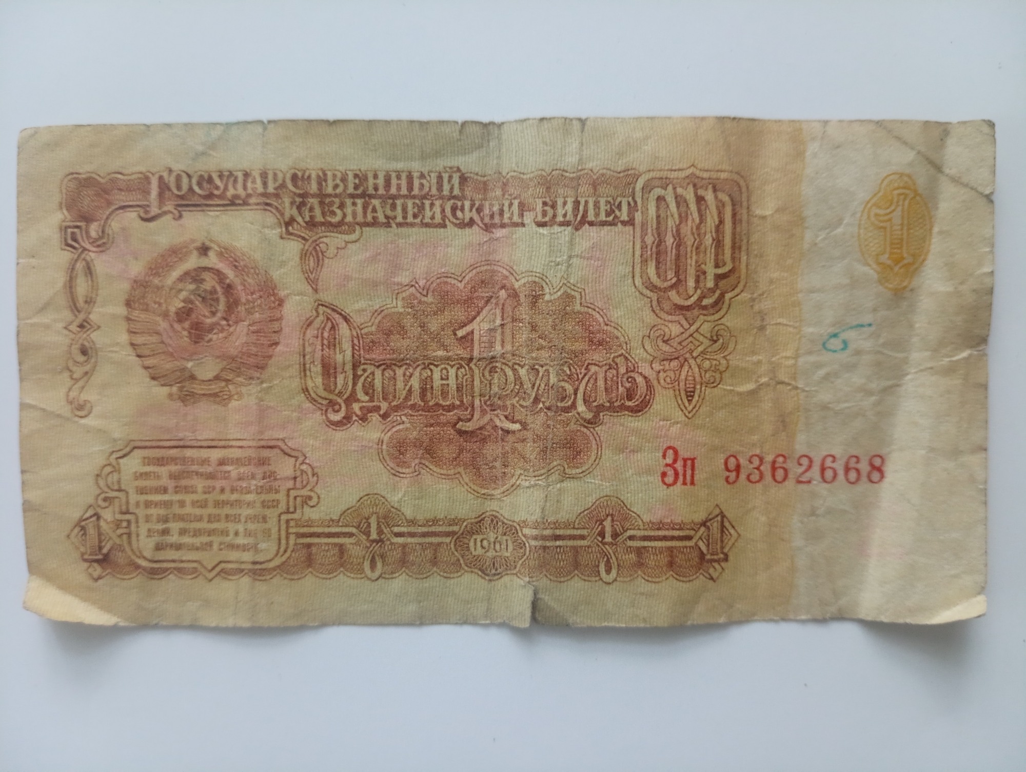 Bancnotă de formă dreptunghiulară cu nominalul de 1 rublă din URSS. Pe avers bancnota are un câmp alb îngust în dreapta, pe care este numărul „1” este reprezentat într-un chenar în partea de sus, restul spațiului fiind umplut cu un fundal care își schimbă ușor culoarea de la bej la verde deschis spre centru. În dreapta, fundalul se termină cu o linie ondulată. În mijloc există un chenar cu model care indică valoarea nominală - numărul „1”, peste care se află inscripția "Один рубль" (O rublă). În stânga se află stema URSS din 1956 cu 15 benzi panglică. În partea de sus a bancnotei există un ornament sub forma literei "П" („P”) cu inscripția pe două rânduri "Государственный казначейский билет" („Bilet de Trezorerie a Statului”), cele două cuvinte de jos sunt deplasate spre dreapta. În partea dreaptă a ornamentului superior se află o ramă cu literele "СССР" („URSS”) suprapuse. În partea inferioară se află un ornament orizontal cu patru cifre „1”, iar în mijloc se află o rozetă ghiloșată cu data „1961”. În stânga jos există un chenar cu 7 rânduri de text: "ГОСУДАРСТВЕННЫЕ КАЗНАЧЕЙСКИЕ БИЛЕТЫ ОБЕСПЕЧИВАЮТСЯ ВСЕМ ДОС- ТОЯНИЕМ СОЮЗА ССР И ОБЯЗАТЕЛЬНЫ К ПРИЕМУ НА ВСЕЙ ТЕРРИТОРИИ СССР ВО ВСЕ ПЛАТЕЖИ ДЛЯ ВСЕХ УЧРЕЖ- ДЕНИЙ, ПРЕДПРИЯТИЙ И ЛИЦ ПО НАРИЦАТЕЛЬНОЙ СТОИМОСТИ" („BUNURILE DE TREZORERIE DE STAT SUNT SUSȚINUTE DIN TOATE ACTIVELE URSS ȘI SUNT OBLIGATORII PENTRU ACCEPTARE PE ÎNTREGUL TERITORIU AL URSS PENTRU TOATE PLĂȚILE PENTRU TOATE INSTITUȚIILE, ÎNTREPRINDERILE ȘI PERSOANELE LA VALOAREA LOR NOMINALĂ”). Pe partea dreaptă a bancnotei, seria și numărul Зп 9362668 sunt indicate cu vopsea roșie. Artistul aversului este S. A. Pomansky.