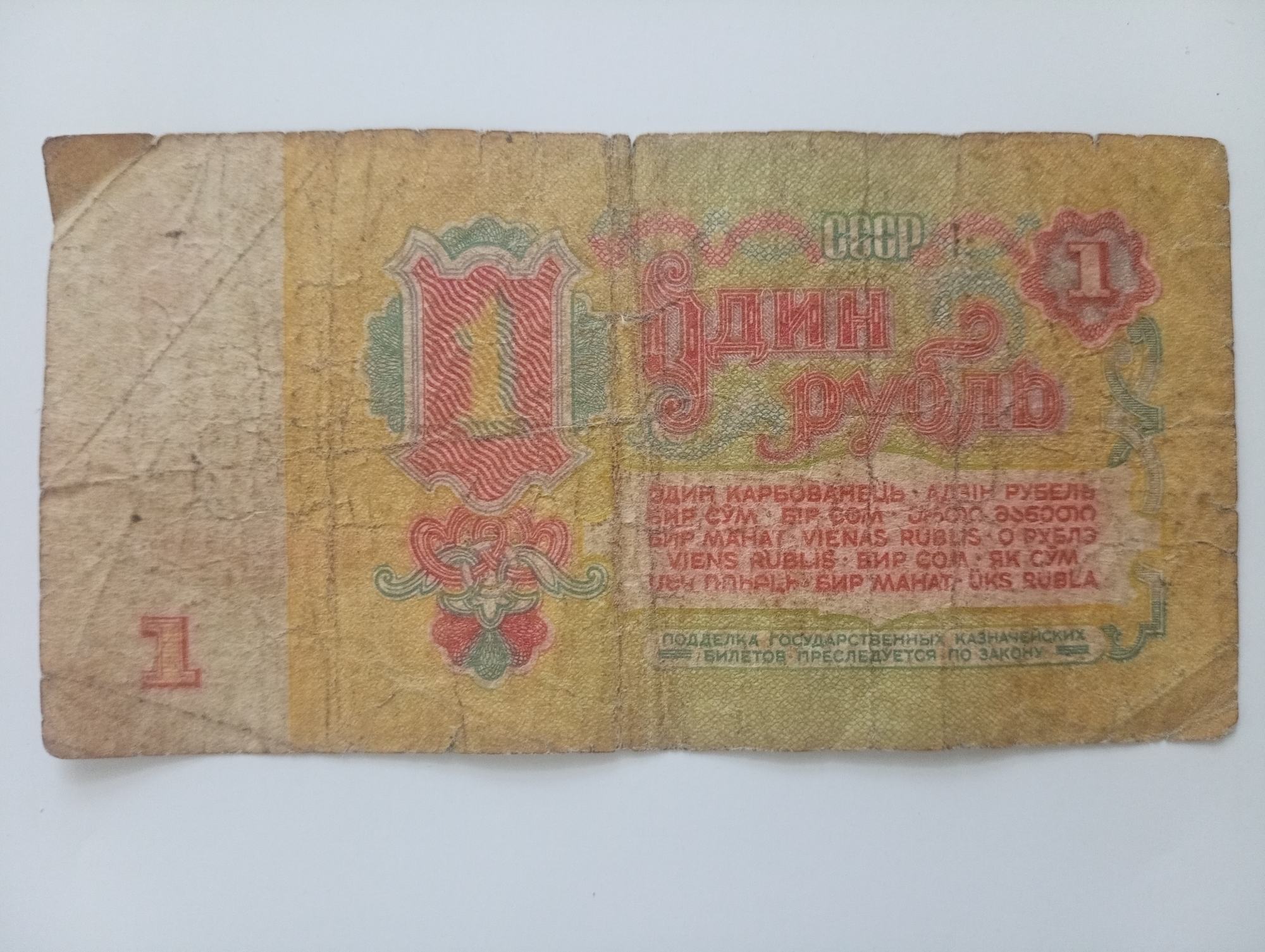 Pe revers, are un câmp alb îngust în stânga cu numărul „1” în partea de jos, restul spațiului este umplut cu un fundal care își schimbă culoarea de la bej la verde deschis spre centru. În mijloc, denominația este scrisă în cuvinte pe două rânduri - "ОДИН РУБЛЬ" („O RUBLA”), al doilea cuvânt este mutat la dreapta. Mai sus, într-un model de linii împletite, se află inscripția "СССР" („URSS”), iar în dreapta sus se află o rozetă ghiloșată cu numărul „1”. Sub denumire există un cadru care indică denumirea în 14 limbi ale celorlalte republici unionale (ucraineană, belarusă, uzbecă, kazahă, georgiană, azeră, lituaniană, moldovenească, letonă, kirghiză, tadjică, armeană, turkmenă și estonă). În partea de jos se află o ramă ovală cu o inscripție pe două rânduri: "ПОДДЕЛКА ГОСУДАРСТВЕННЫХ КАЗНАЧЕЙСКИХ БИЛЕТОВ ПРЕСЛЕДУЕТСЯ ПО ЗАКОНУ"(„FALSIFICAREA BULETINELOR DE TREZORERIE DE STAT ESTE URMĂRITĂ PRIN LEGE”).