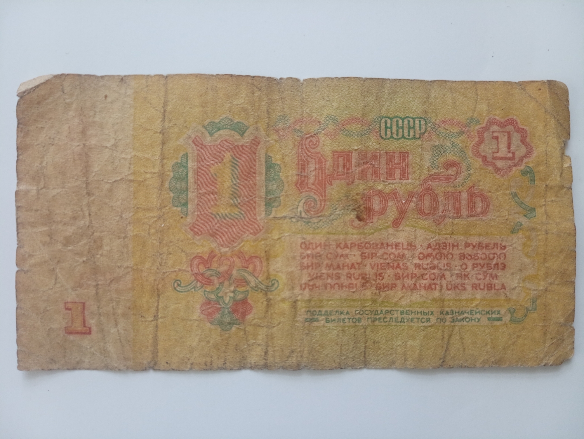 Pe revers, are un câmp alb îngust în stânga cu numărul „1” în partea de jos, restul spațiului este umplut cu un fundal care își schimbă culoarea de la bej la verde deschis spre centru. În mijloc, denominația este scrisă în cuvinte pe două rânduri - "ОДИН РУБЛЬ" („O RUBLA”), al doilea cuvânt este mutat la dreapta. Mai sus, într-un model de linii împletite, se află inscripția "СССР" („URSS”), iar în dreapta sus se află o rozetă ghiloșată cu numărul „1”. Sub denumire există un cadru care indică denumirea în 14 limbi ale celorlalte republici unionale (ucraineană, belarusă, uzbecă, kazahă, georgiană, azeră, lituaniană, moldovenească, letonă, kirghiză, tadjică, armeană, turkmenă și estonă). În partea de jos se află o ramă ovală cu o inscripție pe două rânduri: "ПОДДЕЛКА ГОСУДАРСТВЕННЫХ КАЗНАЧЕЙСКИХ БИЛЕТОВ ПРЕСЛЕДУЕТСЯ ПО ЗАКОНУ"(„FALSIFICAREA BULETINELOR DE TREZORERIE DE STAT ESTE URMĂRITĂ PRIN LEGE”).