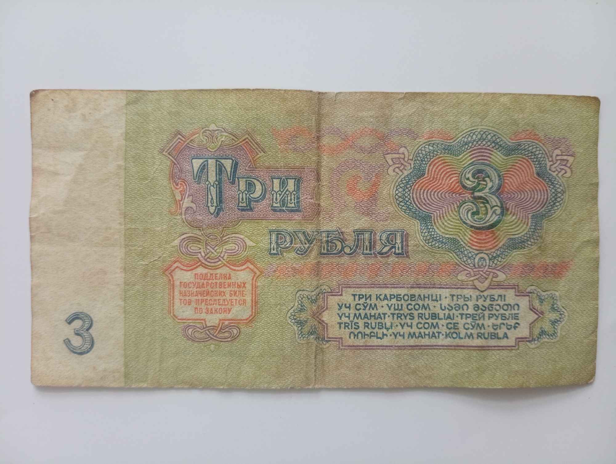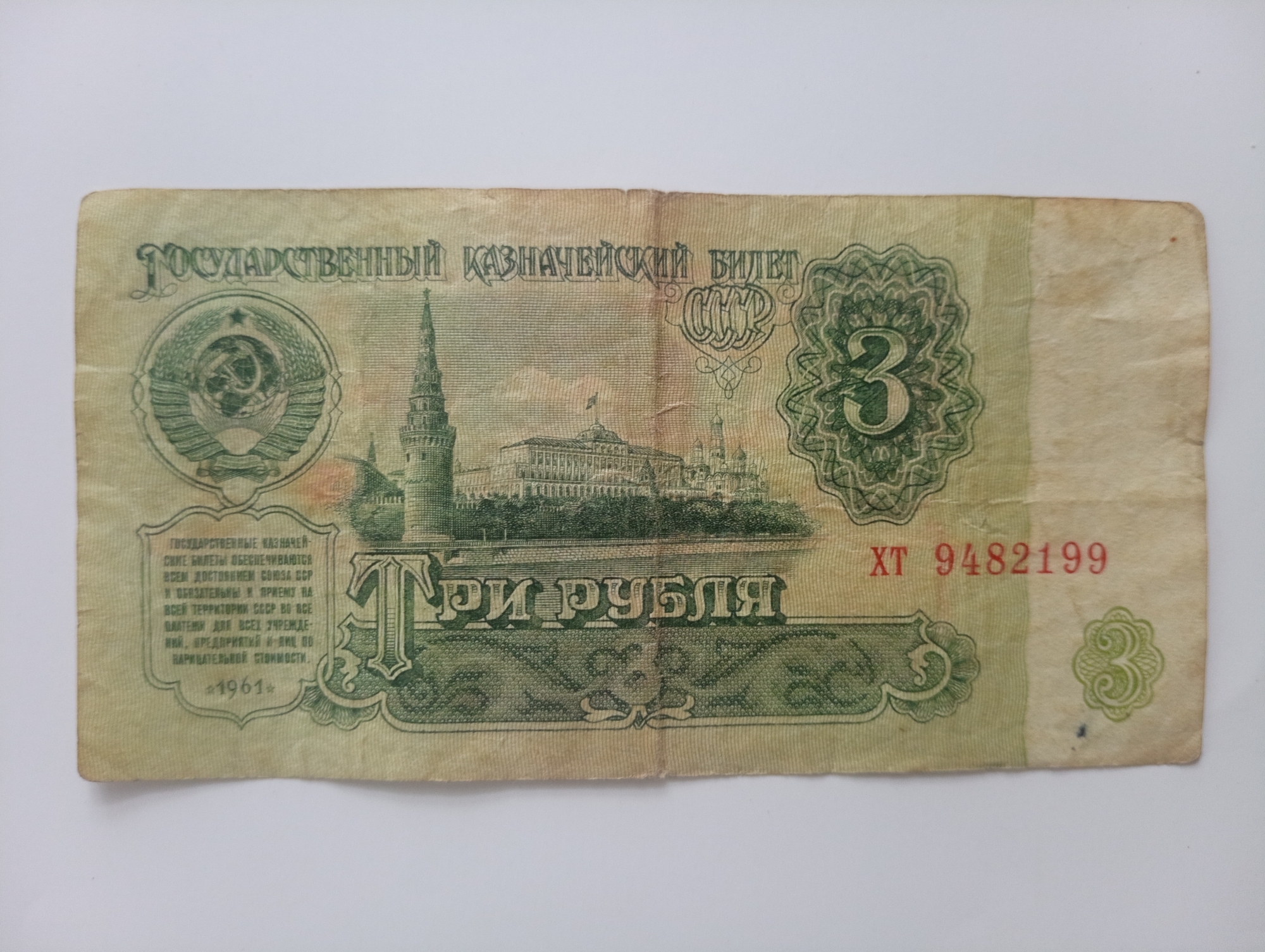Bancnotele de acest tip au fost introduse în circulație în timpul reformei monetare din 1 ianuarie 1961 și au fost mijlocul oficial de plată până la sfârșitul anului 1993. Au fost emise până în 1991, iar toate aveau data „1961”. Bancnotă de formă dreptunghiulară cu nominalul de 3 ruble din URSS. Pe avers bancnota are un câmp alb îngust în dreapta, pe care numărul „3” este reprezentat într-un cadru în partea de jos, restul spațiului fiind umplut cu un fundal care își schimbă ușor culoarea de la verde deschis la gri deschis spre centru. În dreapta, fundalul se termină cu o linie ondulată. În mijloc se află o gravură care înfățișează Kremlinul Moscovei (Turnul Vodovzvodnaya, Marele Palat Kremlin, Turnul cu Clopotniță al lui Ivan cel Mare și mai multe biserici). În partea de sus se află o inscripție orizontală - „Bon de trezorerie de stat”, în dreapta sub inscripție se află un model cu literele "СССР" („URSS”). În partea dreaptă se află o rozetă mare ghiloșată cu numărul „3”. Sub gravură se află valoarea nominală - "Три рубля" („Trei ruble”), iar mai jos este un cadru cu un model și numărul „3”. În stânga sus se află stema URSS din 1956 cu 15 benzi panglică. Sub stemă se află un chenar cu textul pe 8 rânduri: "ГОСУДАРСТВЕННЫЕ КАЗНАЧЕЙСКИЕ БИЛЕТЫ ОБЕСПЕЧИВАЮТСЯ ВСЕМ ДОСТОЯНИЕМ СОЮЗА ССР И ОБЯЗАТЕЛЬНЫ К ПРИЕМУ НА ВСЕЙ ТЕРРИТОРИИ СССР ВО ВСЕ ПЛАТЕЖИ ДЛЯ ВСЕХ УЧРЕЖДЕНИЙ, ПРЕДПРИЯТИЙ И ЛИЦ ПО НАРИЦАТЕЛЬНОЙ СТОИМОСТИ" („BONUL TREZORERIEI DE STAT SUNT SUSȚINUT DIN ÎNTREAGA PROPRIETATE A URSS ȘI SUNT OBLIGATORIU PENTRU ACCEPTARE PE ÎNTREGUL TERITORIU AL URSS PENTRU TOATE PLĂȚILE PENTRU TOATE INSTITUȚIILE, ÎNTREPRINDERILE ȘI PERSOANELE FIZICE LA VALOAREA LOR NOMINALĂ”) și data „1961” între două stele cu cinci colțuri. Pe partea dreaptă a bancnotei, seria și numărul XT 9482199 sunt indicate cu vopsea roșie. Artistul aversului este S. A. Pomansky. Pe revers are un câmp alb îngust în stânga cu numărul „3” în partea de jos, restul spațiului este umplut cu un fundal care își schimbă culoarea de la verde deschis la gri spre centru. În partea centrală a fundalului există un model bicolor, sub care se află o linie orizontală colorată. În mijloc (mai aproape de marginea din stânga sus) valoarea nominală este scrisă în cuvinte pe două rânduri - "Три рубля" („Trei ruble”), al doilea cuvânt este mutat spre dreapta, cuvântul "Три" („Trei”) este încadrat. În dreapta sus, într-o rozetă ghiloșată, este reprezentat numărul „3”; sub rozetă, există un cadru figurat care indică denominația în 14 limbi ale republicilor unionale rămase (ucraineană, belarusă, uzbecă, kazahă, georgiană, azeră, lituaniană, moldovenească, letonă, kirghiză, tadjică, armeană, turkmenă și estonă). În partea stângă, într-un alt chenar, există o inscripție pe 5 rânduri: "ПОДДЕЛКА ГОСУДАРСТВЕННЫХ КАЗНАЧЕЙСКИХ БИЛЕ- ТОВ ПРЕСЛЕДУЕТСЯ ПО ЗАКОНУ („FRAUDA CU LEGILE DE TREZORERIE DE STAT ESTE URMĂRITĂ PRIN LEGE”). Artistul reversului: I.I. Dubasov. Designul bancnotei este realizat în culorile verde, verde deschis, gri deschis, roșu și portocaliu.