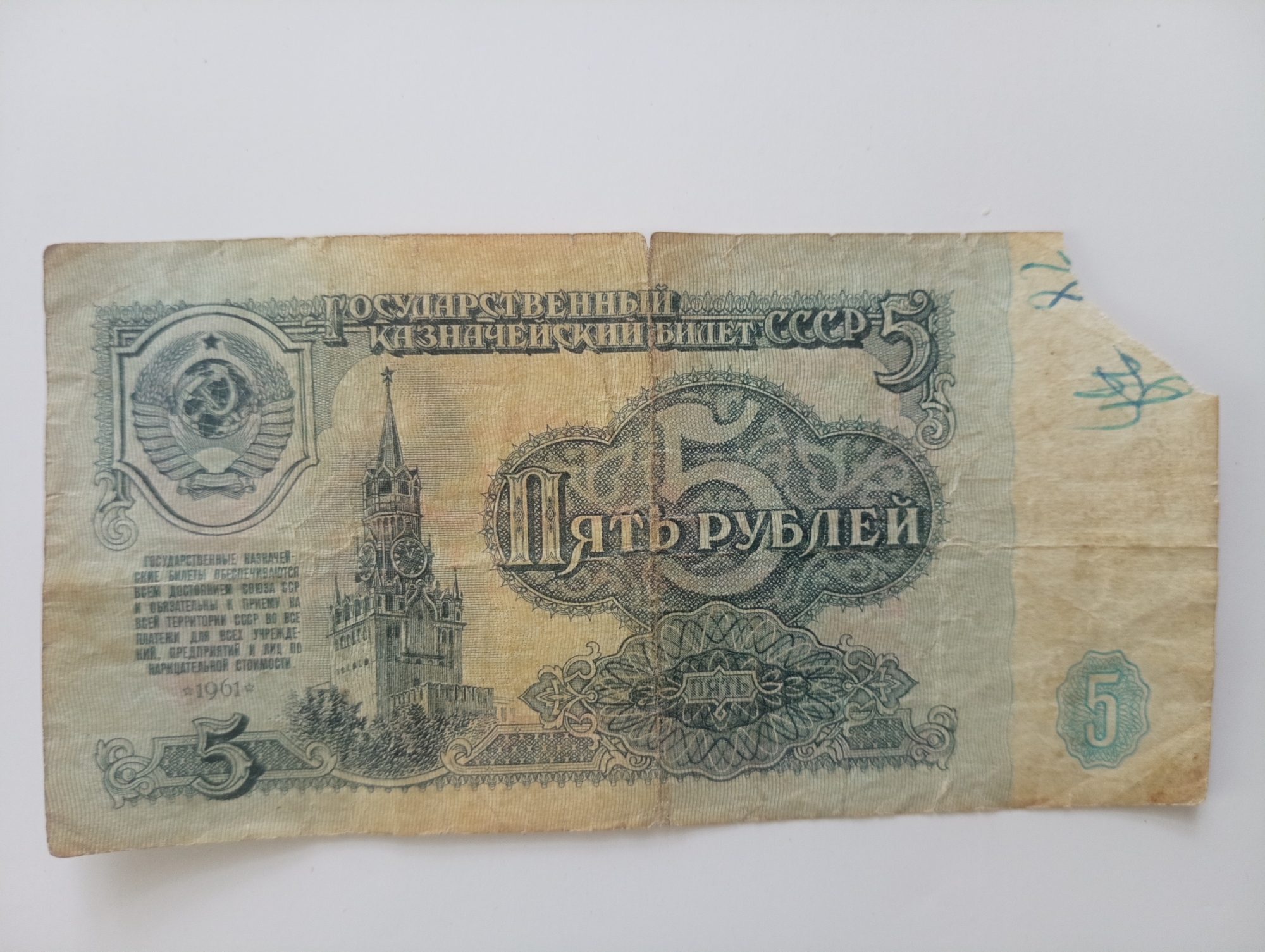 Sub denumire există un cadru figurat cu denumirea indicată în 14 limbi ale celorlalte republici unionale (ucraineană, belarusă, uzbecă, kazahă, georgiană, azeră, lituaniană, moldovenească, letonă, kirghiză, tadjică, armeană, turkmenă și estonă), iar mai jos există o inscripție cu font mai mic, pe două rânduri:"ПОДДЕЛКА ГОСУДАРСТВЕННЫХ КАЗНАЧЕЙСКИХ БИЛЕТОВ ПРЕСЛЕДУЕТСЯ ПО ЗАКОНУ" („FALSIFICAREA BULETINELOR DE TREZORERIE DE STAT ESTE PEDEPSITĂ DE LEGE”). În colțurile superioare ale părții colorate a bancnotei există două rozete cu numerele „5”. În stânga jos, cu vopsea roșie, sunt indicate seria și numărul bancnotei - бс 5489303. Artistul reversului este I. I. Dubasov.