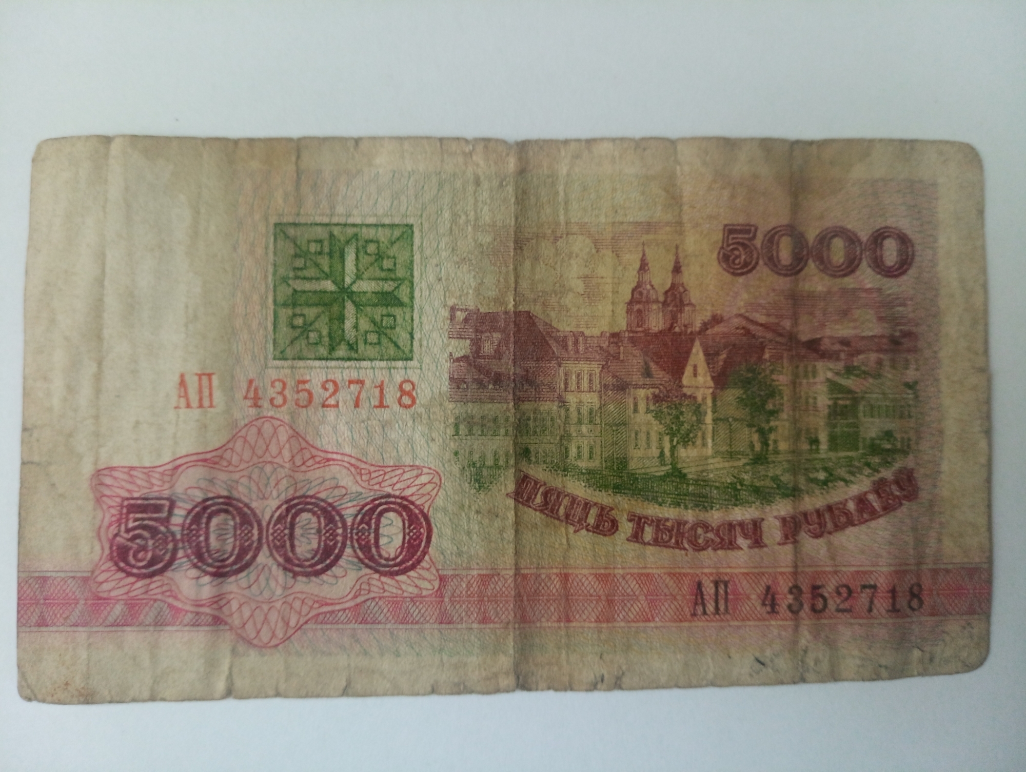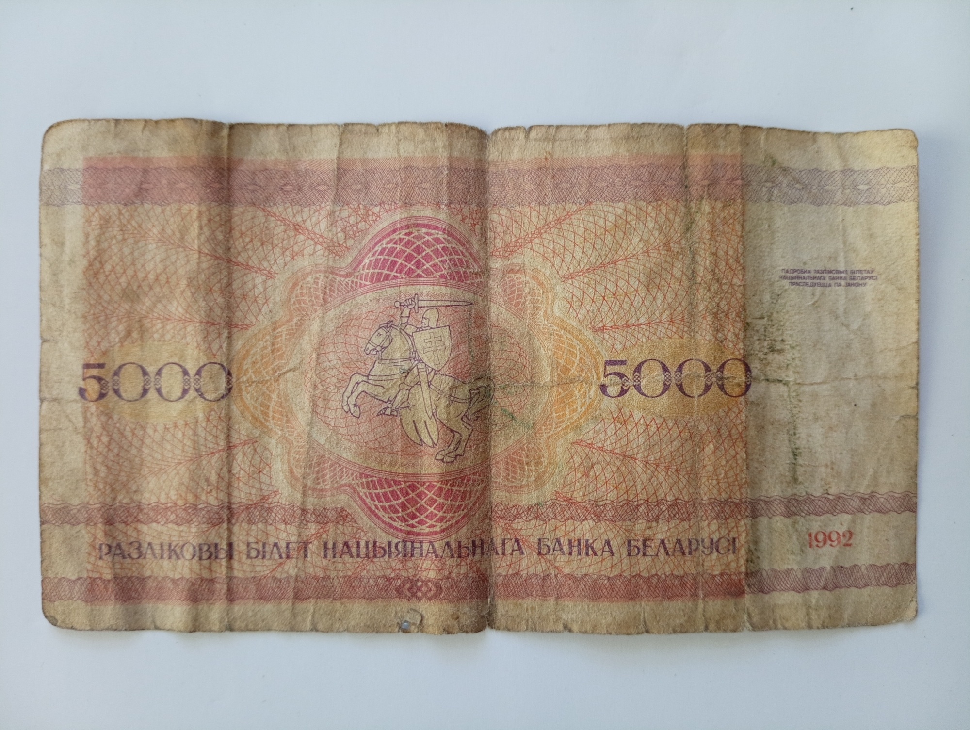 Bancnotă de formă dreptunghiulară cu nominalul de 5000 ruble, din modelul din 1992, emisă de Banca Națională a Belarusiei.