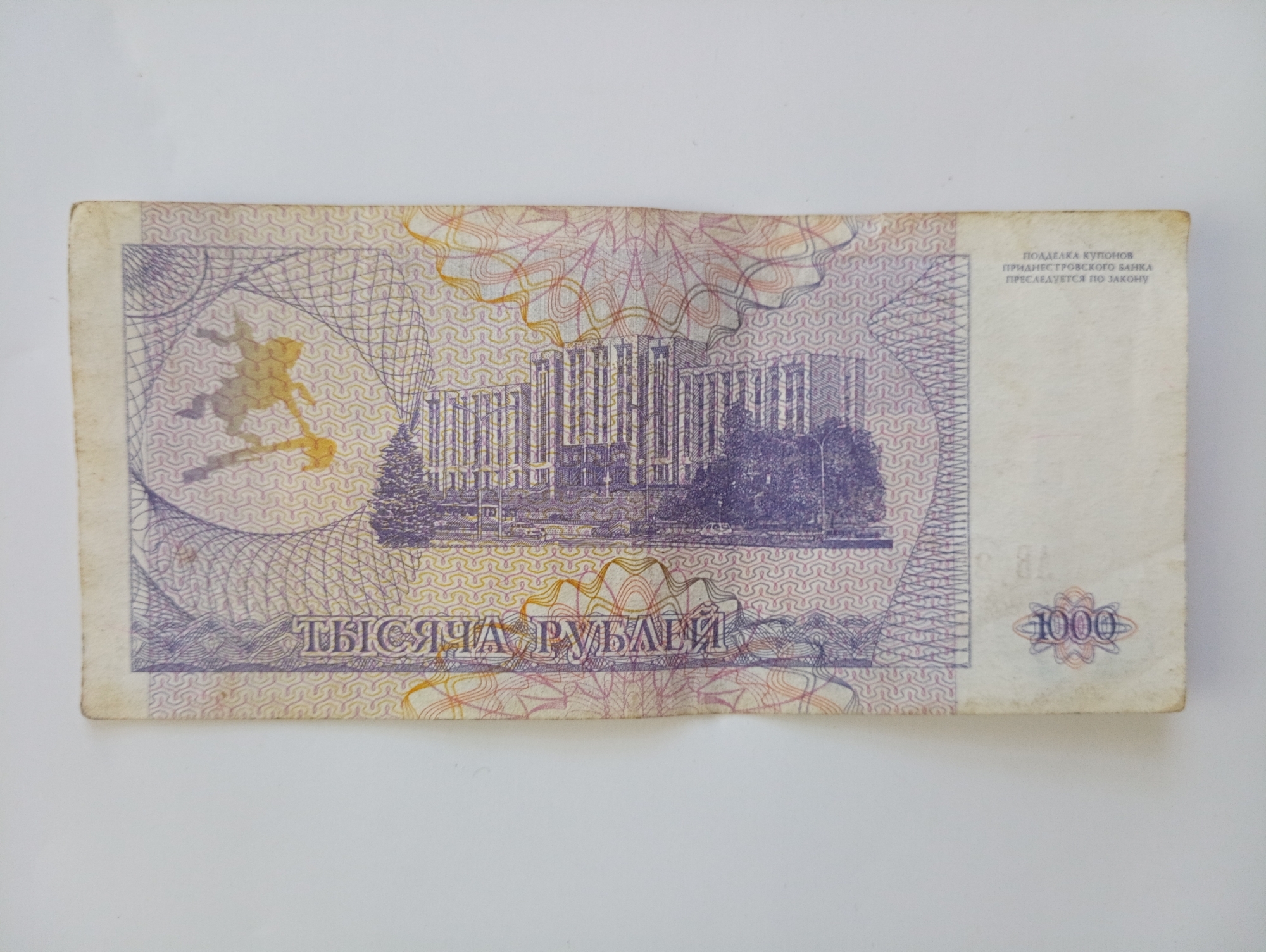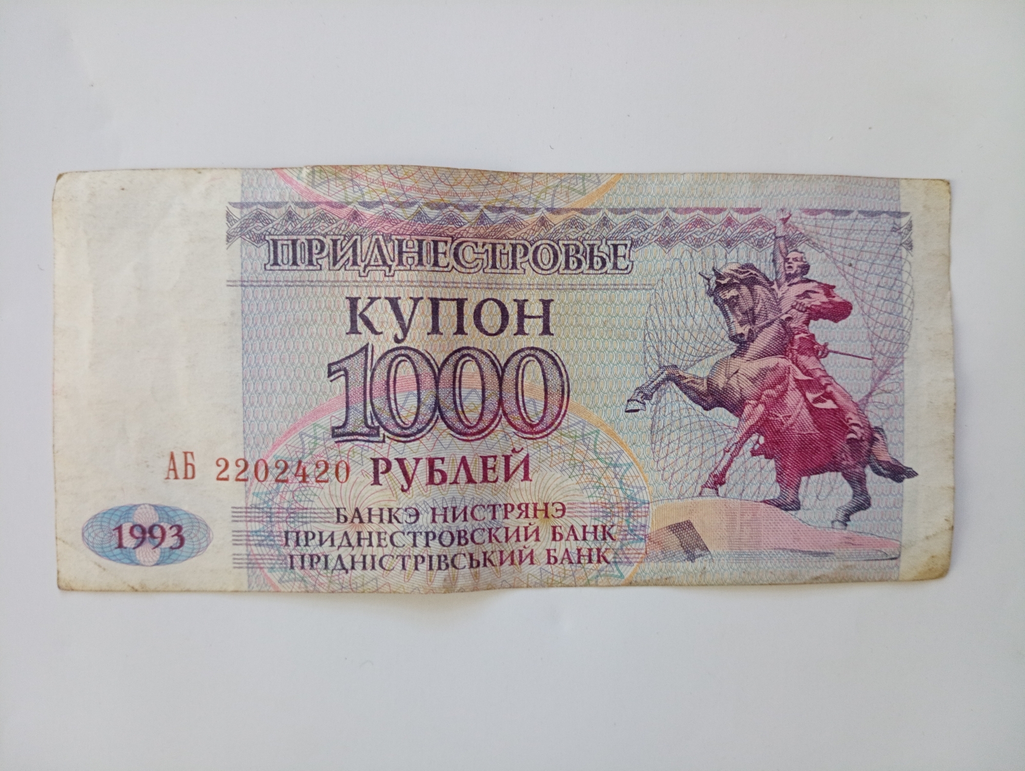 Bancnotă de formă dreptunghiulară cu nominalul de 1000 cupoane, emisă de Banca Națională a Prednistroviei. Cuponul a fost unitatea monetară emisă din 1990.