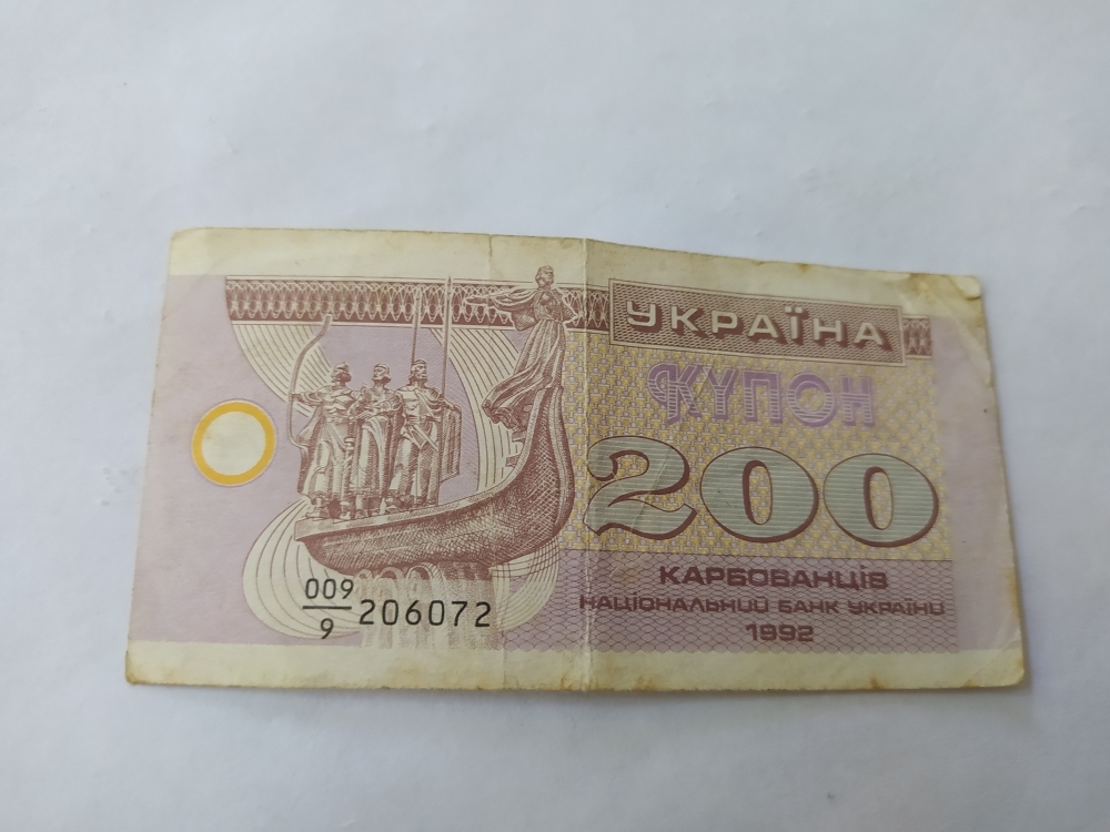 купюра- 200 купона ,Украина,1992г.ода выпуска , серийный номер 206072 . Купюра - это бумажный денежный знак определенного достоинства, используемый в качестве средства платежа. Для данной купюры , для печати использовали специальную бумагу ,изготовлена из хлопковых волокон ,что обеспечивало ей прочность и устойчивость к износу.