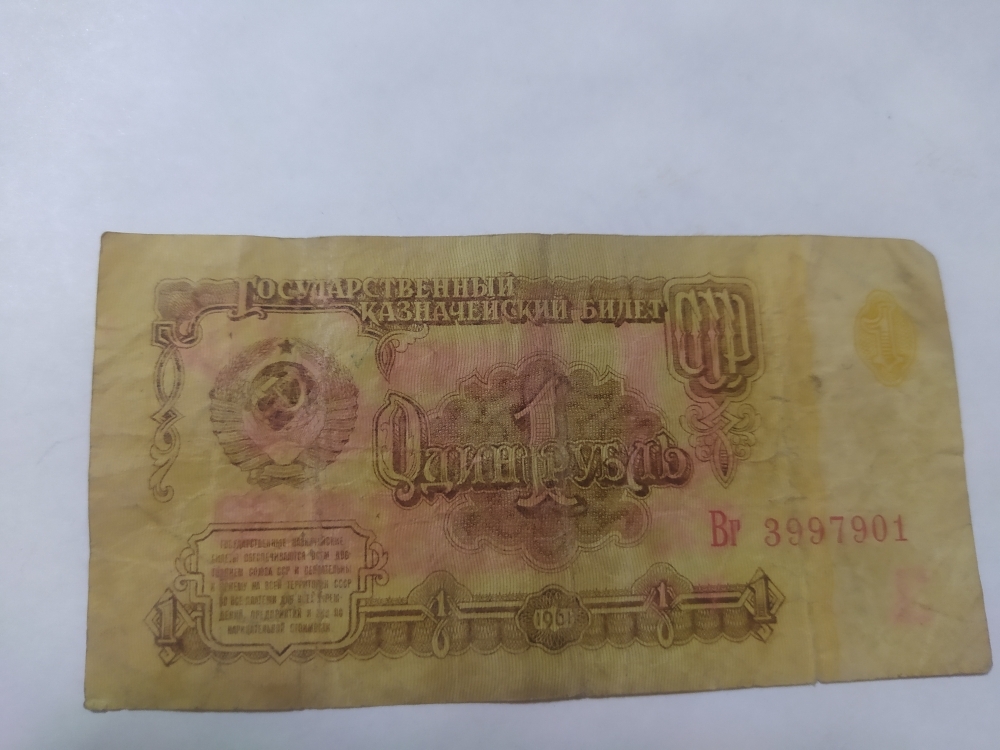 купюра -1 Рубль , серийный номер BR3997901,СССР 1961 года выпуска. Купюра - это бумажный денежный знак определенного достоинства, используемый в качестве средства платежа. Банкнота — это вид денежного знака, печатный документ определенного номинала, выпускаемый центральным банком страны и имеющий обязательную платежную силу на её территории. Данная банкнота производилась на специализированных предприятиях Гознака, для печати использовали специальную бумагу ,изготовлена из хлопковых волокон ,что обеспечивало ей прочность и устойчивость к износу.