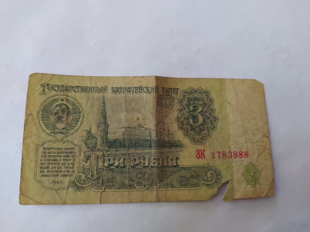 Купюра-3 рубля,1961года выпуска ,ЗК 1783888. Номинал-банкнота 3 рубля СССР — это денежная купюра, выпущенная в Советском Союзе, номиналом в три рубля. Банкнота — это вид денежного знака, печатный документ определенного номинала, выпускаемый центральным банком страны и имеющий обязательную платежную силу на её территории. Данная банкнота производилась на специализированных предприятиях Гознака, главным образом в Москве и Ленинграде , для печати использовали специальную бумагу ,изготовлена из хлопковых волокон ,что обеспечивало ей прочность и устойчивость к износу.